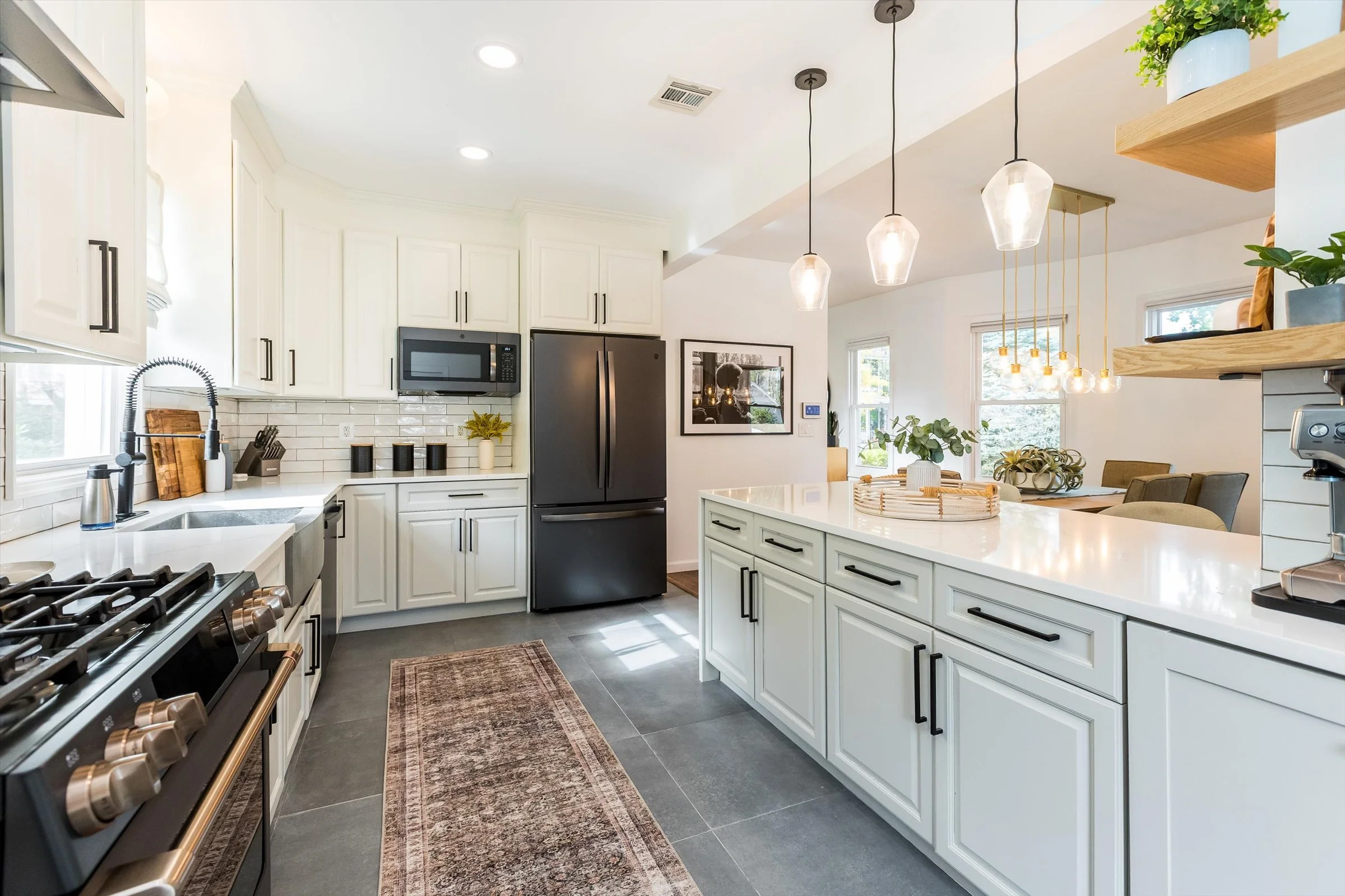 The newly renovated kitchen with a ton of counter space and a really functional peninsula with waterfall edge