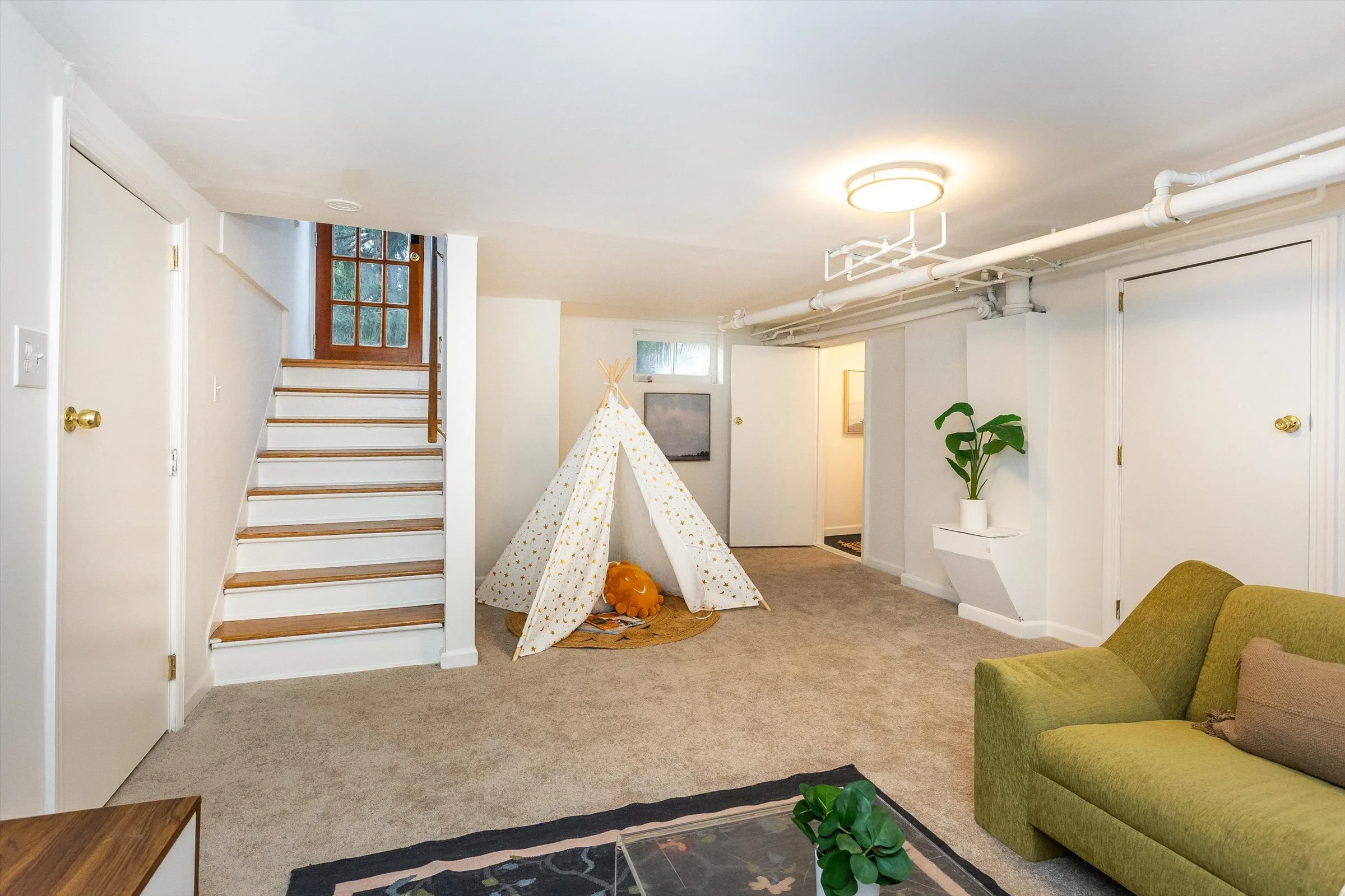 The partially finished basement. Carpeted and comfortable, it has served as a playroom, game room, home office, and remote classroom. With a half bath, an exterior exit, and easy access from the kitchen, it’s an incredibly flexible space for family life.
