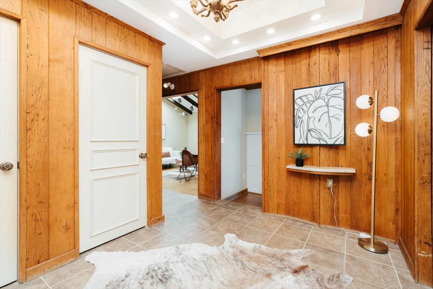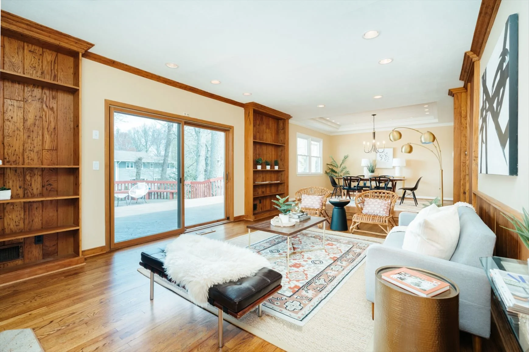 This sprawling sunken living room is graced with beautiful custom wall and ceilling moldings that elevate and warm the space. The large built-ins provide storage space along with the perfect location to display your favorite pieces and collections. Enjoy gathering around the cozy gas fireplace that offers charm and warmth on those cold winter nights. With easy access to the large beck deck, indoor and outdoor living flow seamlessly and allow for ease of living.