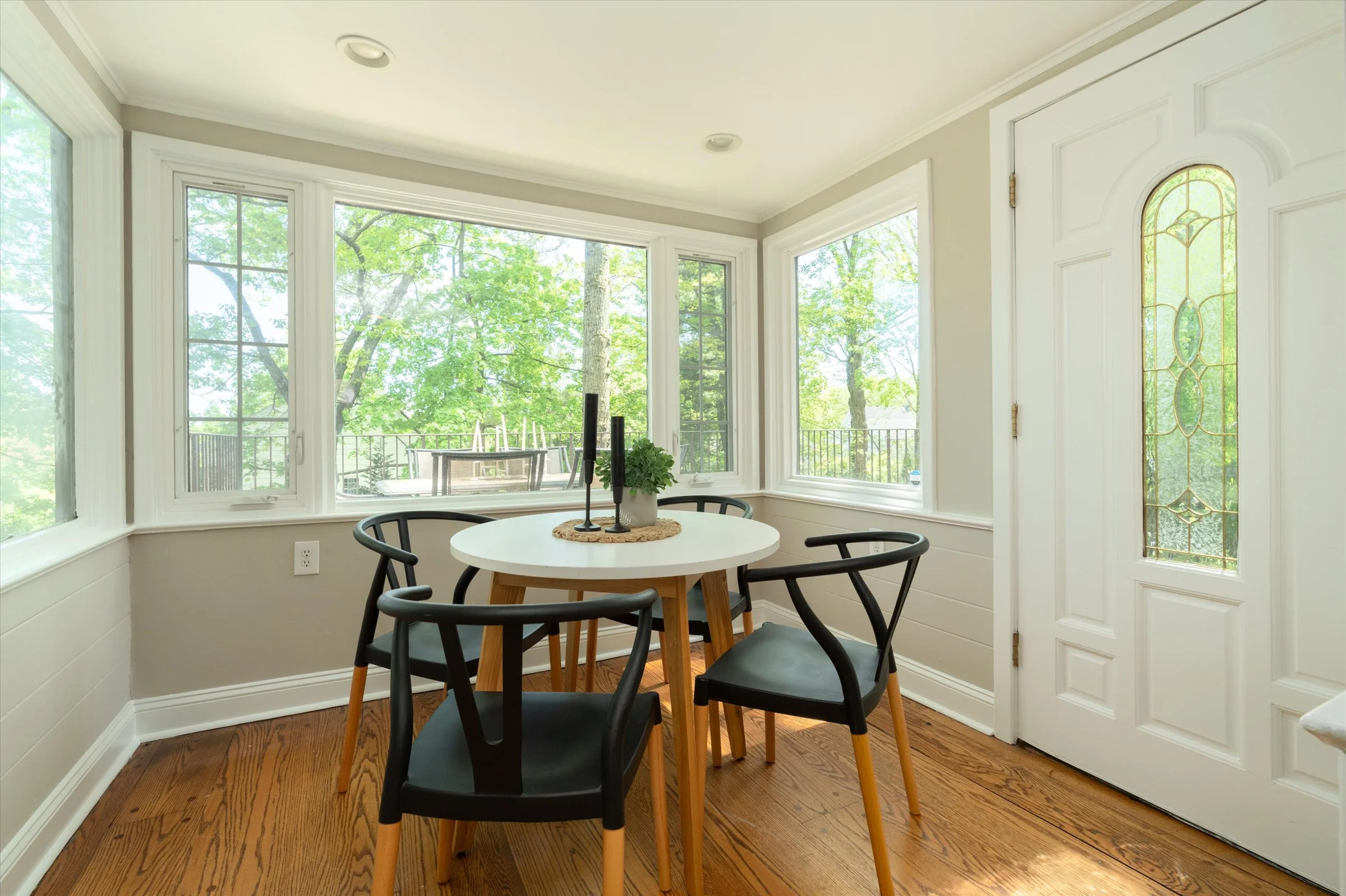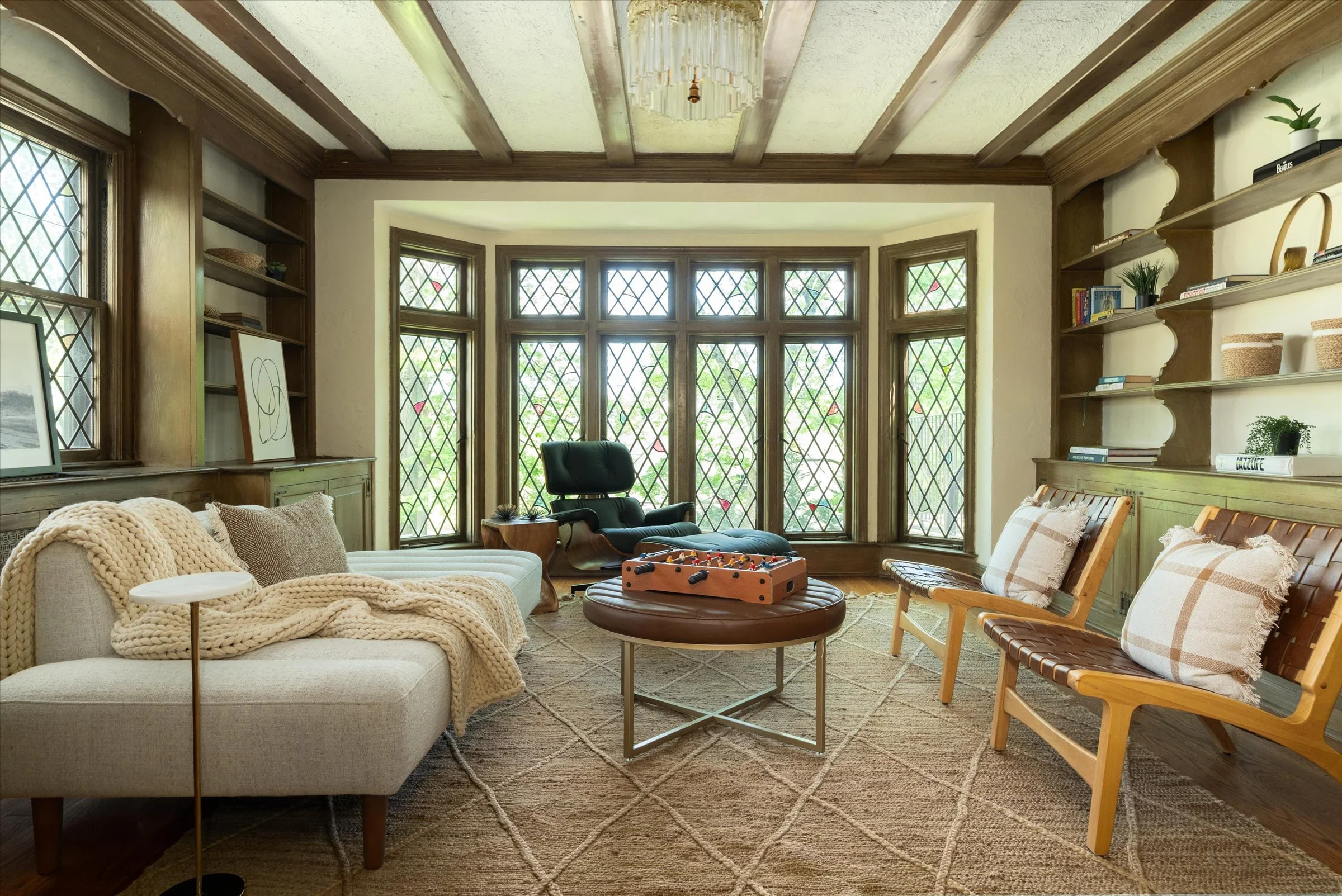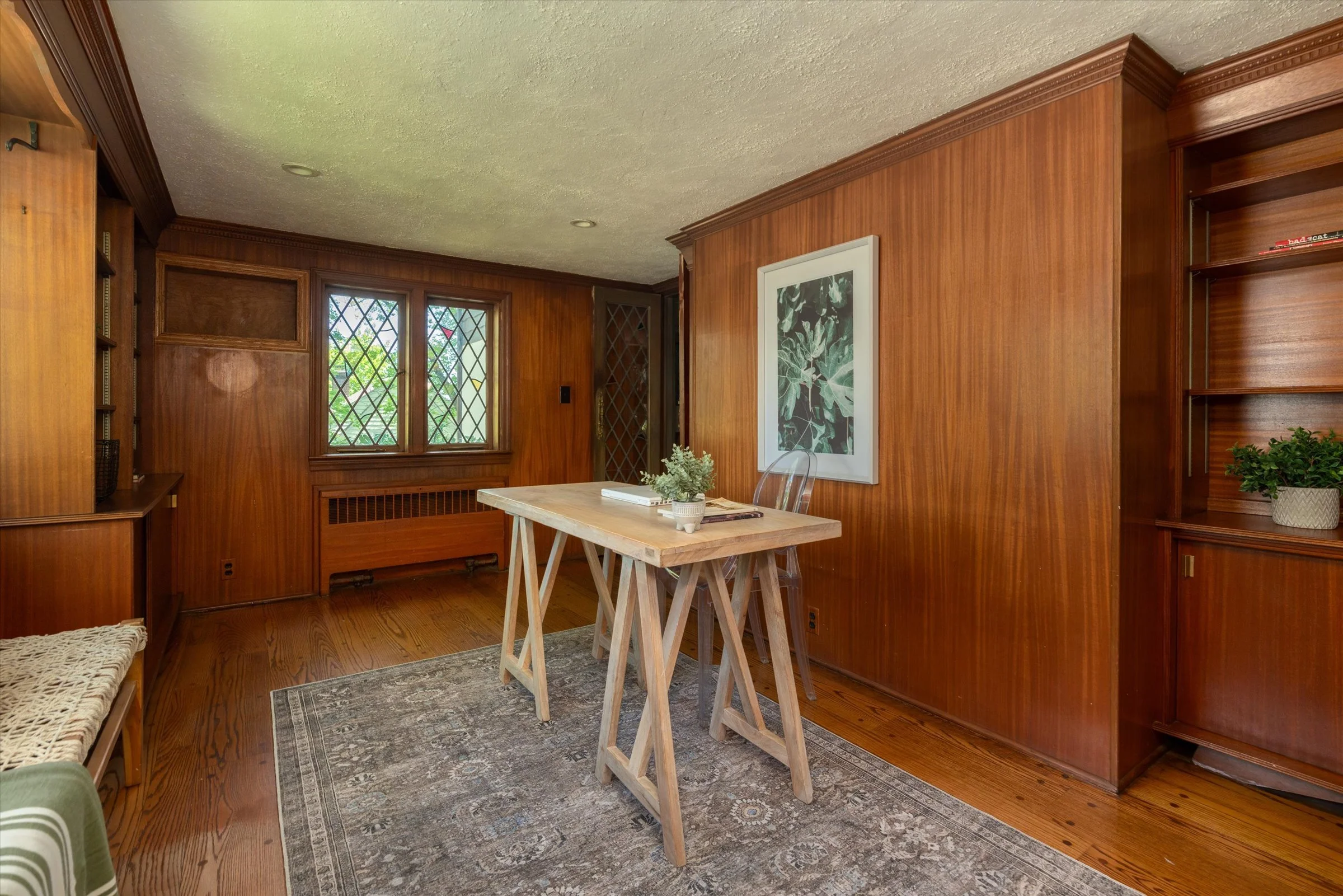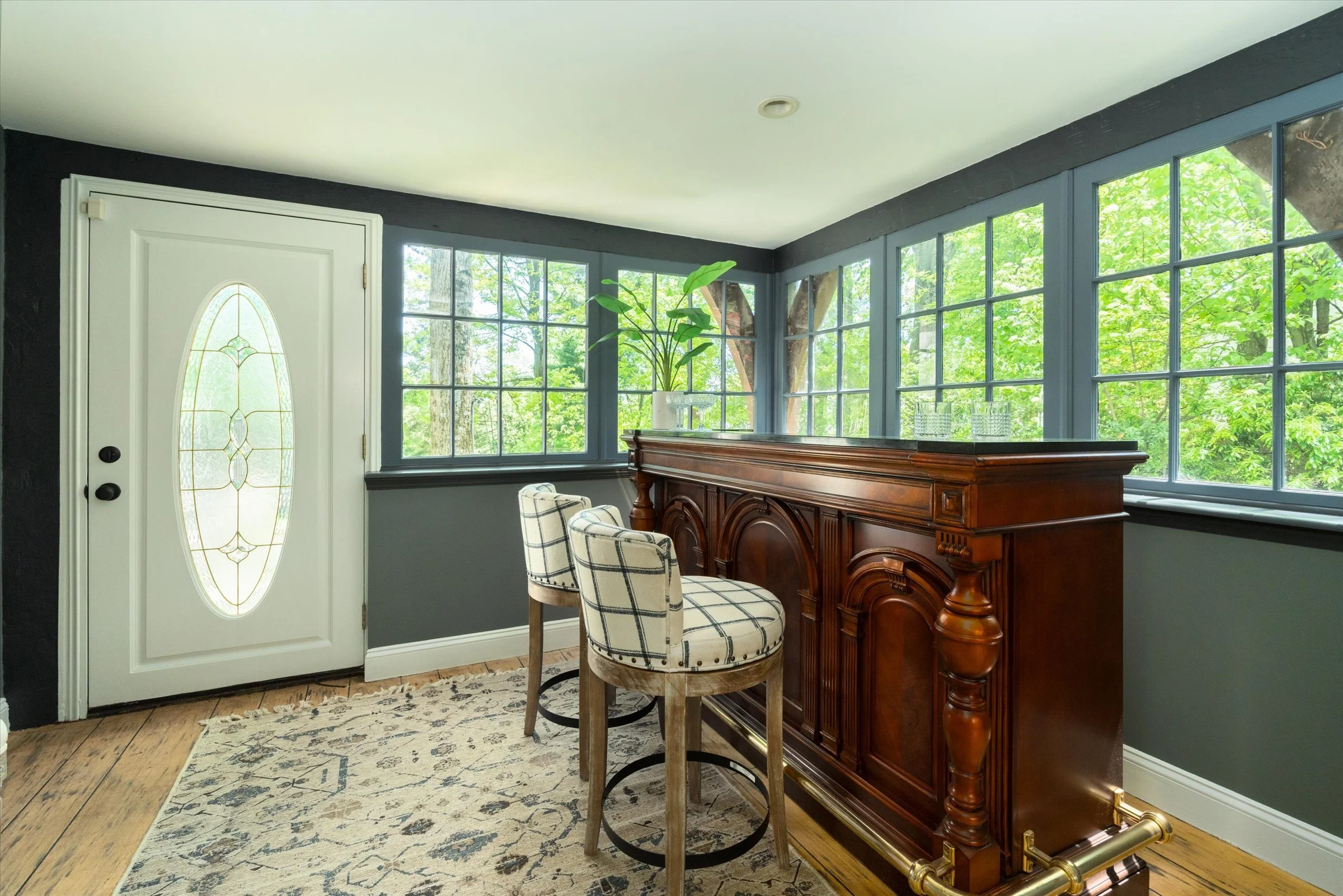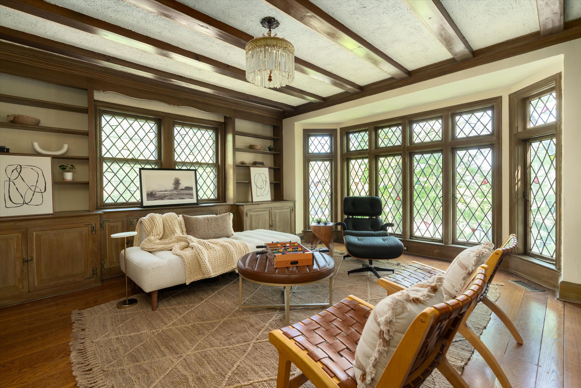 Floor-to-ceiling windows and leaded/stained glass details add charm