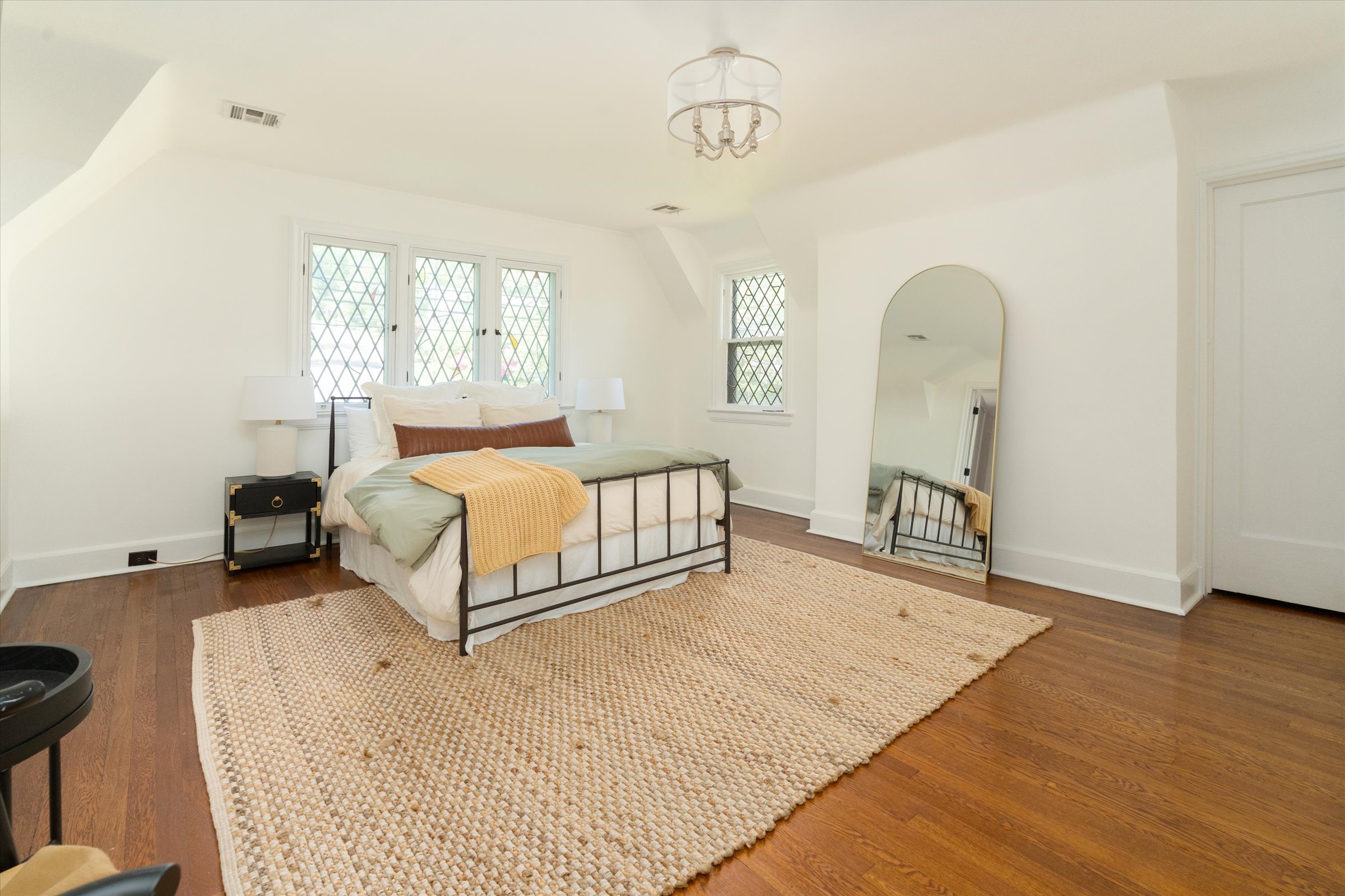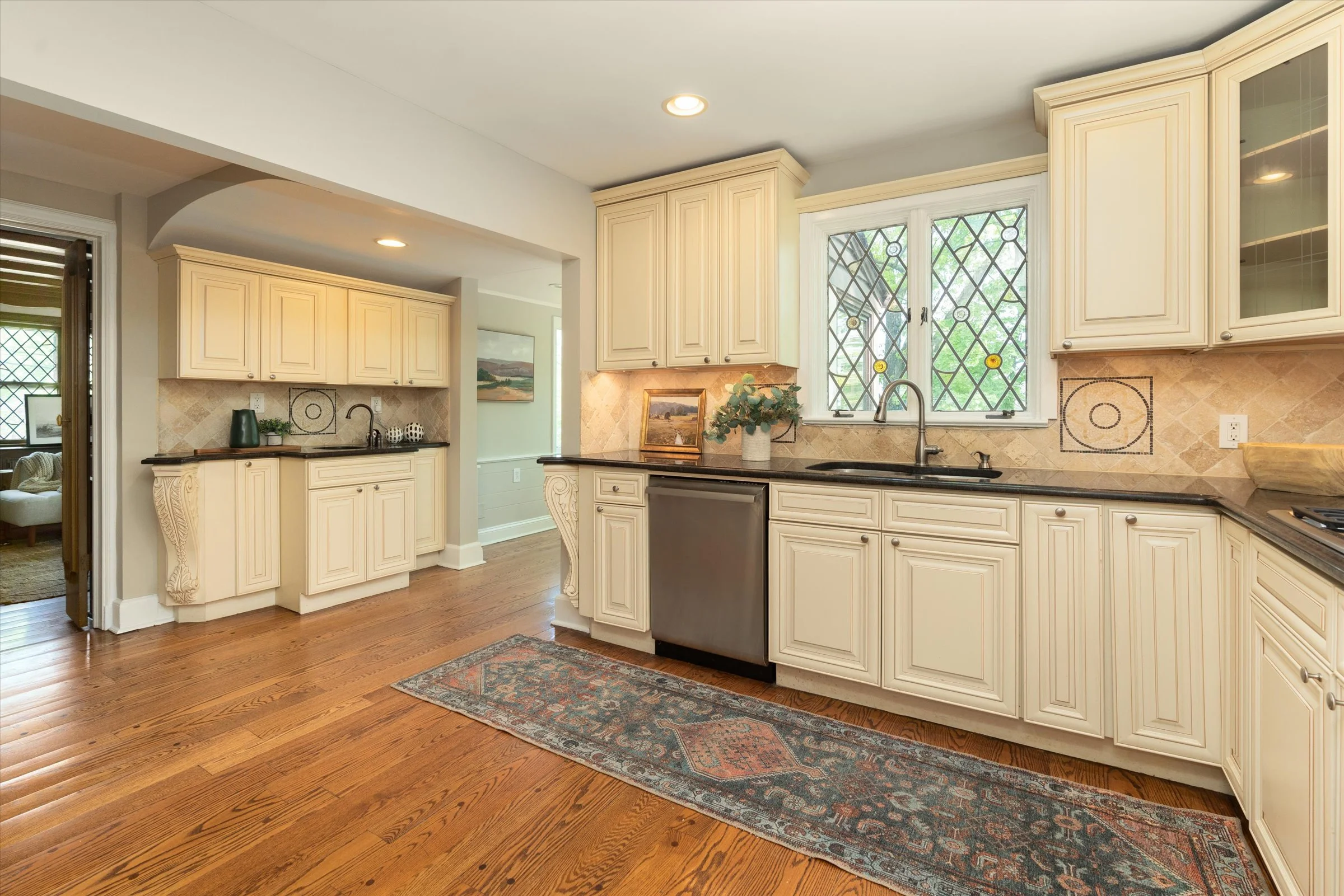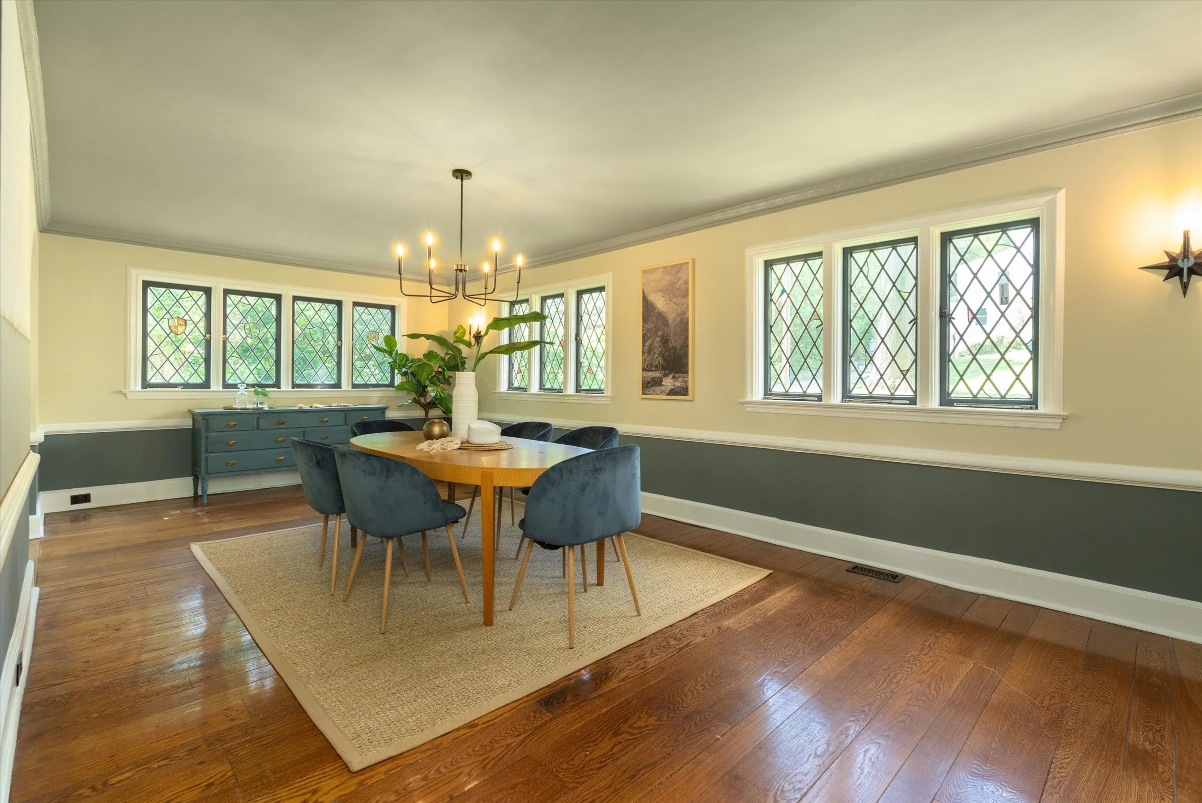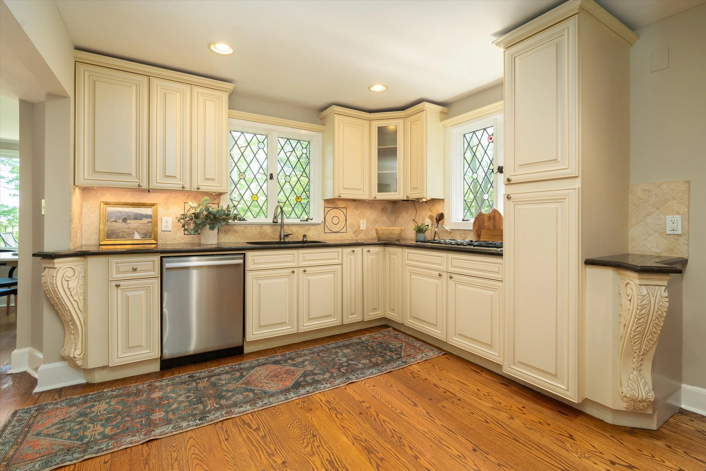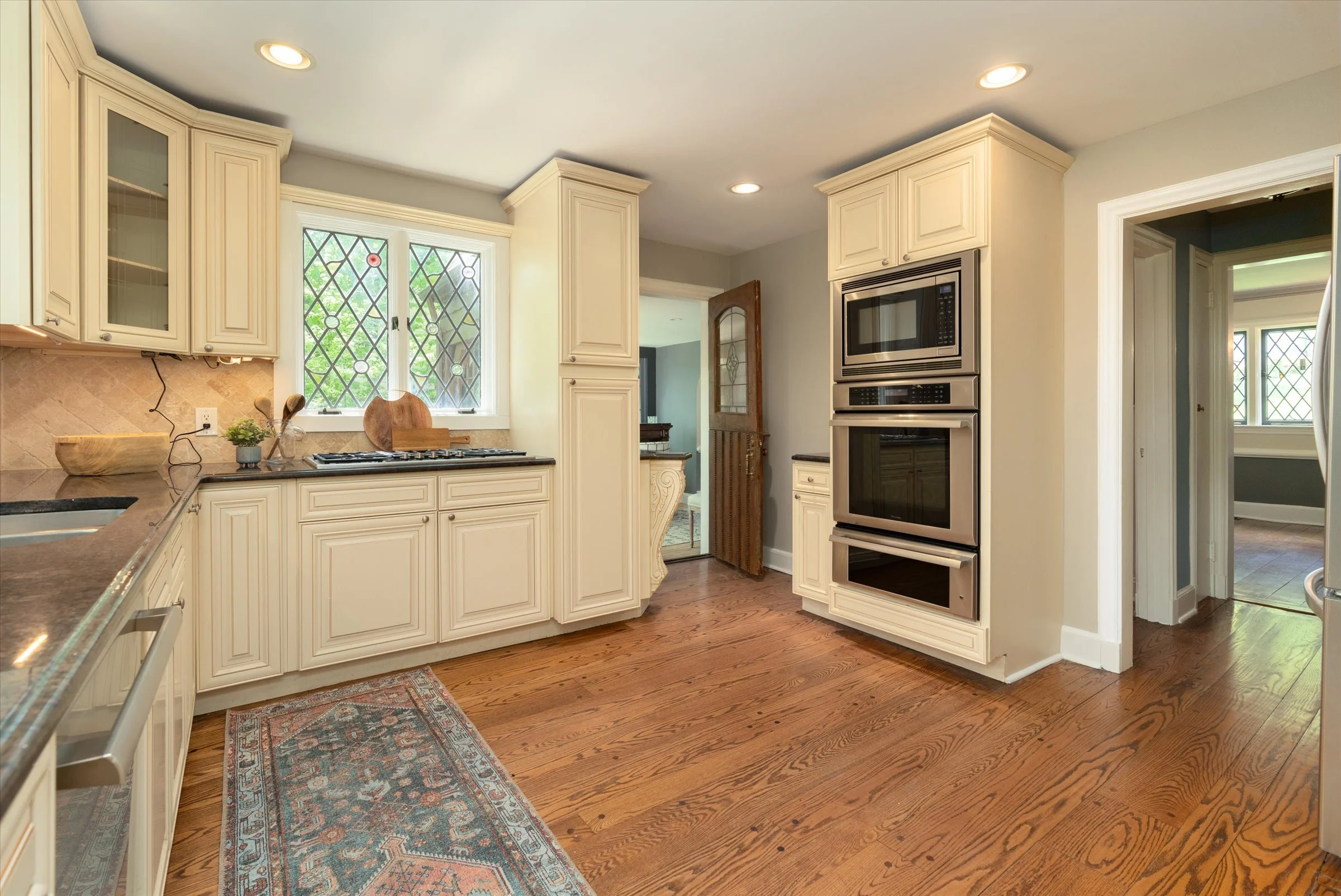 Floor-to-ceiling windows and leaded/stained glass details add charm