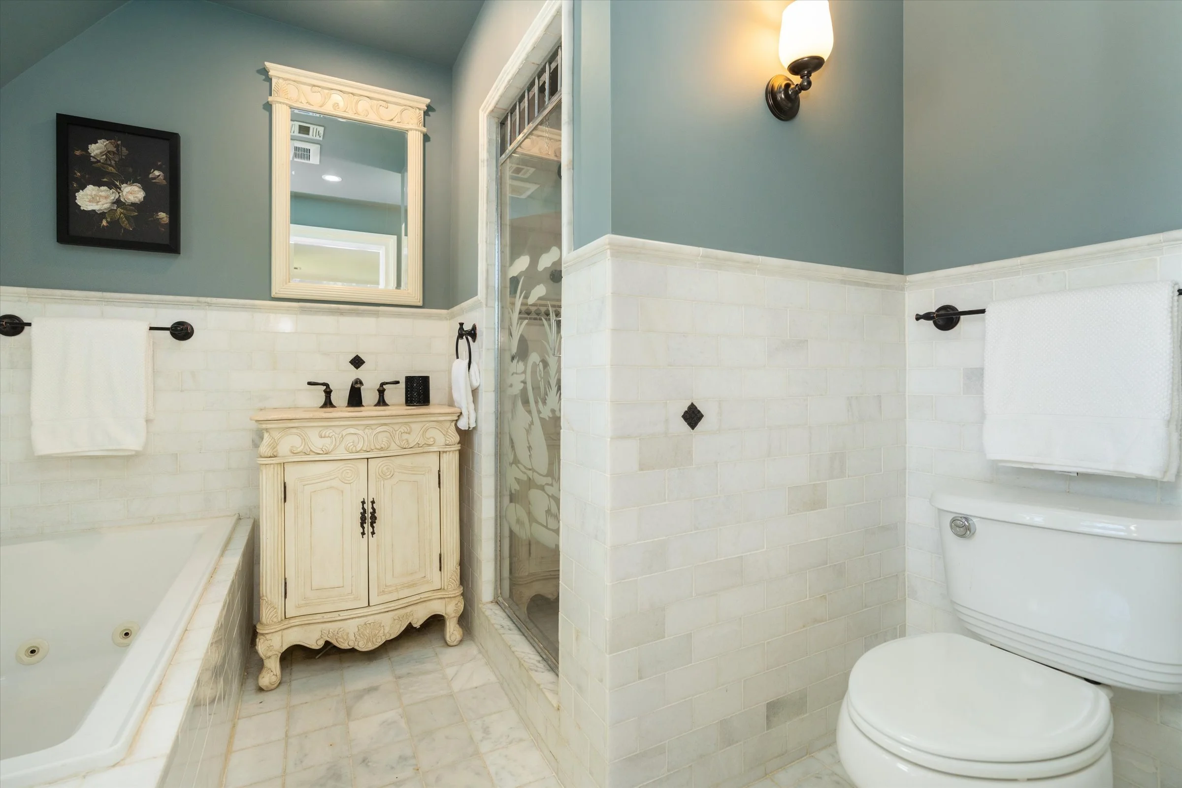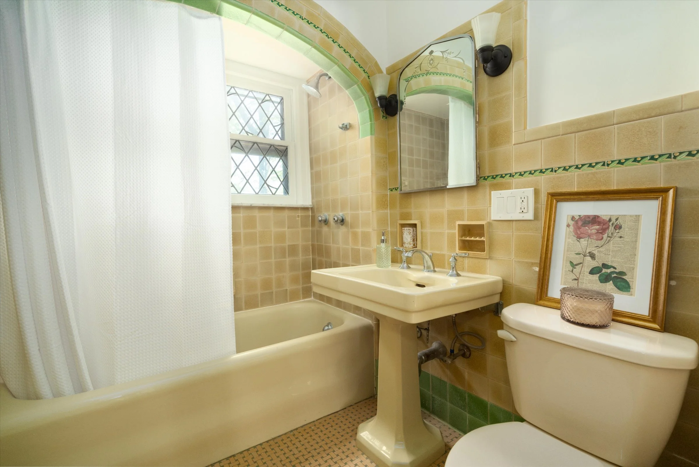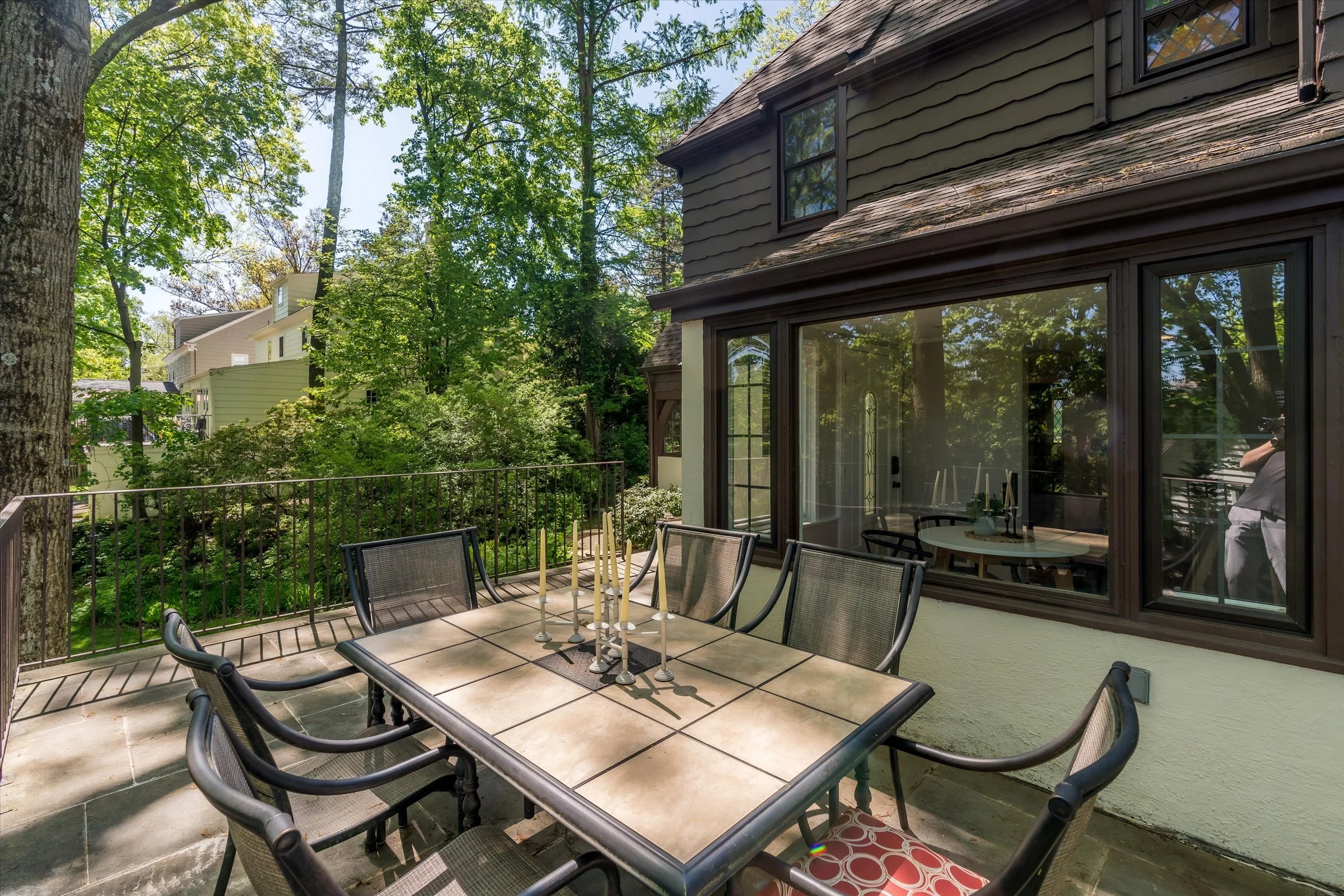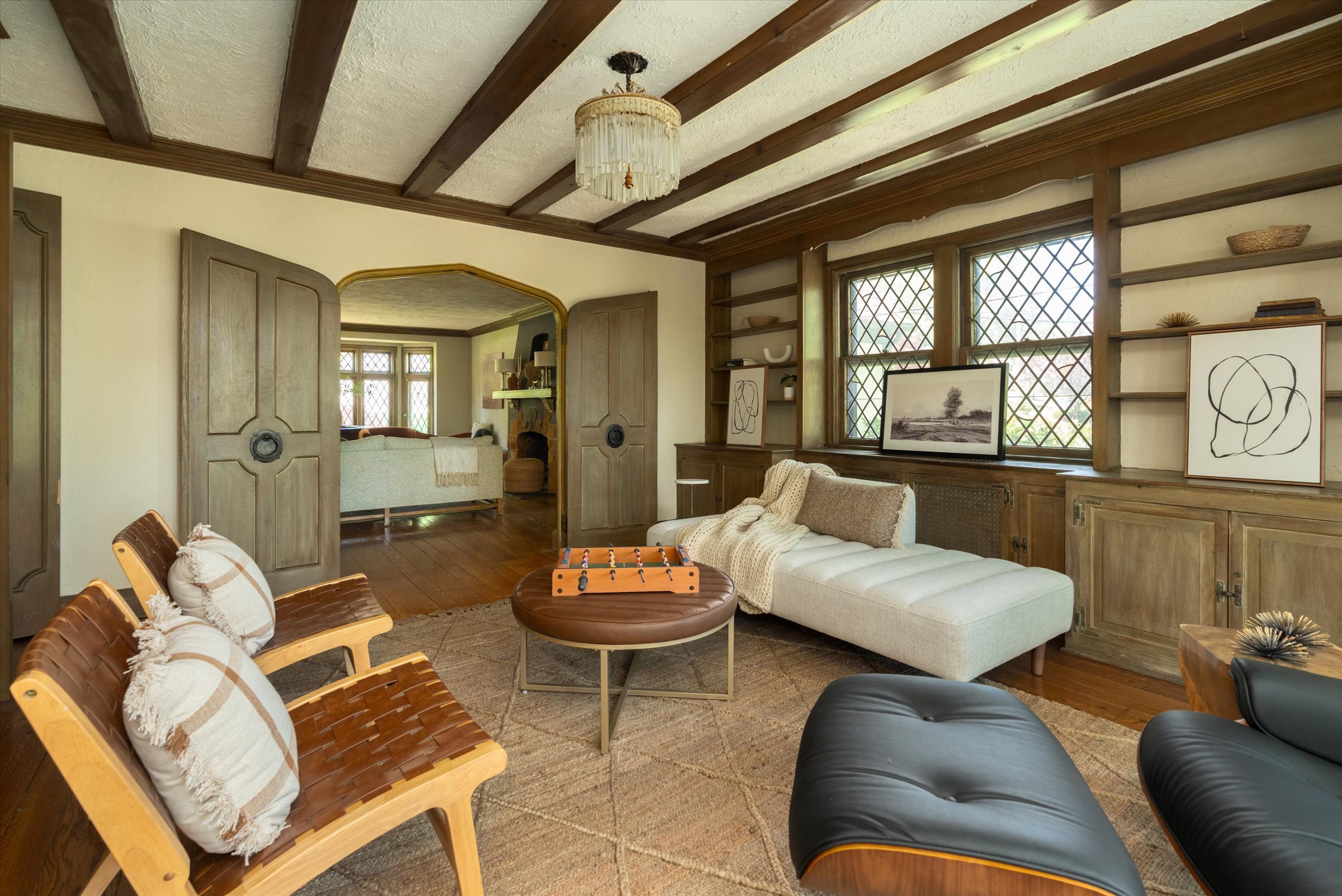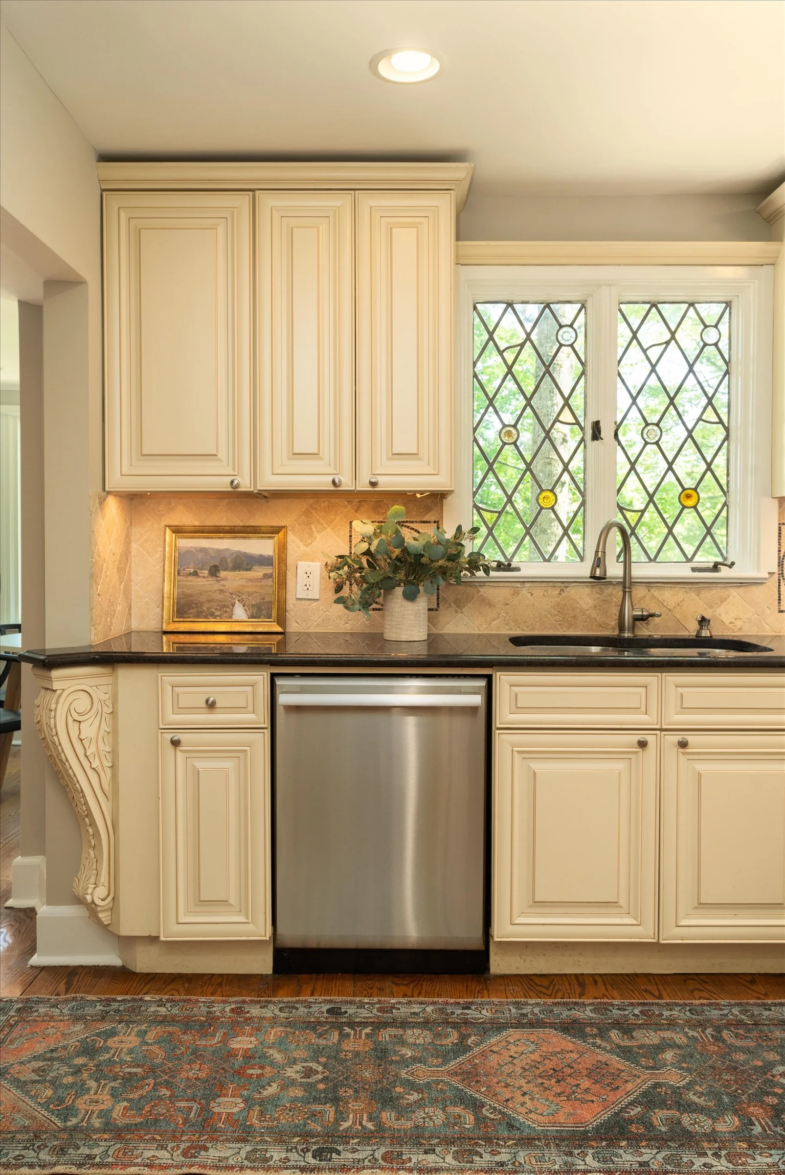 Floor-to-ceiling windows and leaded/stained glass details add charm