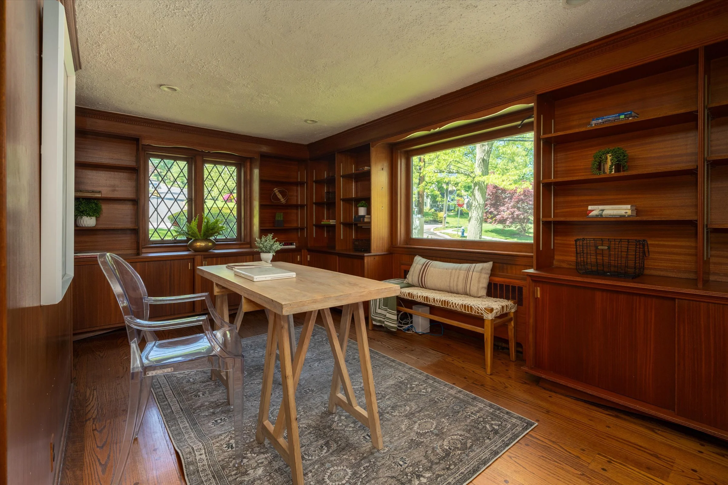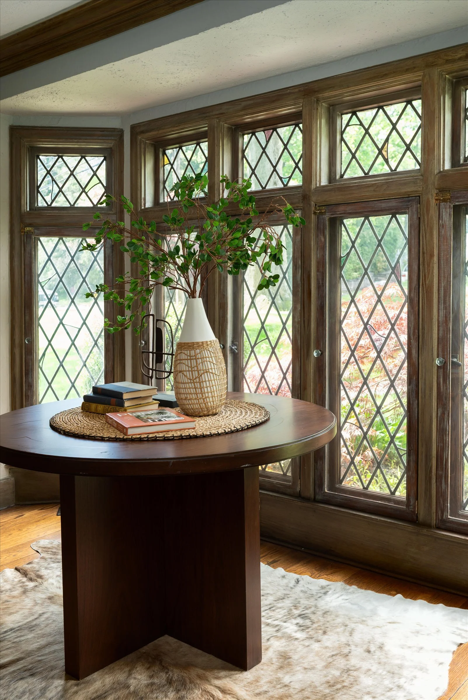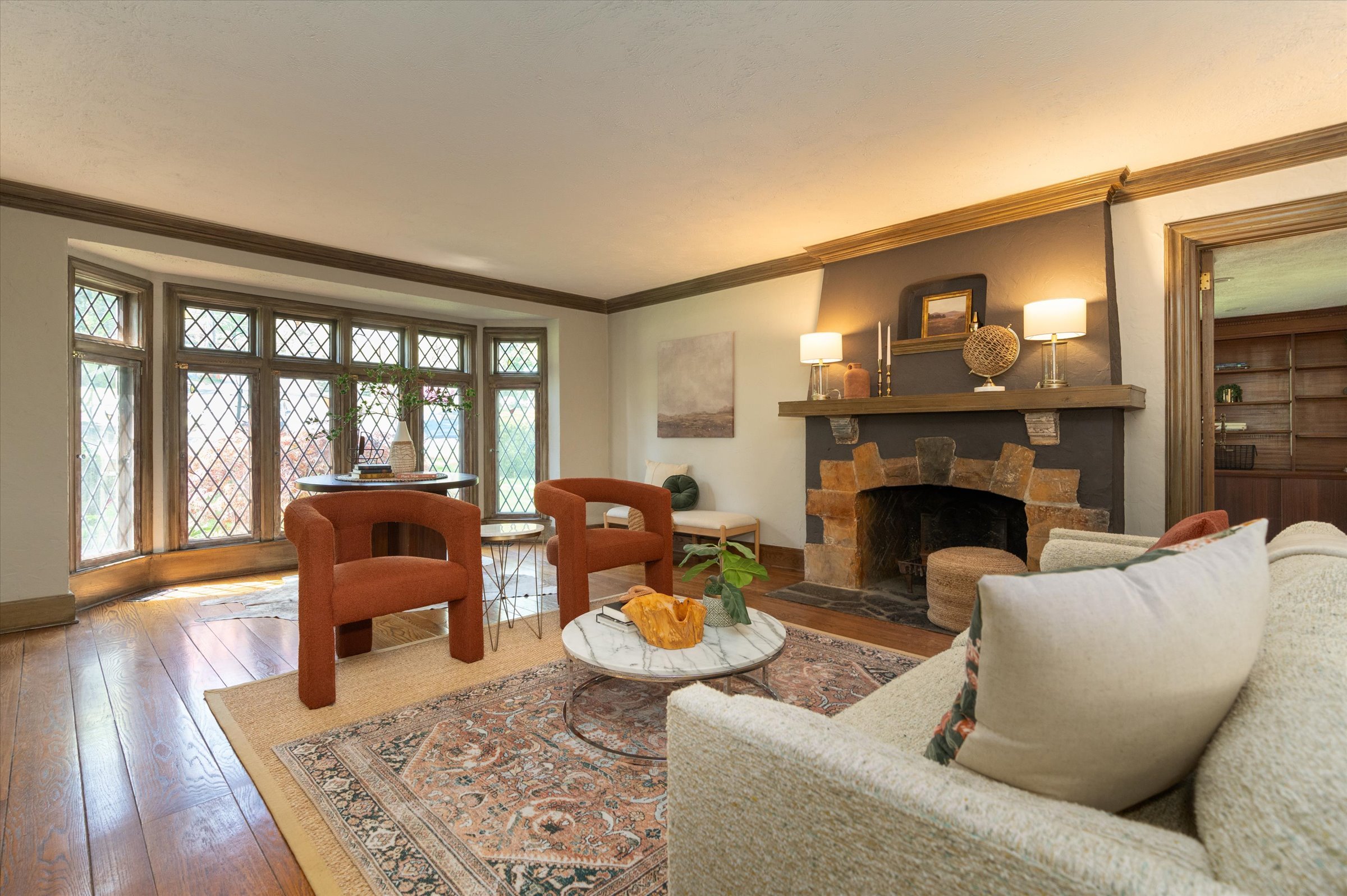 “Love the floor to ceiling leaded glass windows with custom storms and the fireplace.