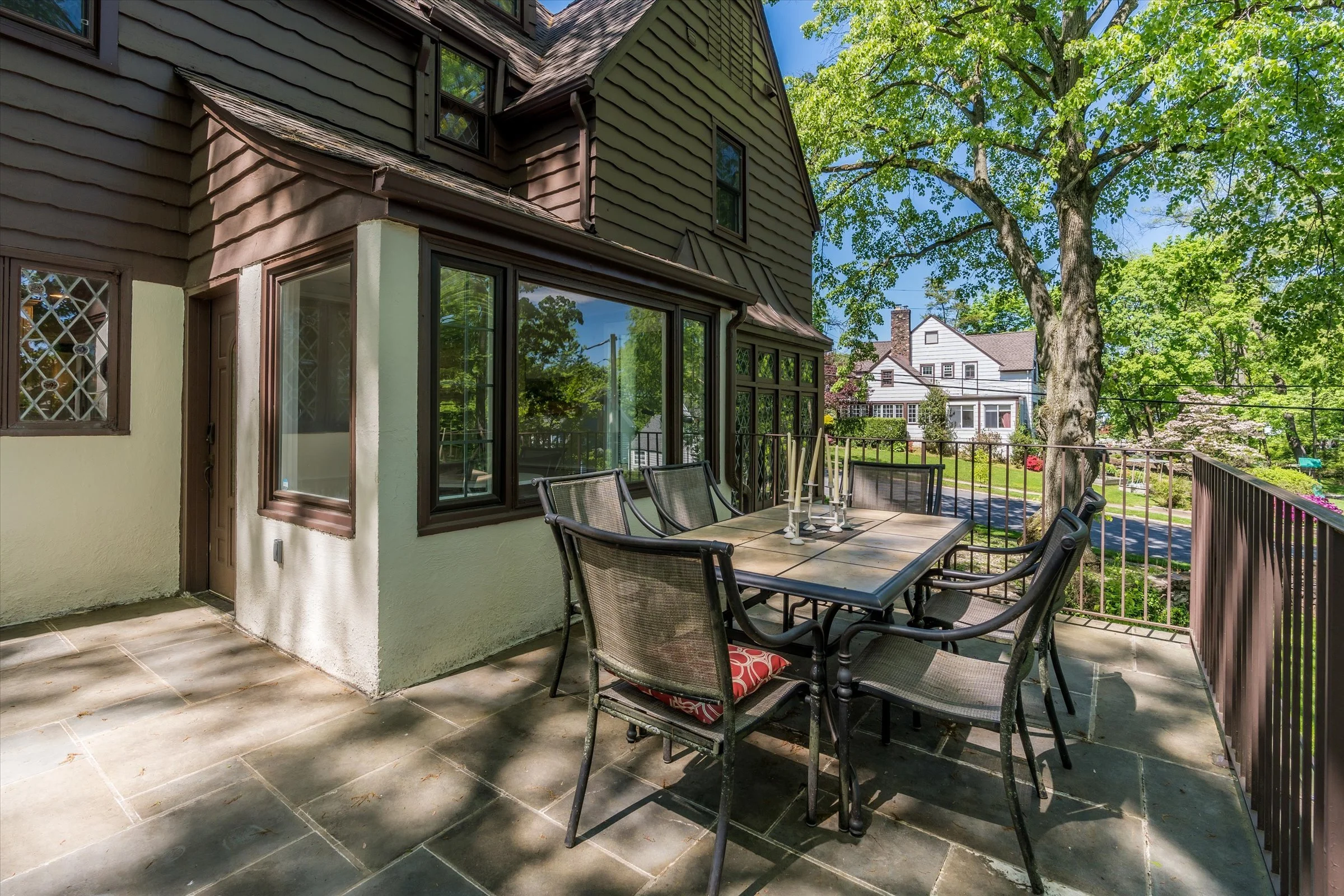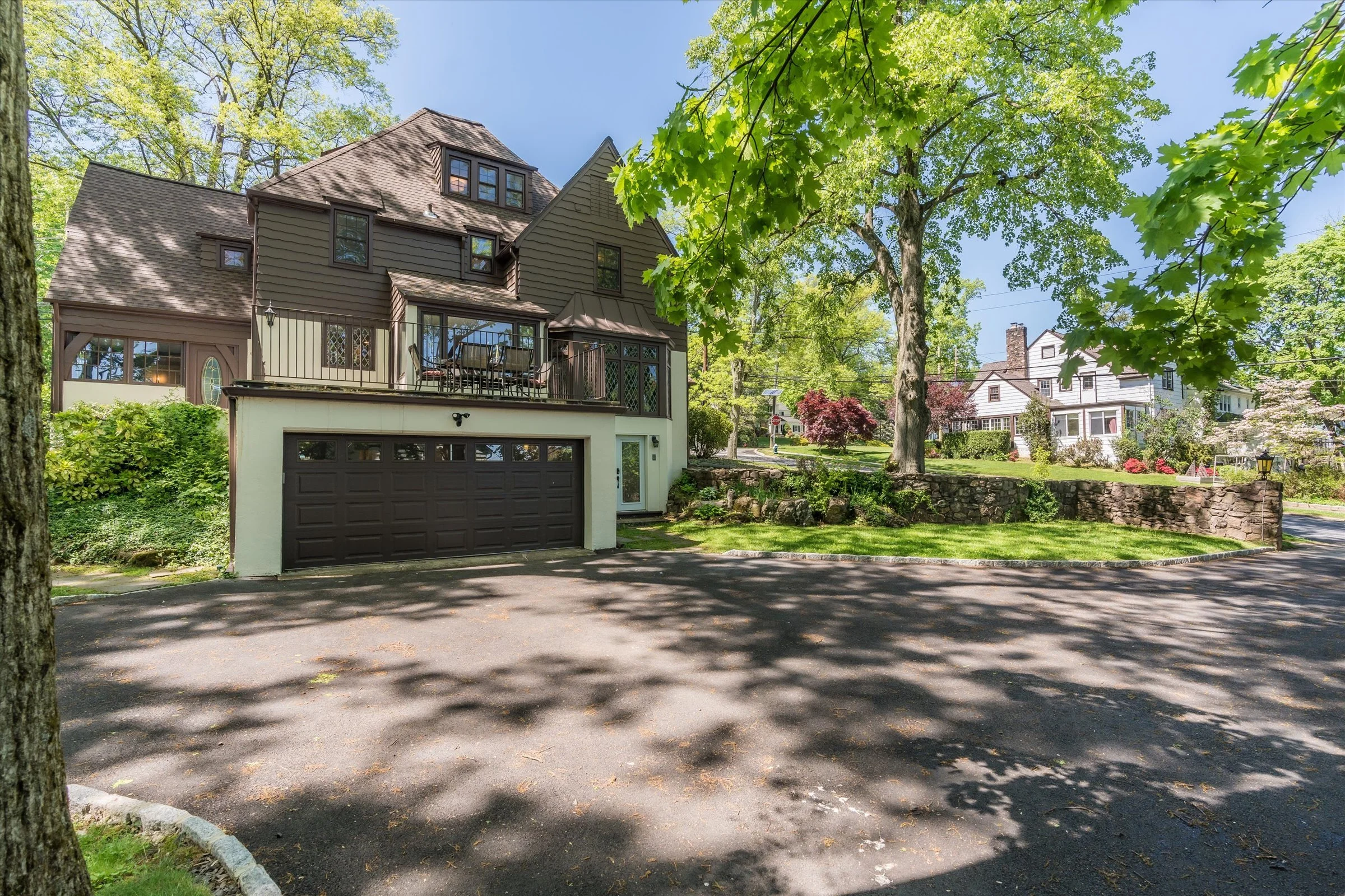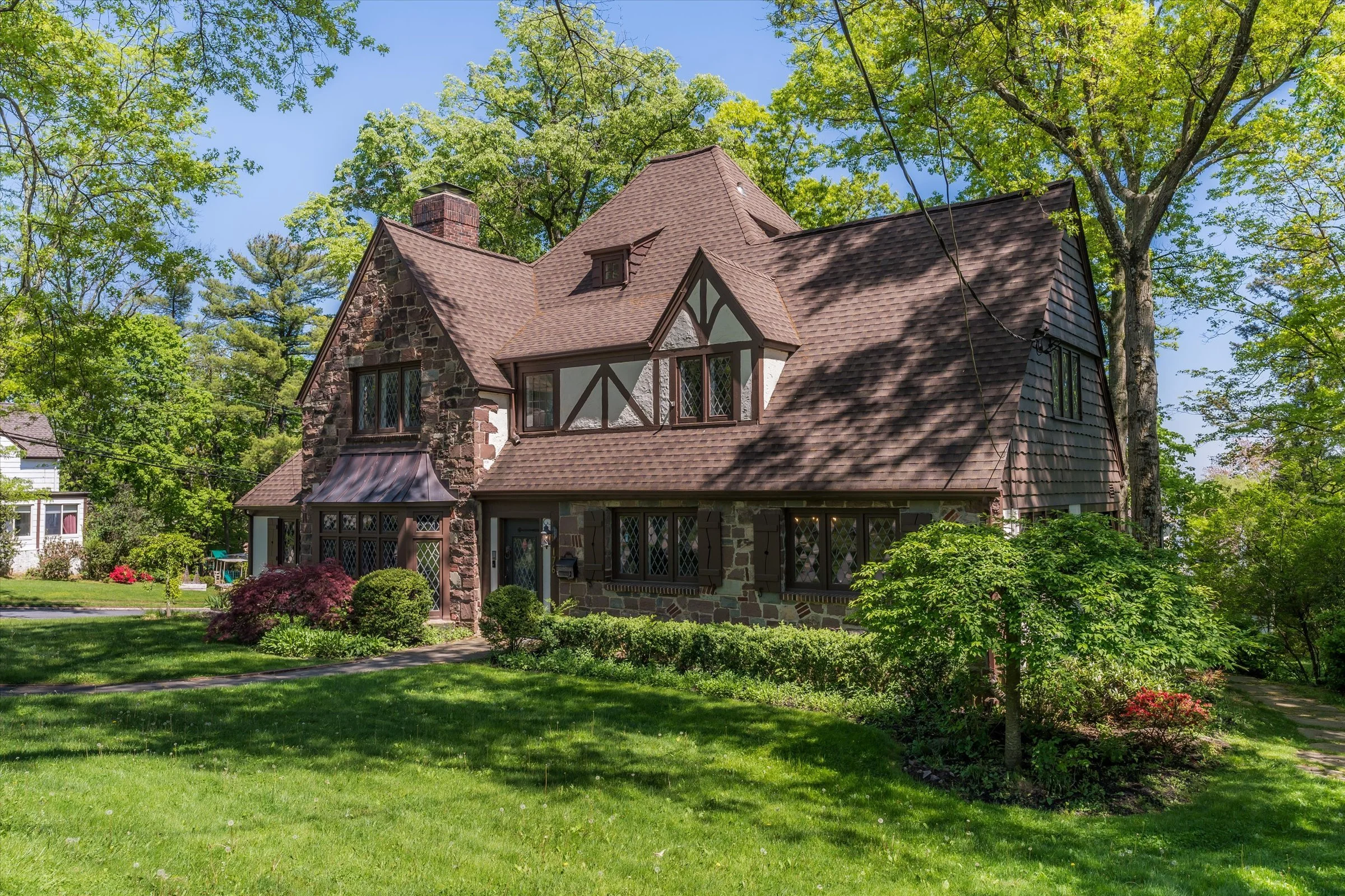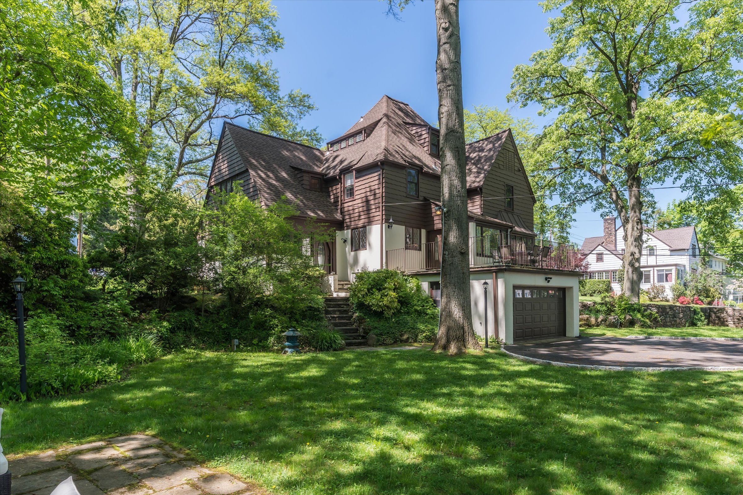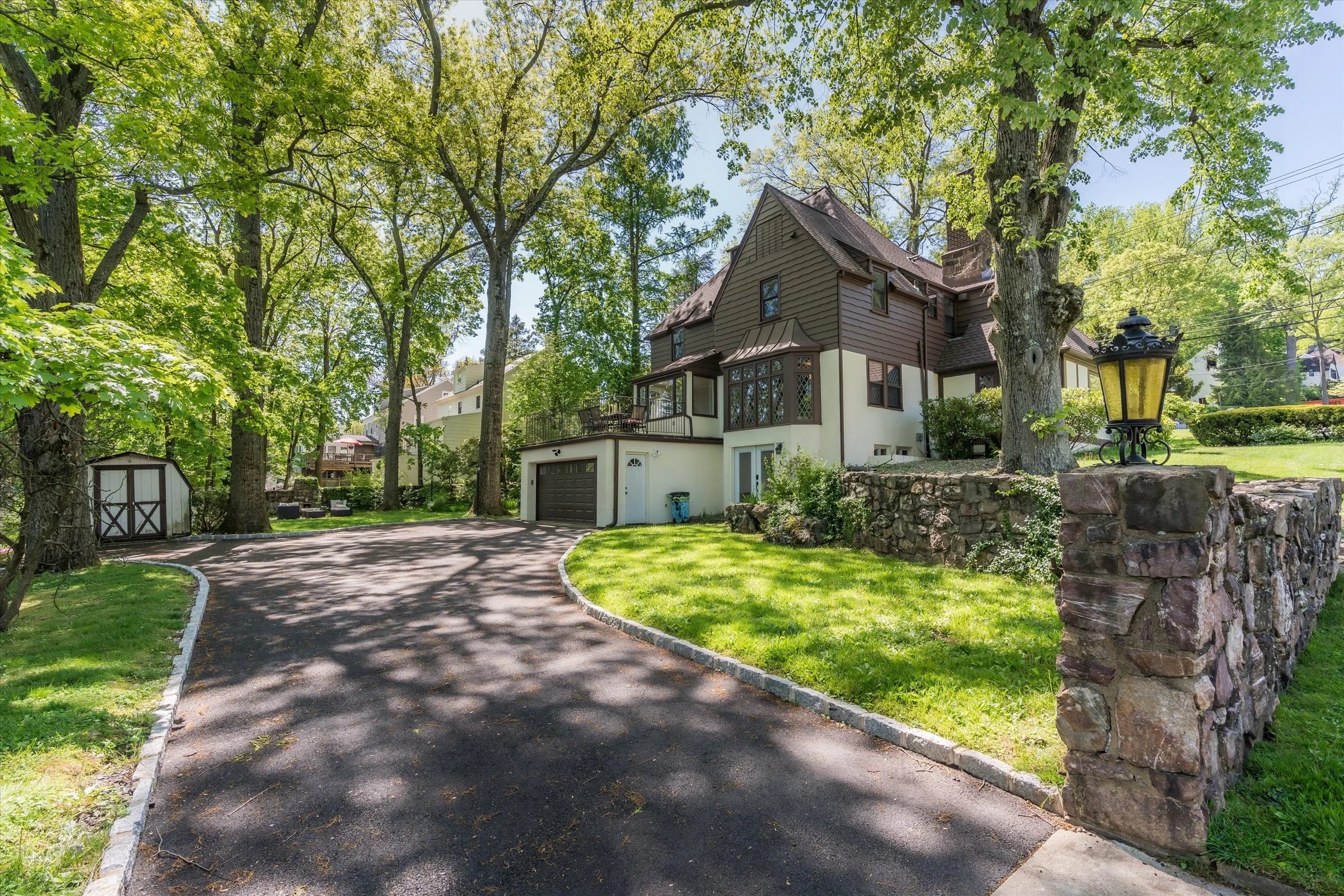 Welcome to this grand Maplewood Tudor boasting 5 bedrooms, 4.2 bathrooms with endless character and timeless charm! Situated on a large double lot, it seamlessly combines classic elegance with modern amenities. Step inside to find original chestnut wood finishes, leaded glass windows, pegged-hardwood floors, and a bright feel. The eat-in kitchen features high-end appliances, a butler's pantry, and a breakfast nook. Enjoy the sunroom with access to the terrace. From the grand foyer to the formal dining room to the living room with fireplace, every detail exudes sophistication and the easy flow makes it perfect for entertaining. A den and wood-paneled library offer versatile spaces. Two patios and a working outdoor stone fireplace make blending indoor and outdoor living a breeze. The primary bedroom boasts an ensuite with soaking tub, walk-in closets, and ample space. The second floor features three bedrooms with ensuite bathrooms. The third floor offers another spacious, light-soaked bedroom with ensuite and attic storage. The lower level includes a rec room, half bath, laundry, and 4-car tandem garage. Don't miss this opportunity to own this exquisite residence.