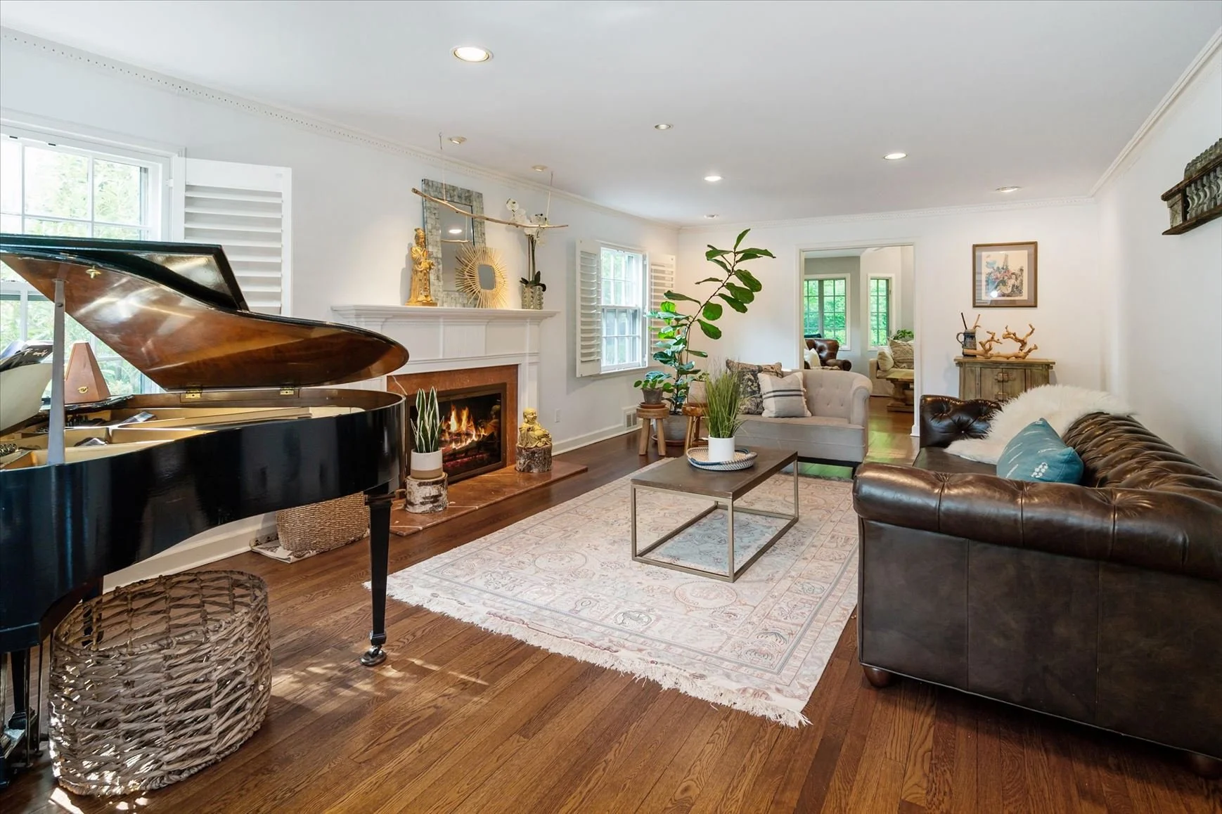 Formal living room has huge shaker style custom blinds for privacy and efficiency, but is flooded with light. There is a large wood burning fireplace to cozy up to, and dental molding that brings orginal charm to the large open space..