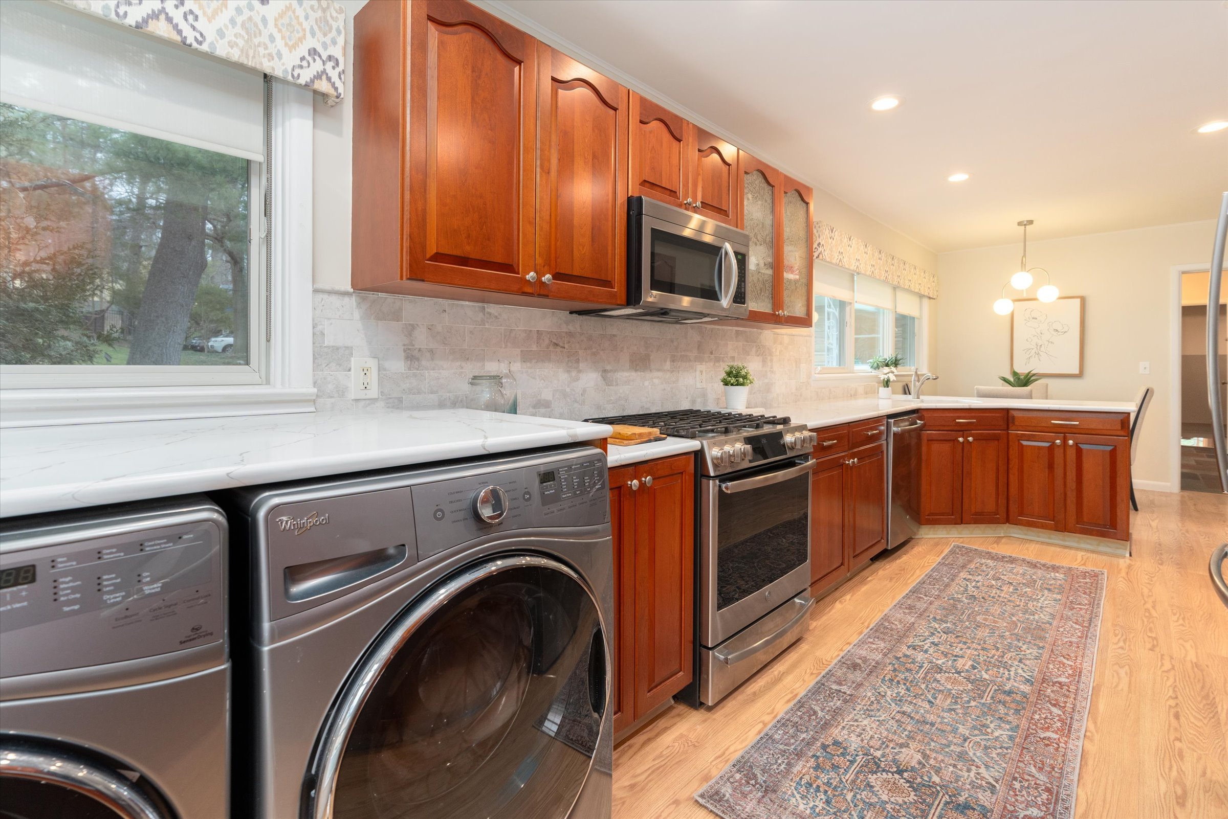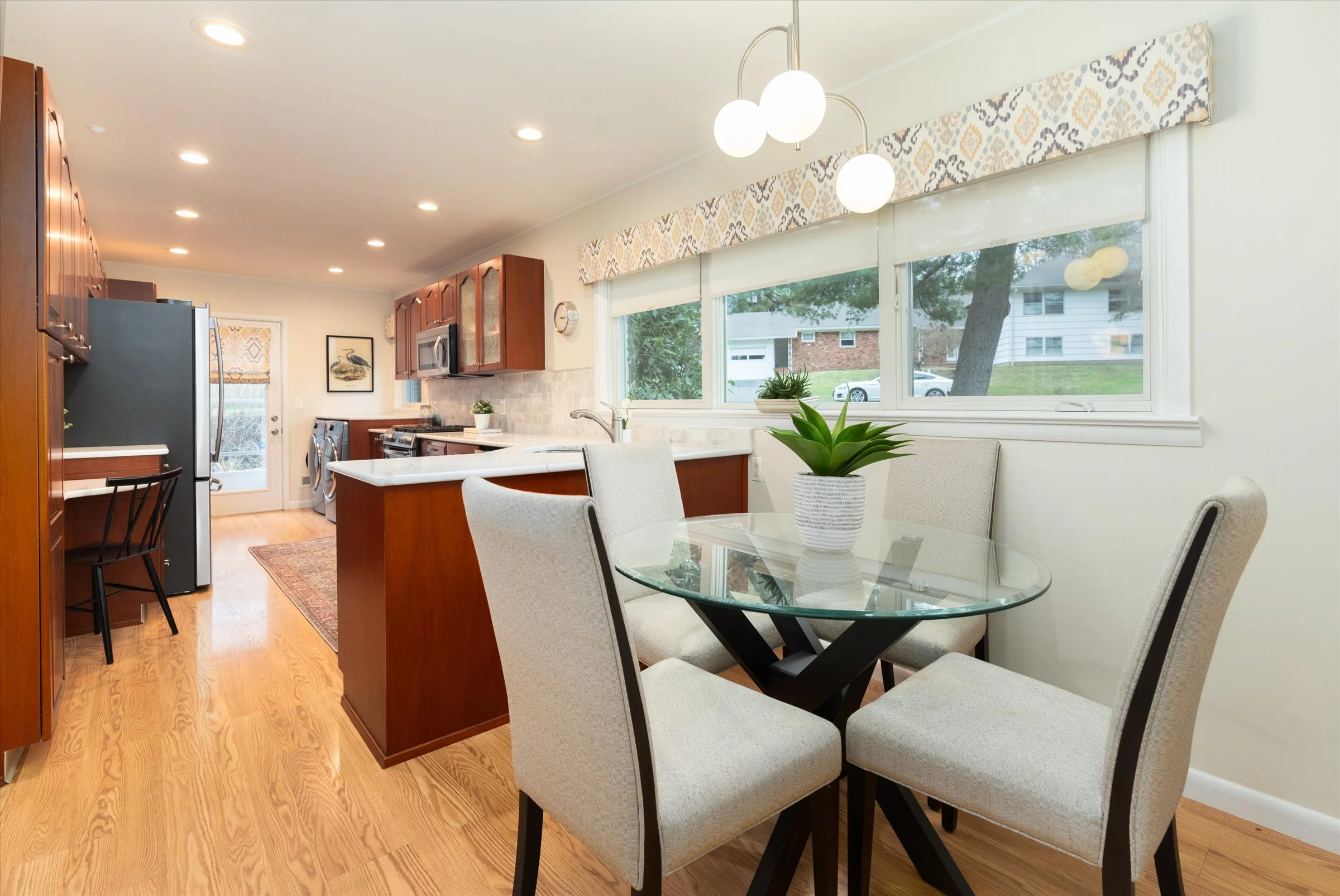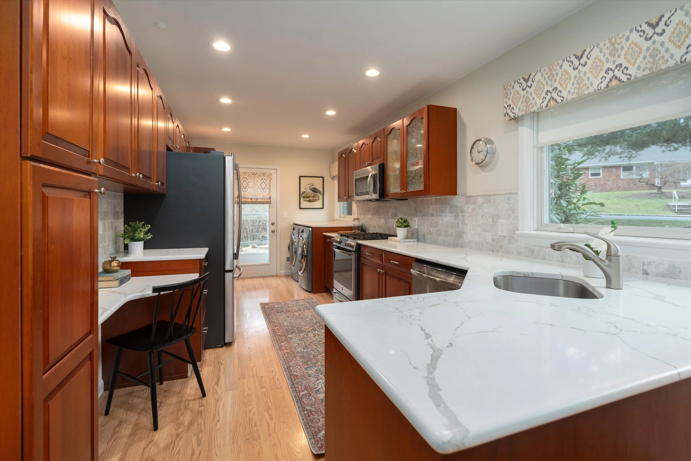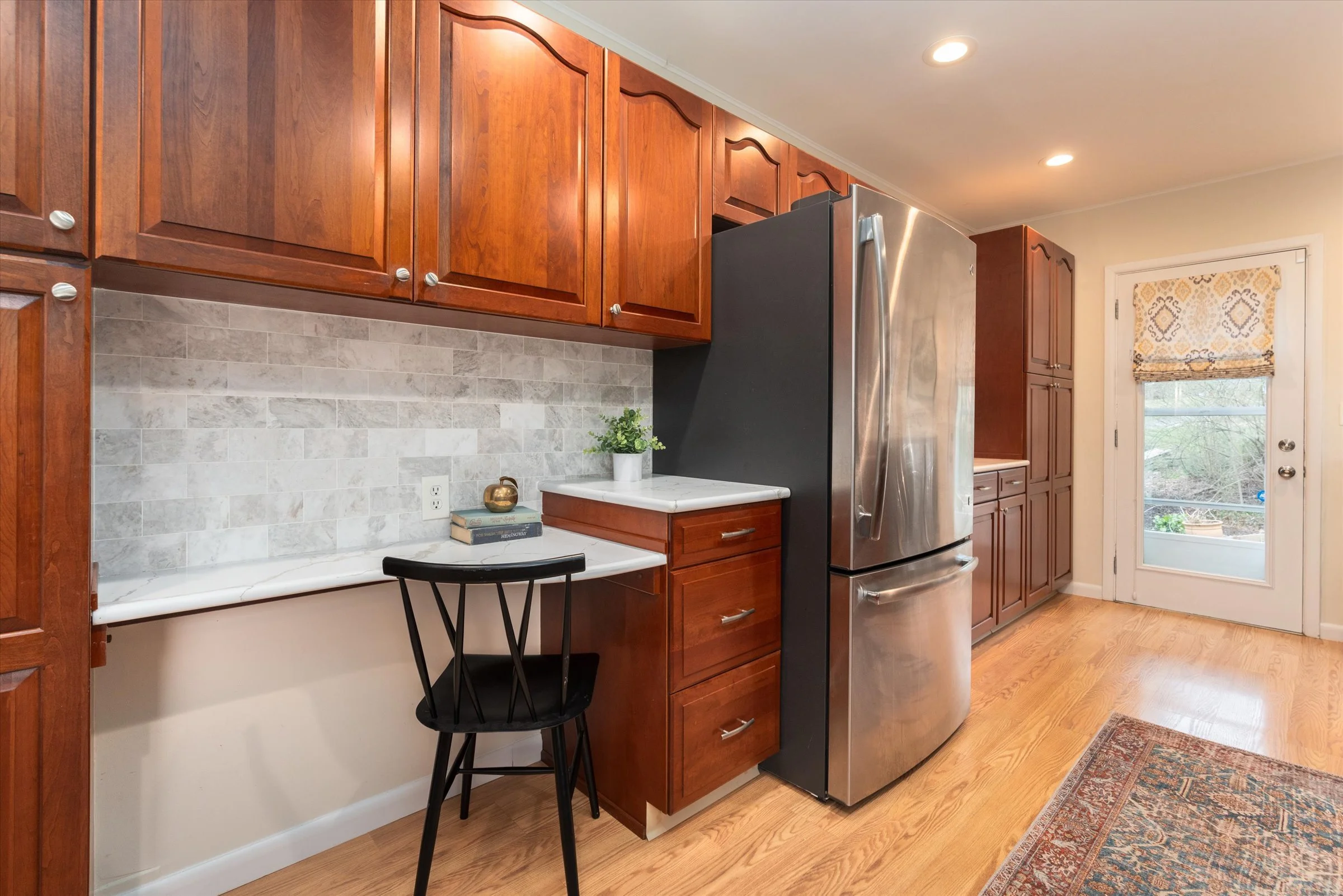 There is a large eat-in kitchen with great windows and a garden view out the kitchen door.”