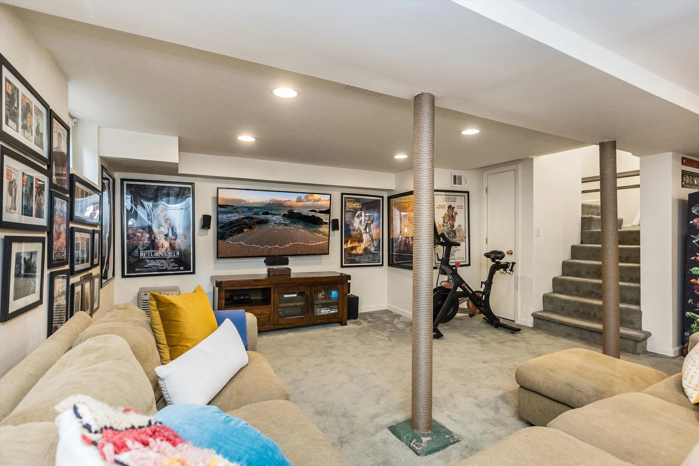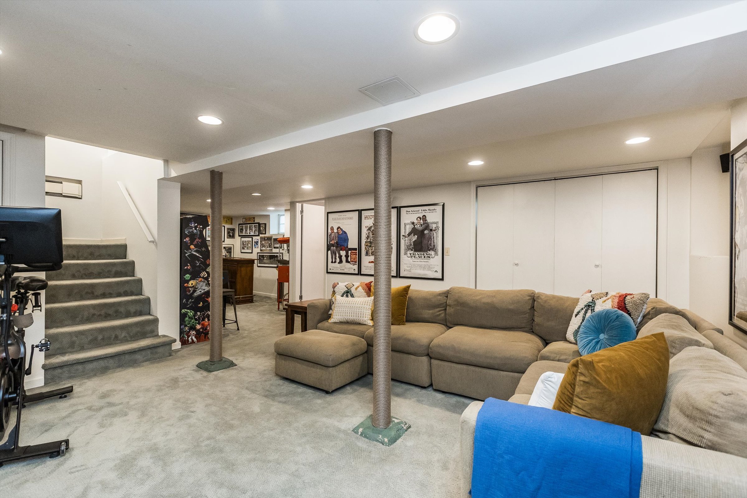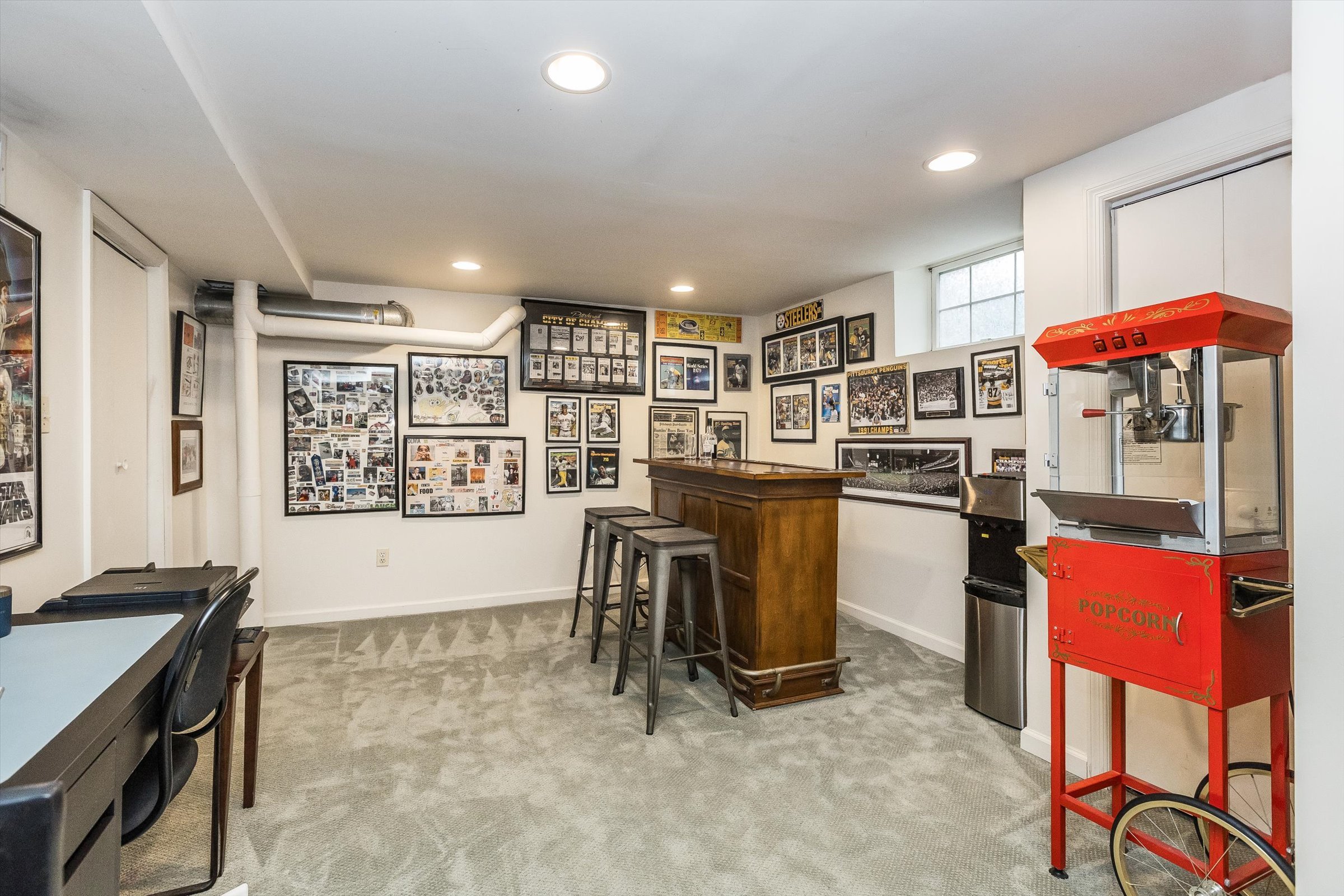 Finished basement great for movie night, making popcorn, enjoying a drink at the bar or playing on the arcade.