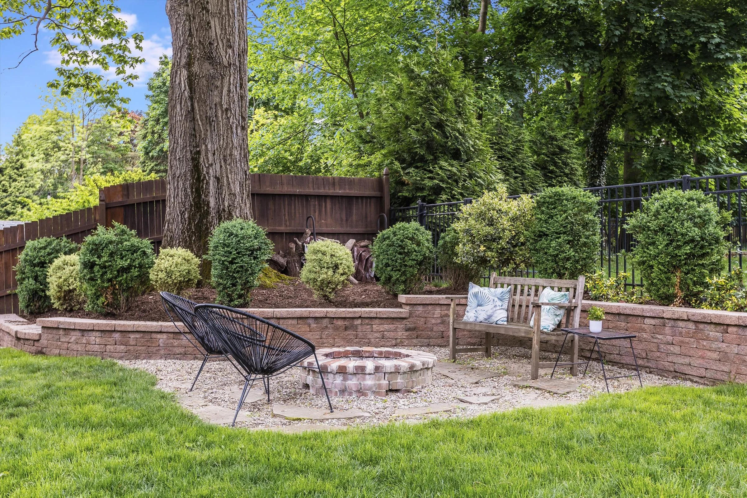 “Completely fenced in back yard which is great for dogs to run and play, large bluestone patio for entertaining, large fire pit which is particularly enjoyed on a crisp fall night, in ground basketball hoop, and a big red oak tree which at one point had a tree swing for the kids. Also brings great shade on hot summer days to sit under and read. ”