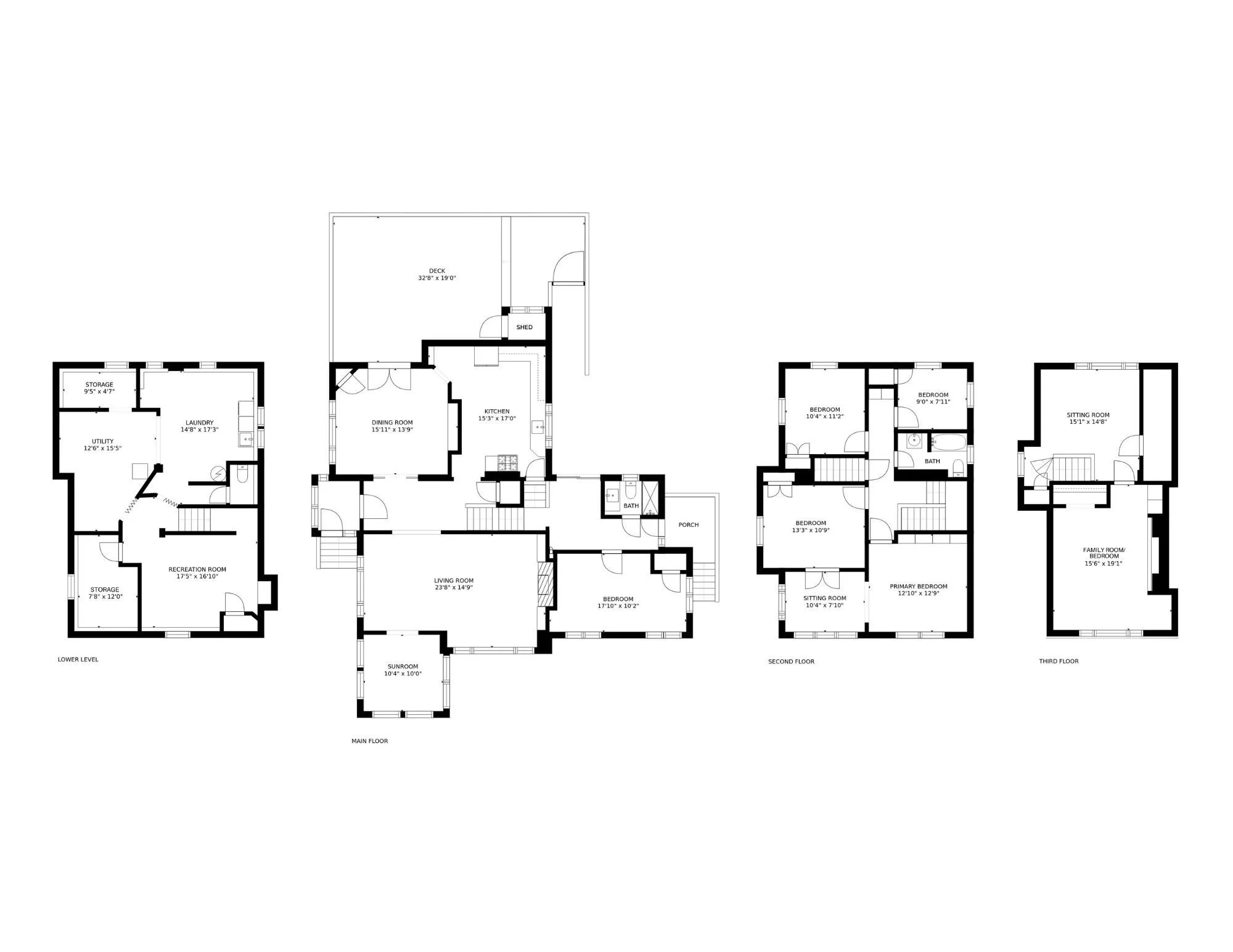 One-of-a-kind, this extraordinary home is both expansive and charming w/ original details like hardwood floors, moldings etc...! Arrive and notice the beautiful curb appeal. Enter through the bright mudroom to the classic foyer w/ hall closet & stunning, original staircase. To the left, find the generous DR w/ unique built-ins & wall moldings. Through the DR find the large EIK w/ exposed brick, ample cabinet & counter space w/ SS appliances & granite countertops, joining charm with function. To the right of the foyer, find the expansive and bright living room & adjacent sunroom/office. The LR offers more charm w/ brick fireplace & surrounding built-ins along w/ large sparkling windows. The sunroom is the perfect WFH spot or additional living space! Step through the kitchen to the lower floor addition that offers the ideal guest wing w/ large bedroom & beautifully updated FB. The 2nd floor offers a generous primary bedroom w/ original built-in closets w/ ample storage along w/ adjacent sitting room. Also on 2nd floor, find another office, two more gracious bedrooms & brand new full bath. Prepare to be wowed by the 3rd floor - this 3rd floor offers additional living or sleeping space w/ vaulted ceilings, built in location for TV or projector & beautiful sunlight. Enjoy additional recreation and storage space in the basement! Outdoors, dining al fresco is a dream on this huge deck & patio overlooking the generous yard. This home checks ALL the boxes!