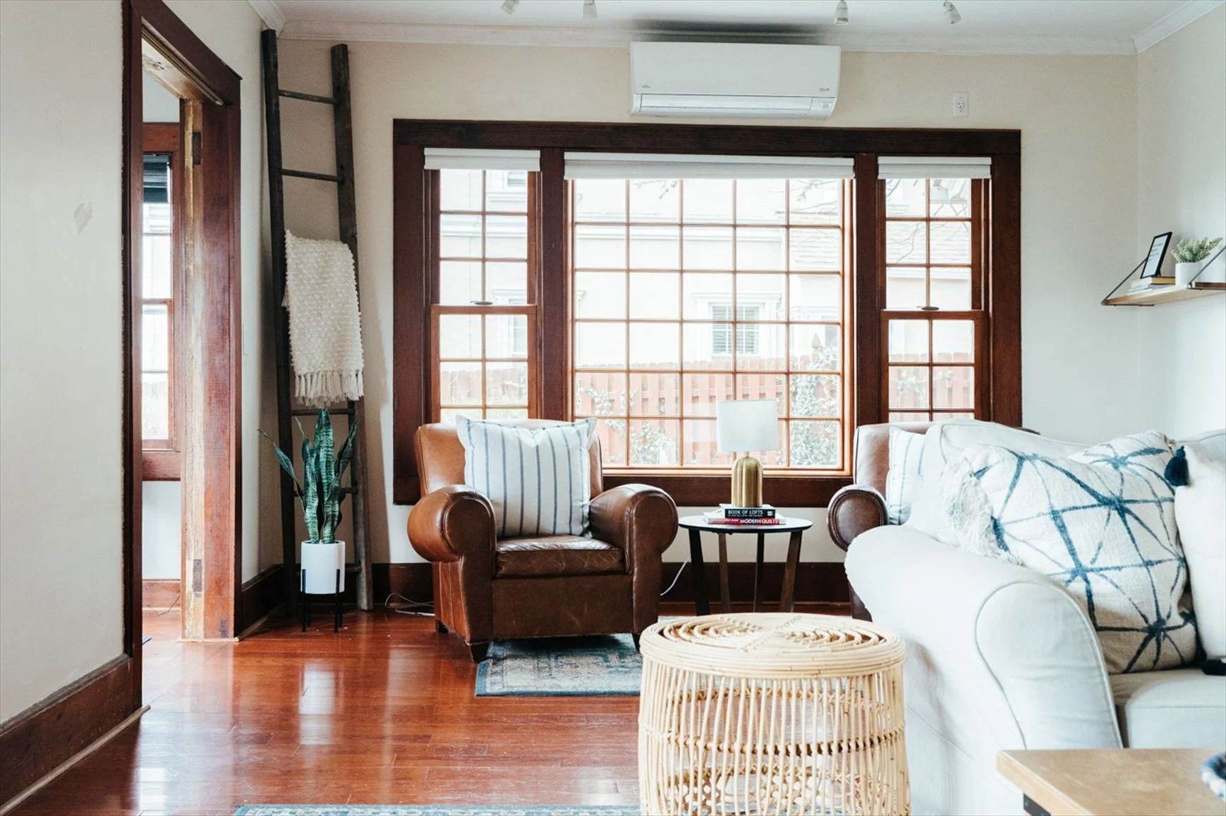 Drenched in sunlight, this expansive living room is uniquely beautiful and peaceful. The large windows provide a serene, up close view of each season and make rainy days a cozy dream. Graced with a brick fireplace that is flanked by built-in shelving, original hardwood floors and moldings, this living room offers a sense of history as well as warmth. Treasured moments are sure to be had here!