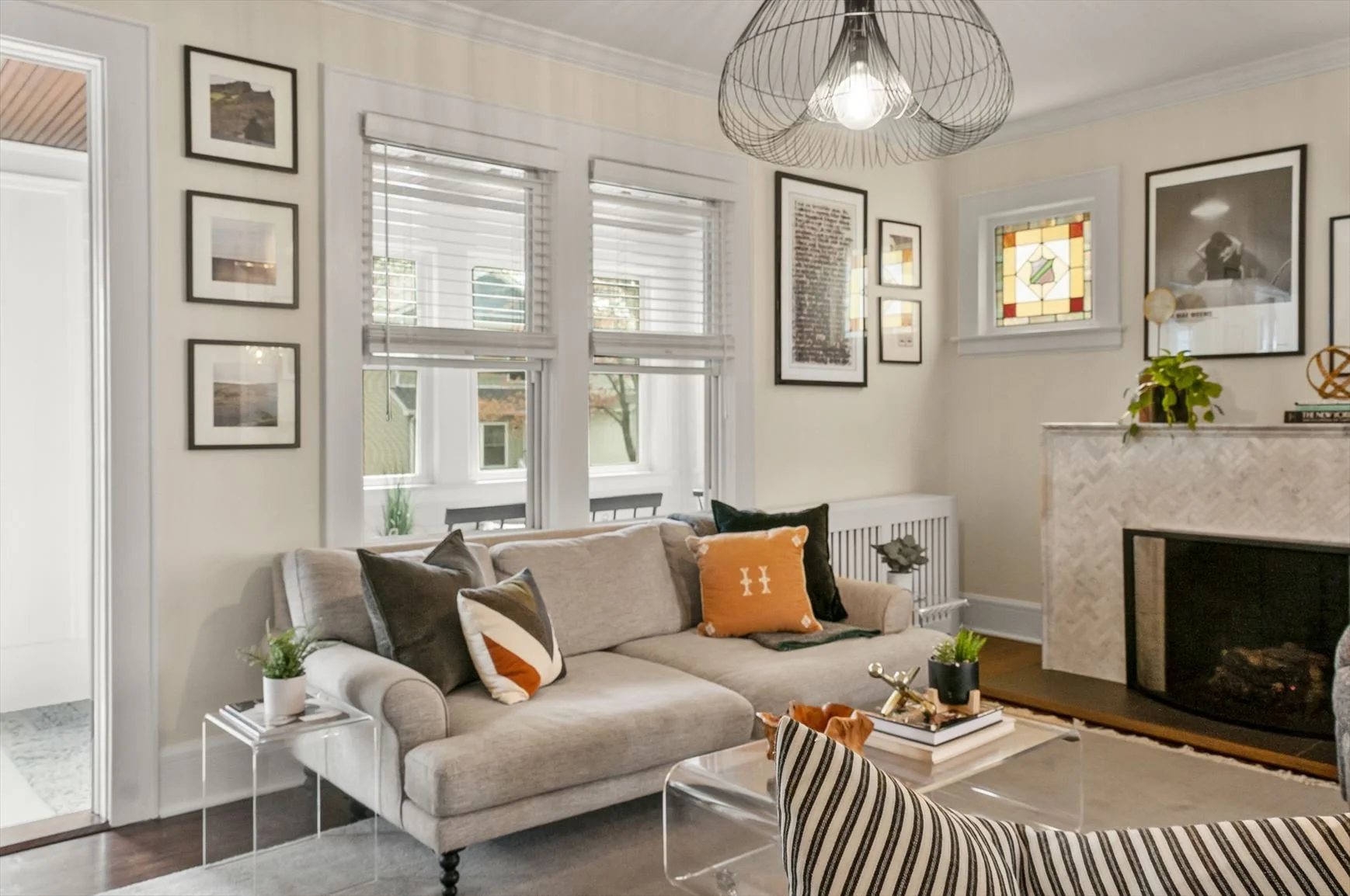 This spacious living room welcomes you with a large window, original hardwood floor, and crown molding. The stunning marble-clad gas fireplace is a breathtaking focal point and offers warmth during the cold winter season. Enjoy spending time with loved ones in this elevated and comfortable space.