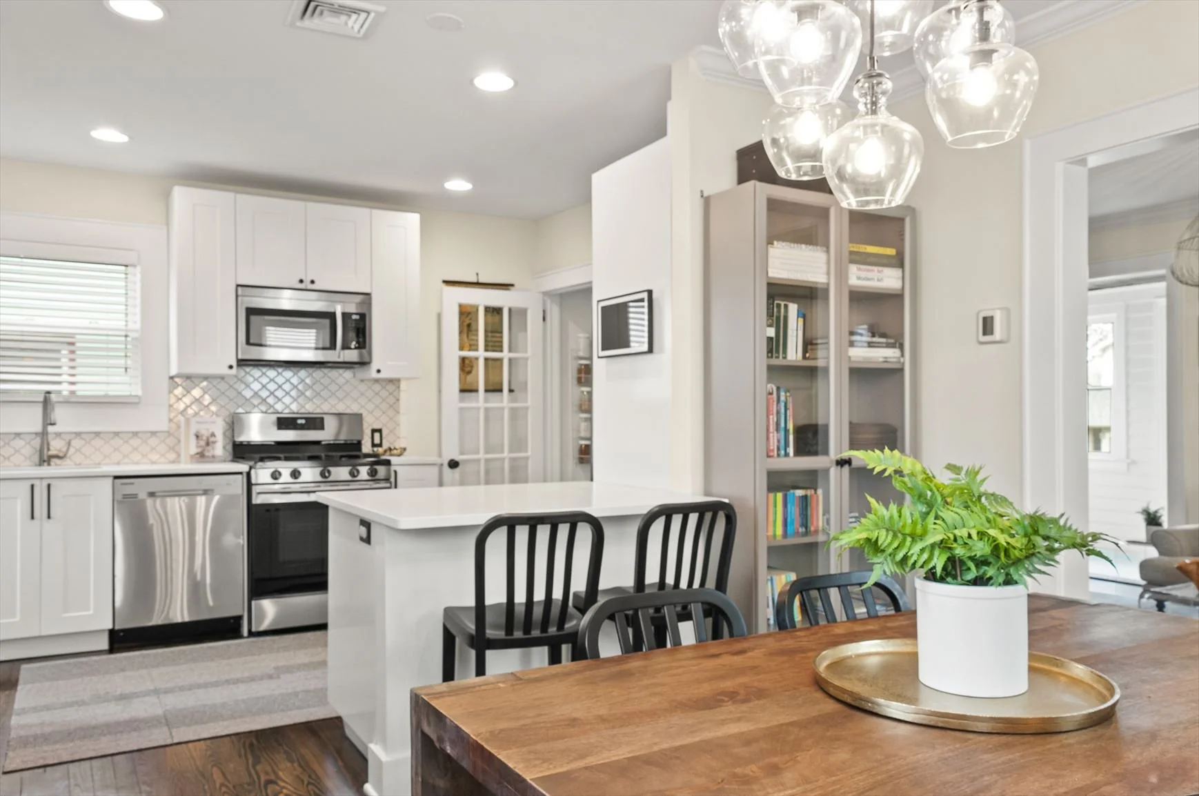 This newly renovated kitchen offers modern functionality with a bright and airy design. Enjoy the stainless steel appliances, beautiful quartz countertops, and the adjacent powder room for convenience. Ample cabinets and counter space provide the ideal environment for preparing a meal for 2 or 10! The breakfast bar offers the perfect homework or hang-out spot. This kitchen is not only move-in-ready but a dream!