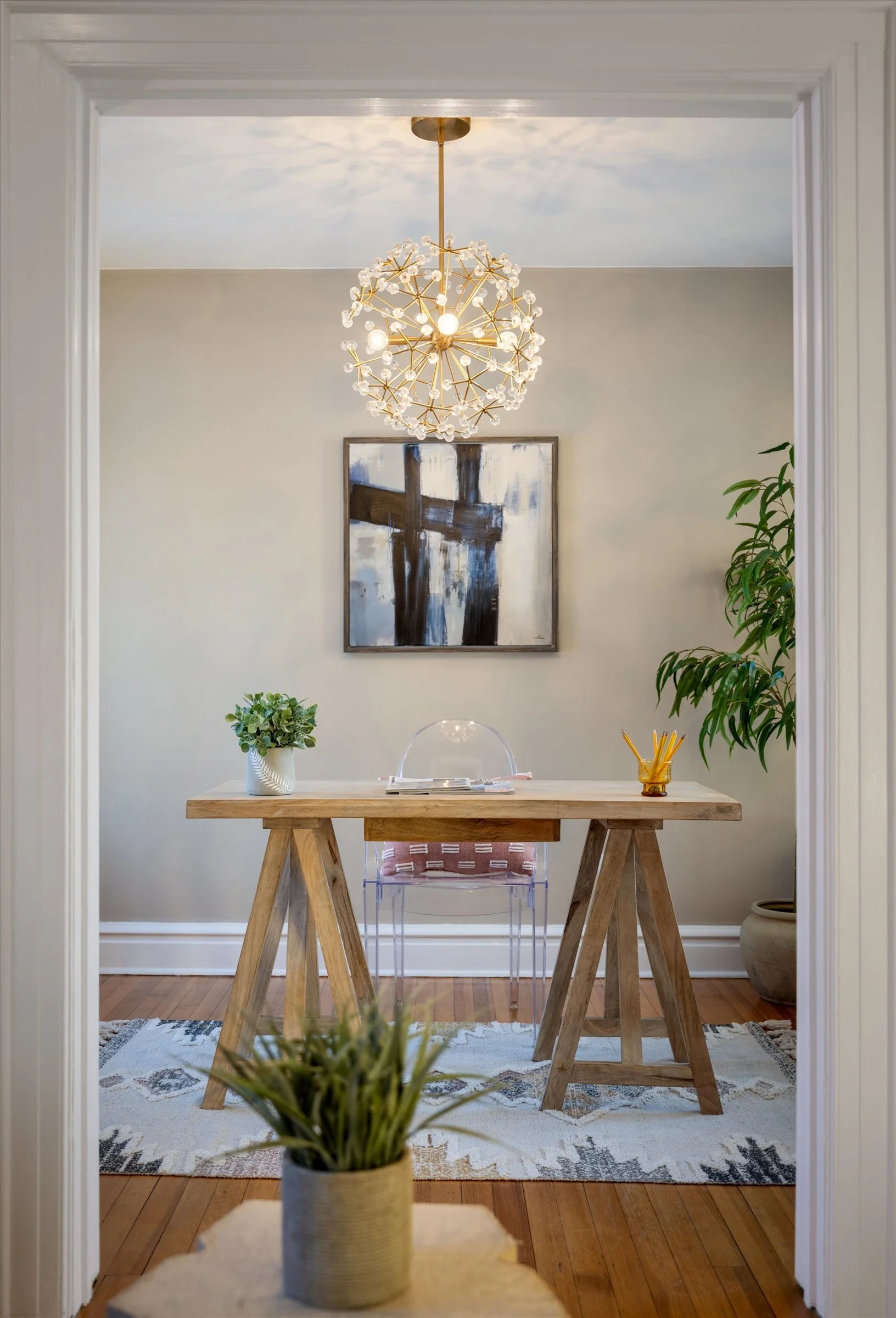 This sundrenched office is graced with gorgeous original windows that flood the space with light, making your work day cheerier. Tucked away to the side of the house this office provides privacy and ample space for working from home. Enjoy working in style with the beautiful pendant light overhead.