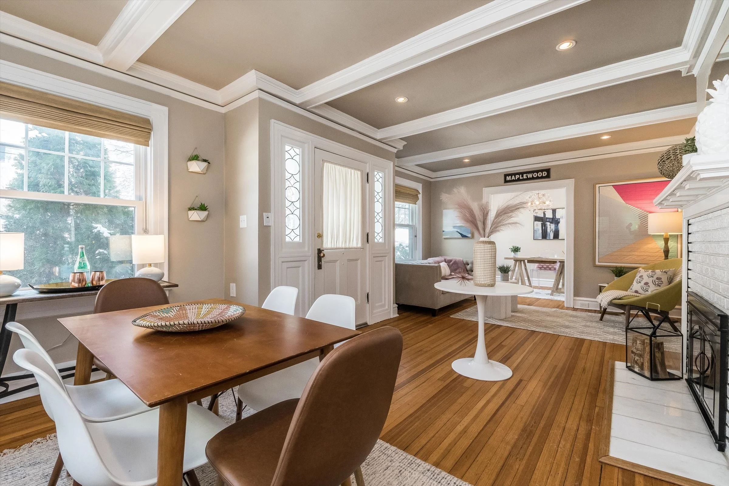 This inviting living area is the perfect spot for morning coffee or sharing a cocktail with friends. The sparkling light of the front windows create a warmth and glow that envelopes you. Flowing easily to the dining area, entertaining is seamless. Enjoy the warmth of the fireplace on those cold winter days.