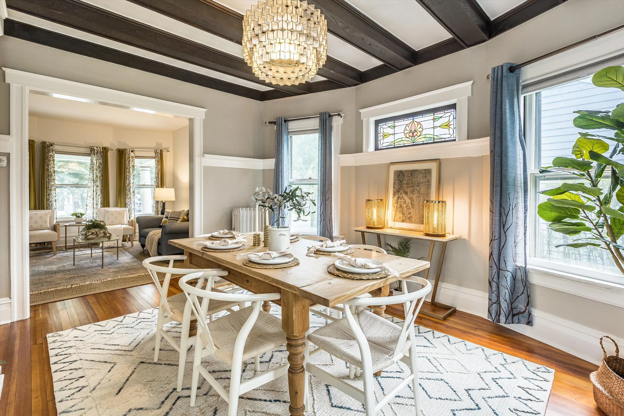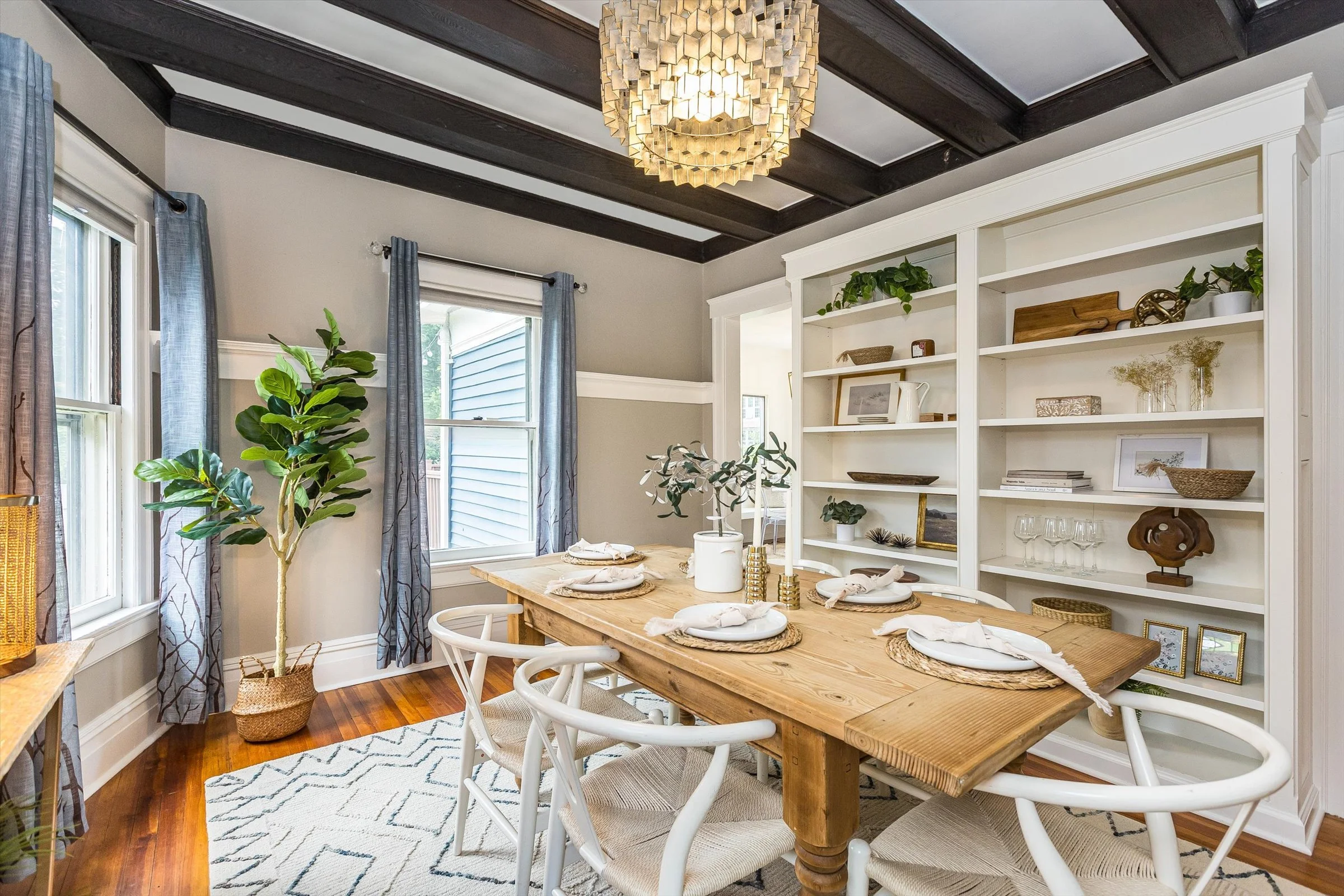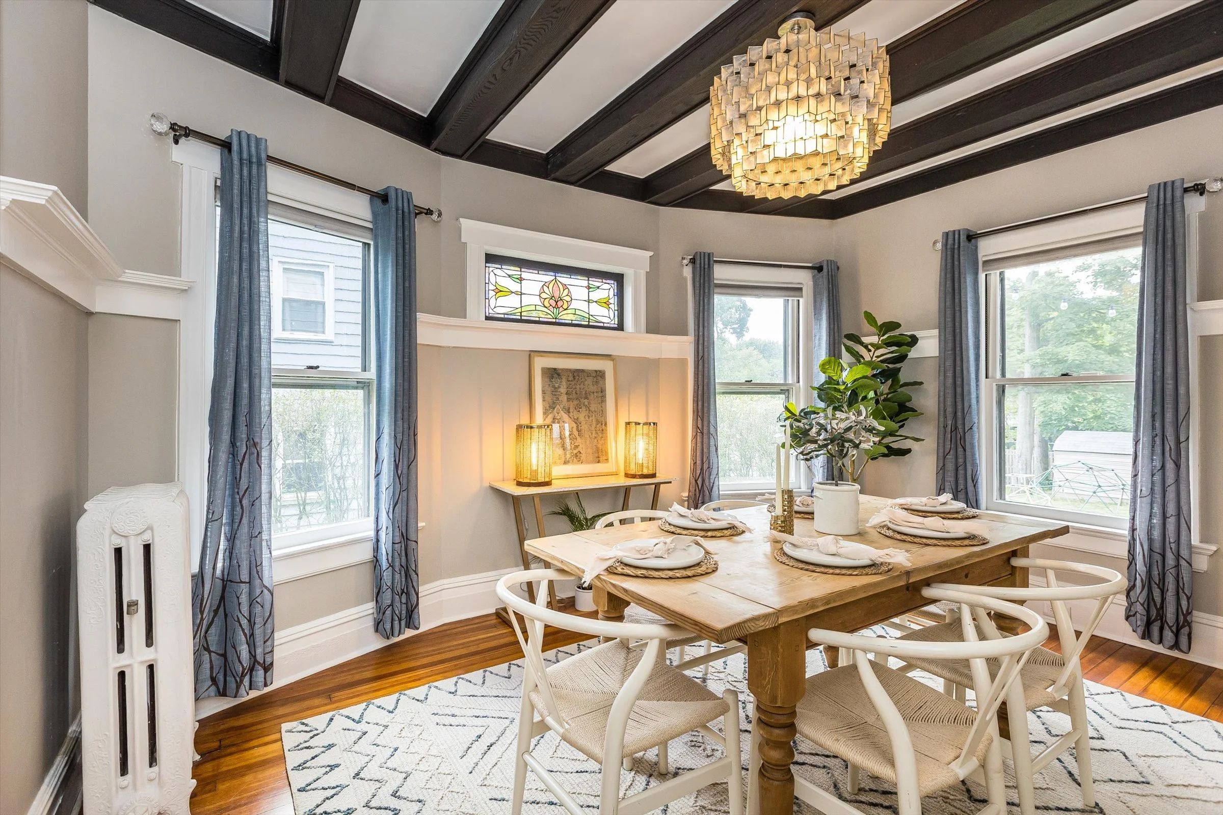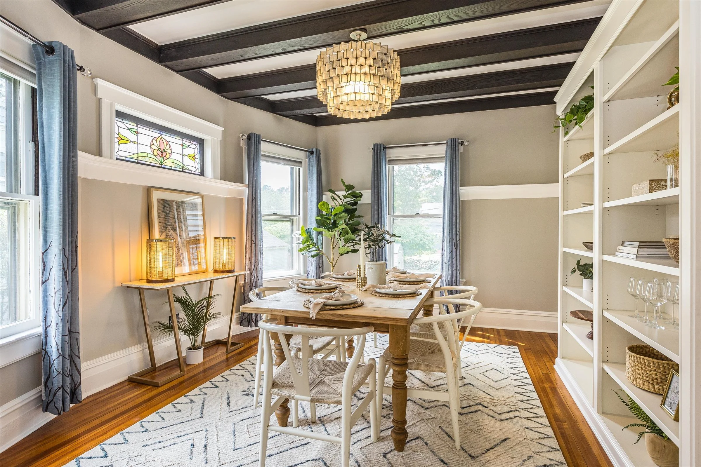 “The dining room has 3 incredible features: a stained-glass window, an incredible ceiling with original wood beams, and a beautiful and capacious built-in bookcase.”