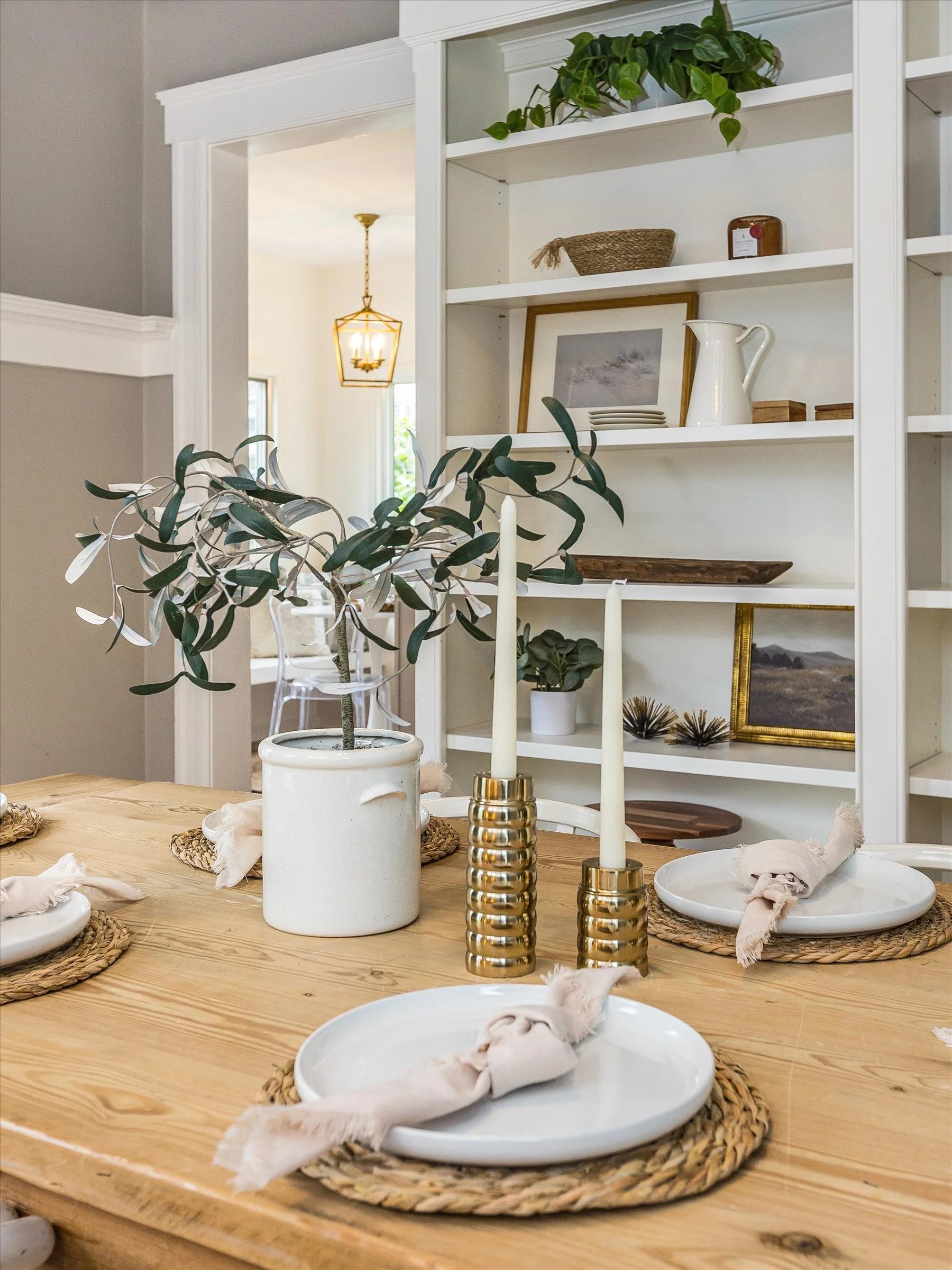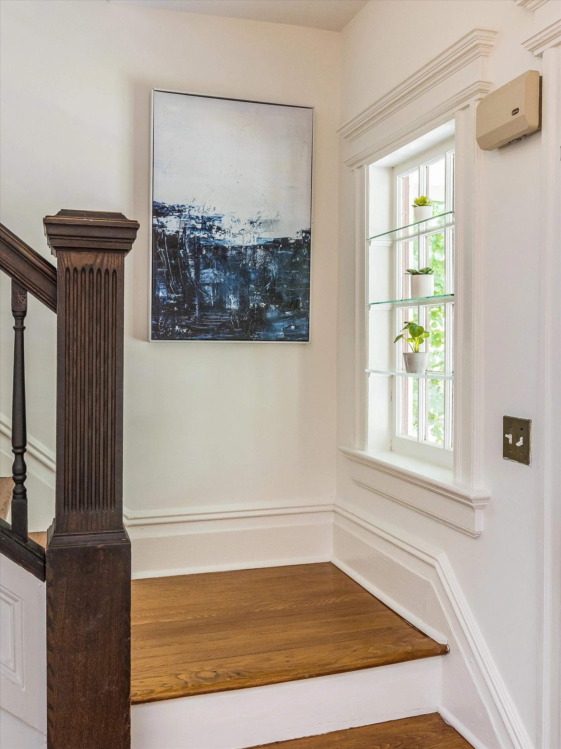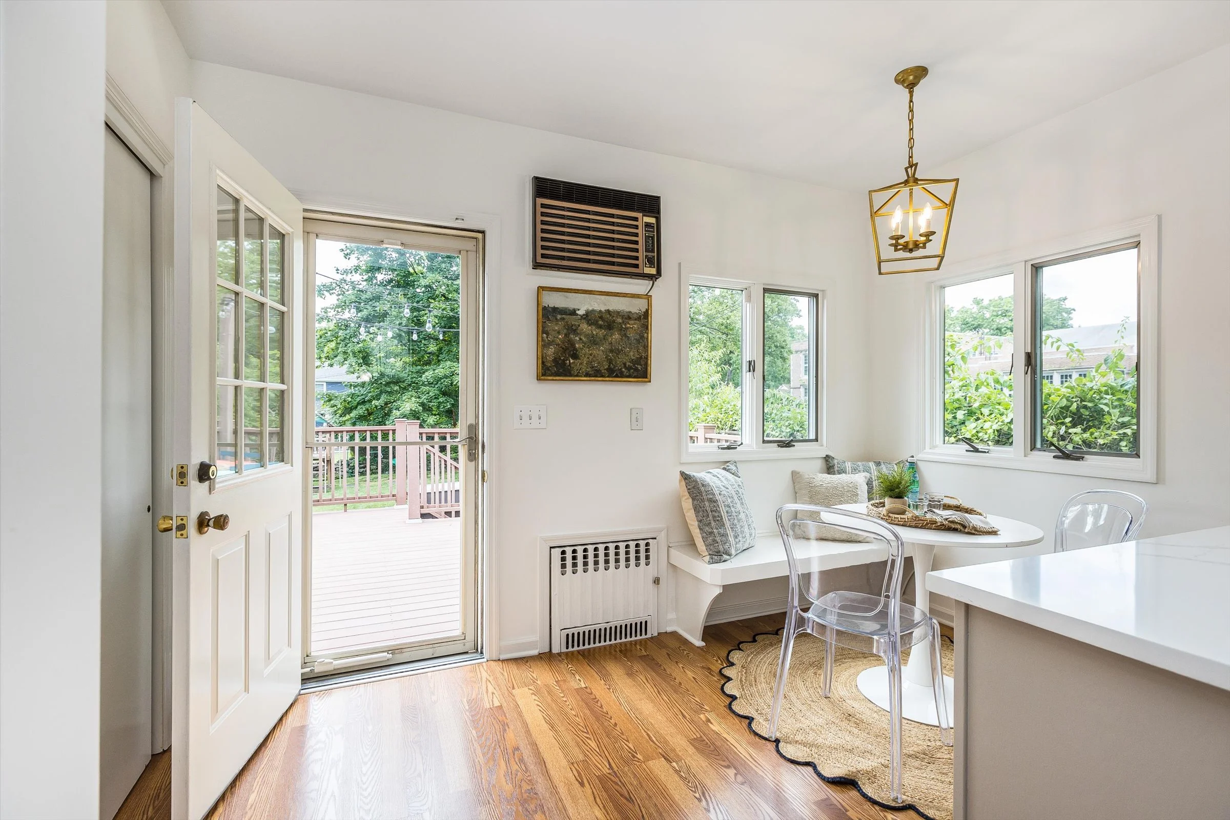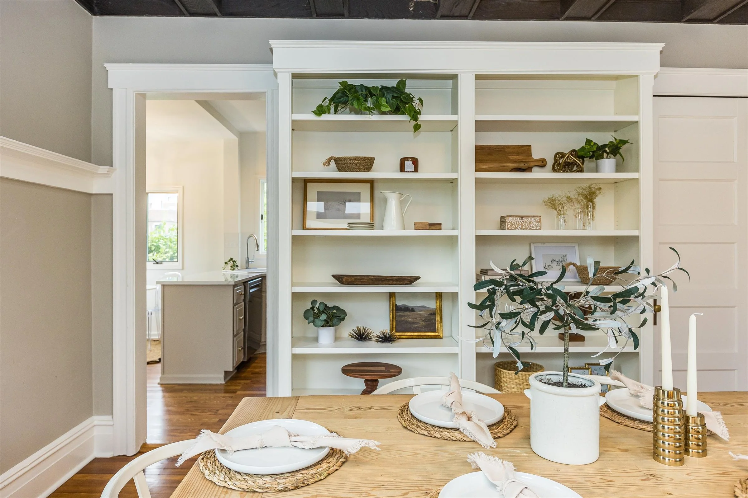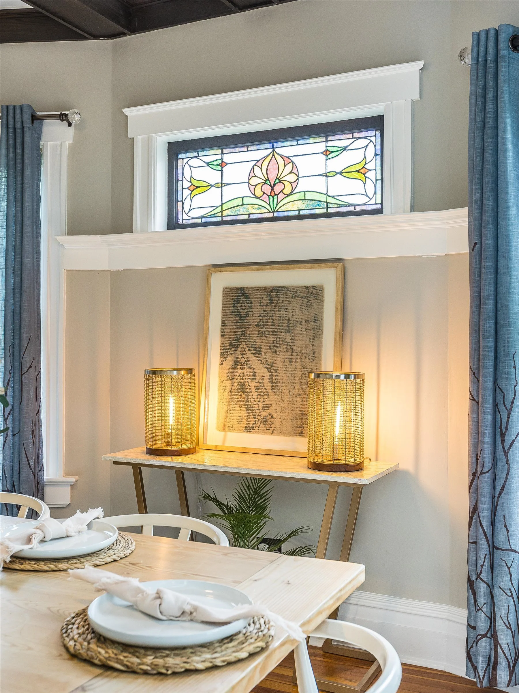 “The dining room has 3 incredible features: a stained-glass window, an incredible ceiling with original wood beams, and a beautiful and capacious built-in bookcase.”