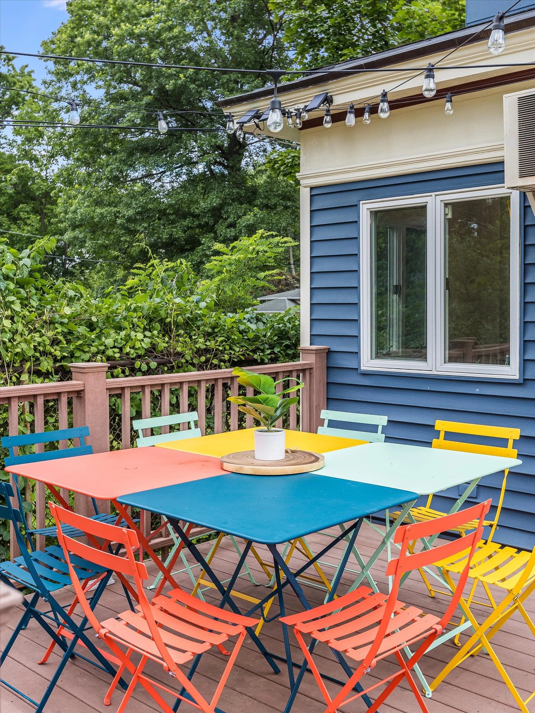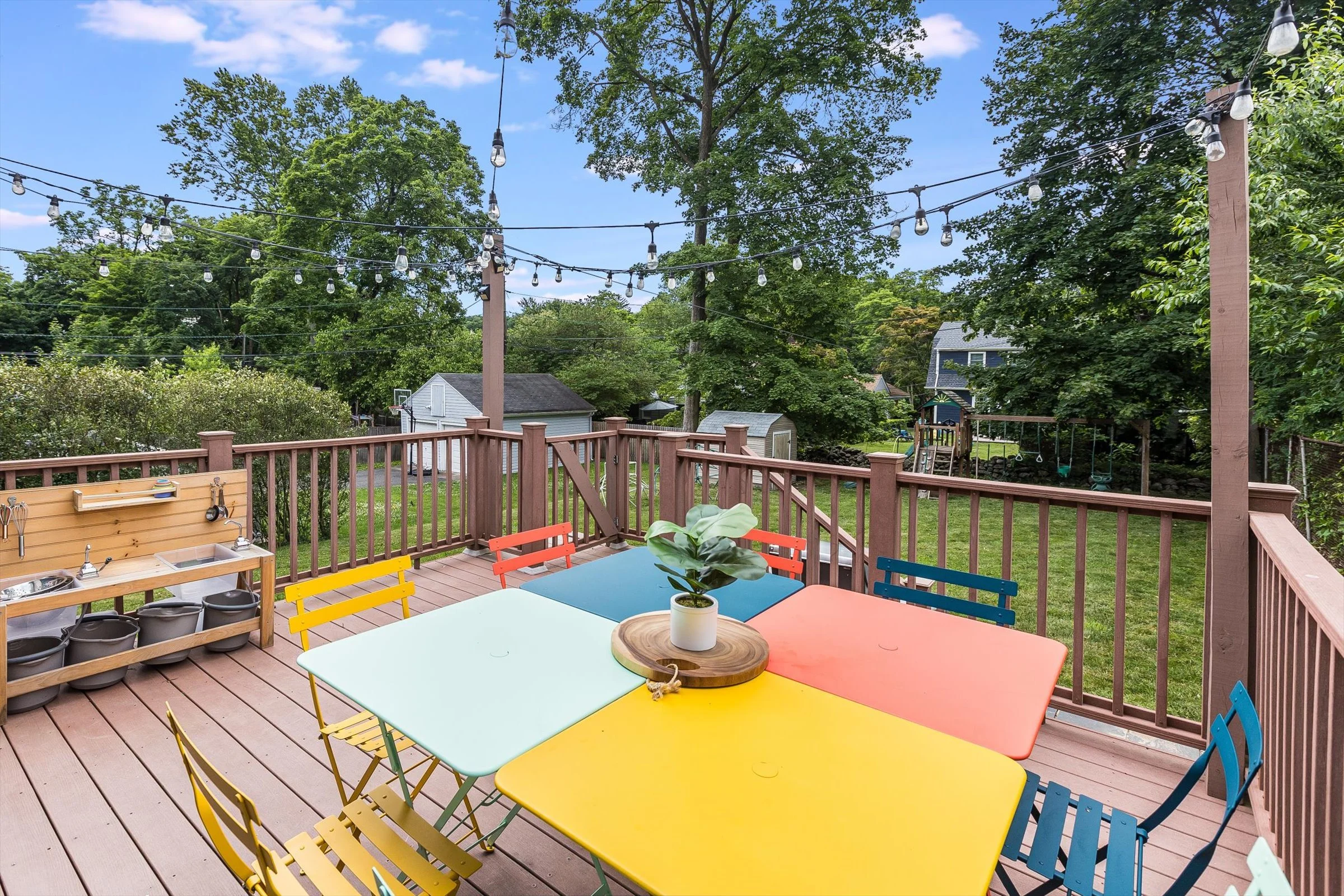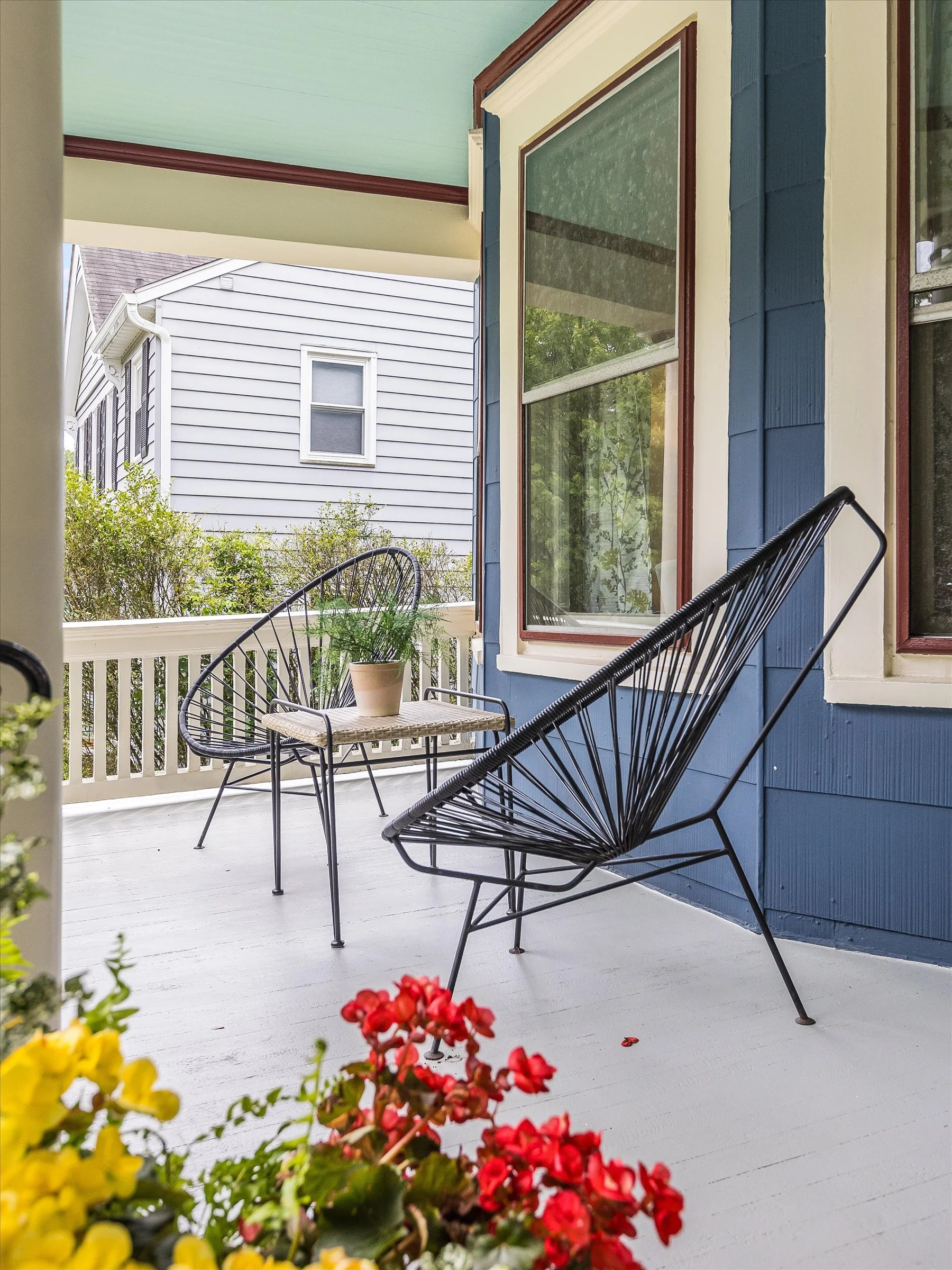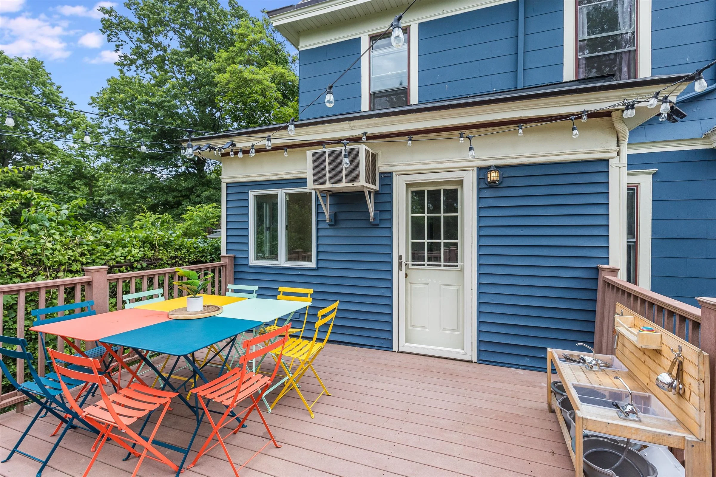 “The backyard is an incredible play and hosting space with a deck (and a slide down from the deck for kids), swingset, and large lawn. The front porch is beautiful and calming. It’s wonderful to sit there (cozy and dry) during a rainstorm, or to chat with a friend on a lovely night. The house is also right next door to Montrose preschool!