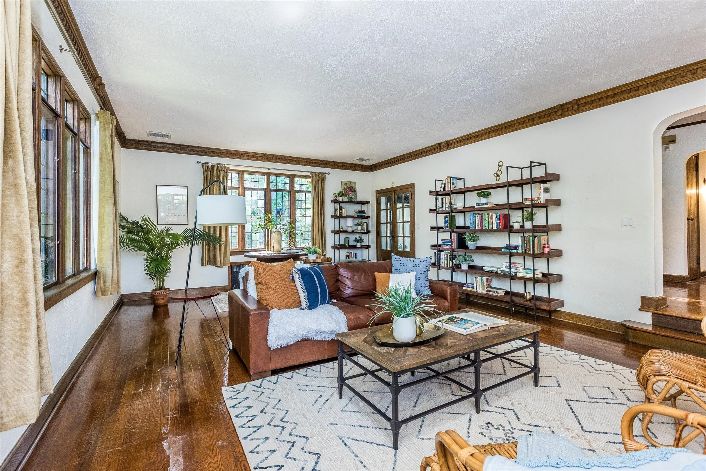 Storybook charm awaits at this bright and airy Tudor in one of Maplewood's most inviting neighborhoods. This gorgeous 4BR home features 4 bathrooms and expansive living space wrapped in elegant craftsmanship and beauty. Plus, newly renovated front porch and exquisite side masonry create an historic home ready for its next hundred years! Step through the arched doorway to find a home with original hardwood floors, chestnut moldings, and light pouring in from the Craftsman style stained leaded-glass windows. The first floor features a large sunken Living Room with stone fireplace, spacious Dining Room, and recently updated Kitchen with a light filled Breakfast Room. There is also a First Floor Bedroom with an ensuite full bathroom, cute Powder Room, and an indoor patio Sunroom that is an entertainer's dream! Climb the lovely stairs with wrought iron banister to find an oversized Primary Suite with accompanying full bath, two more large bedrooms, and a classically detailed hallway bath. The basement features a large Bonus Room, perfect for a playroom or home gym, another full bath, storage space, and laundry room. The handsomely landscaped and hardscaped outdoor space and a neighborhood that features an amazing annual block party make this home a true treasure for its next owner!