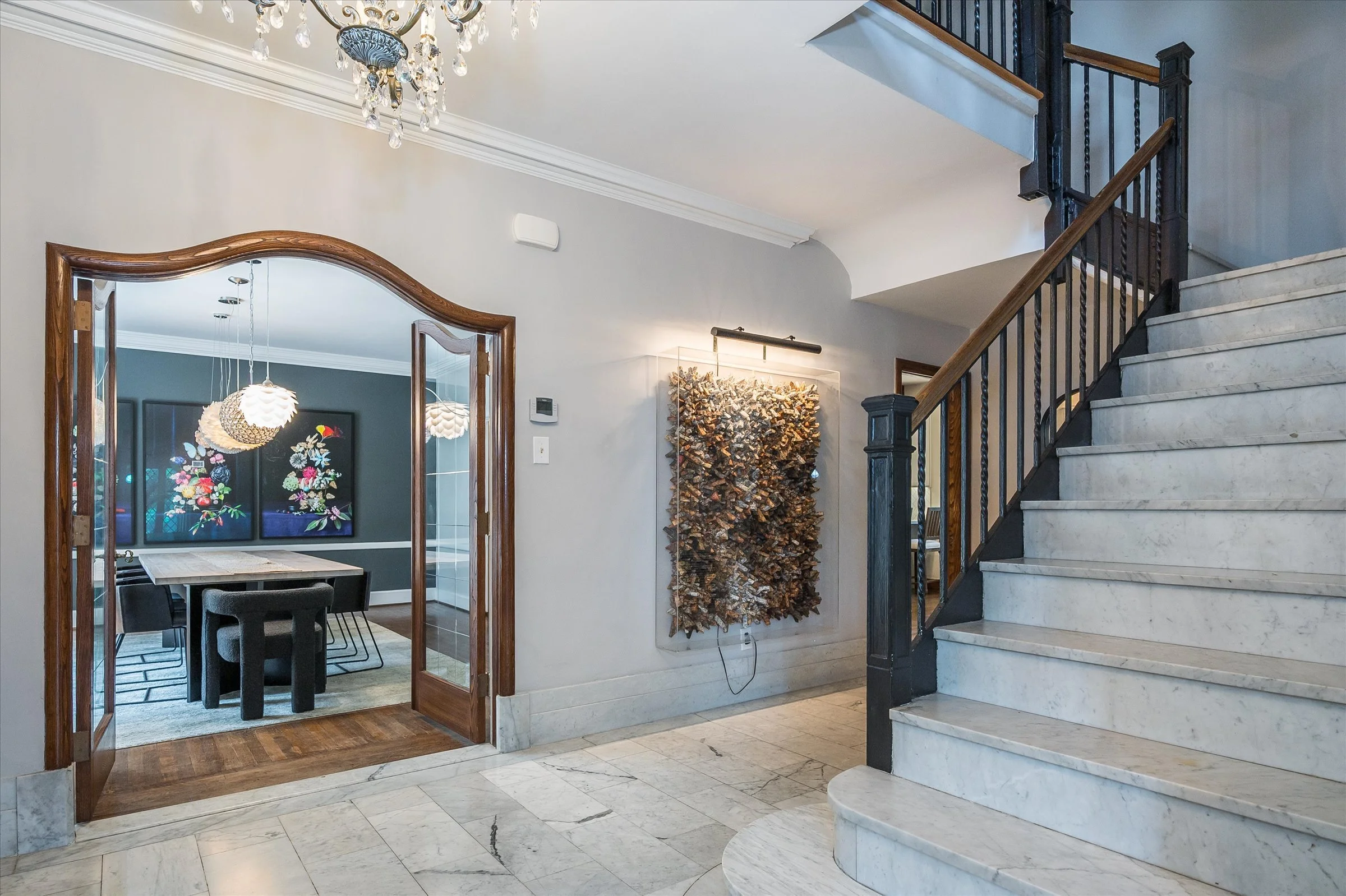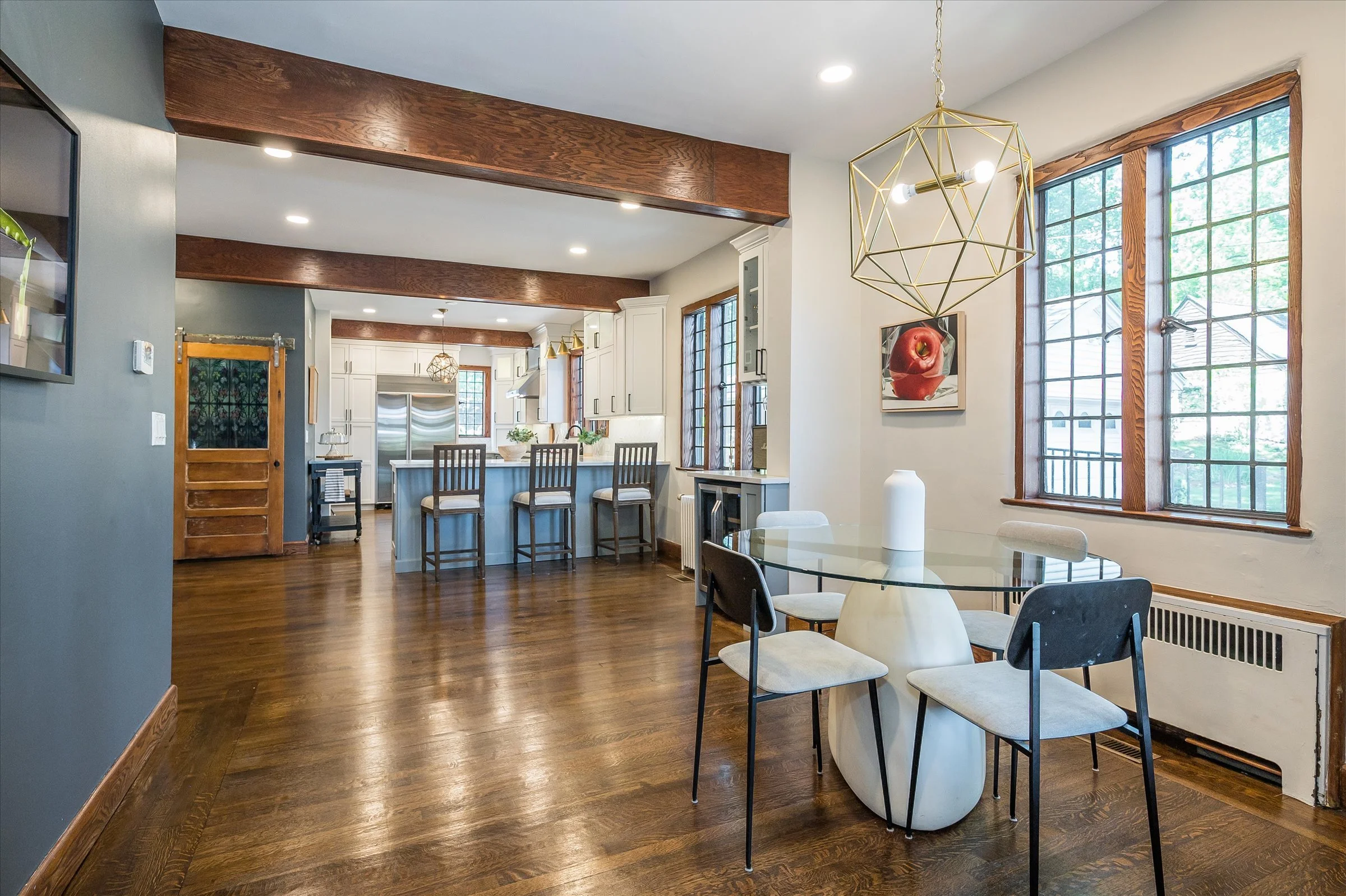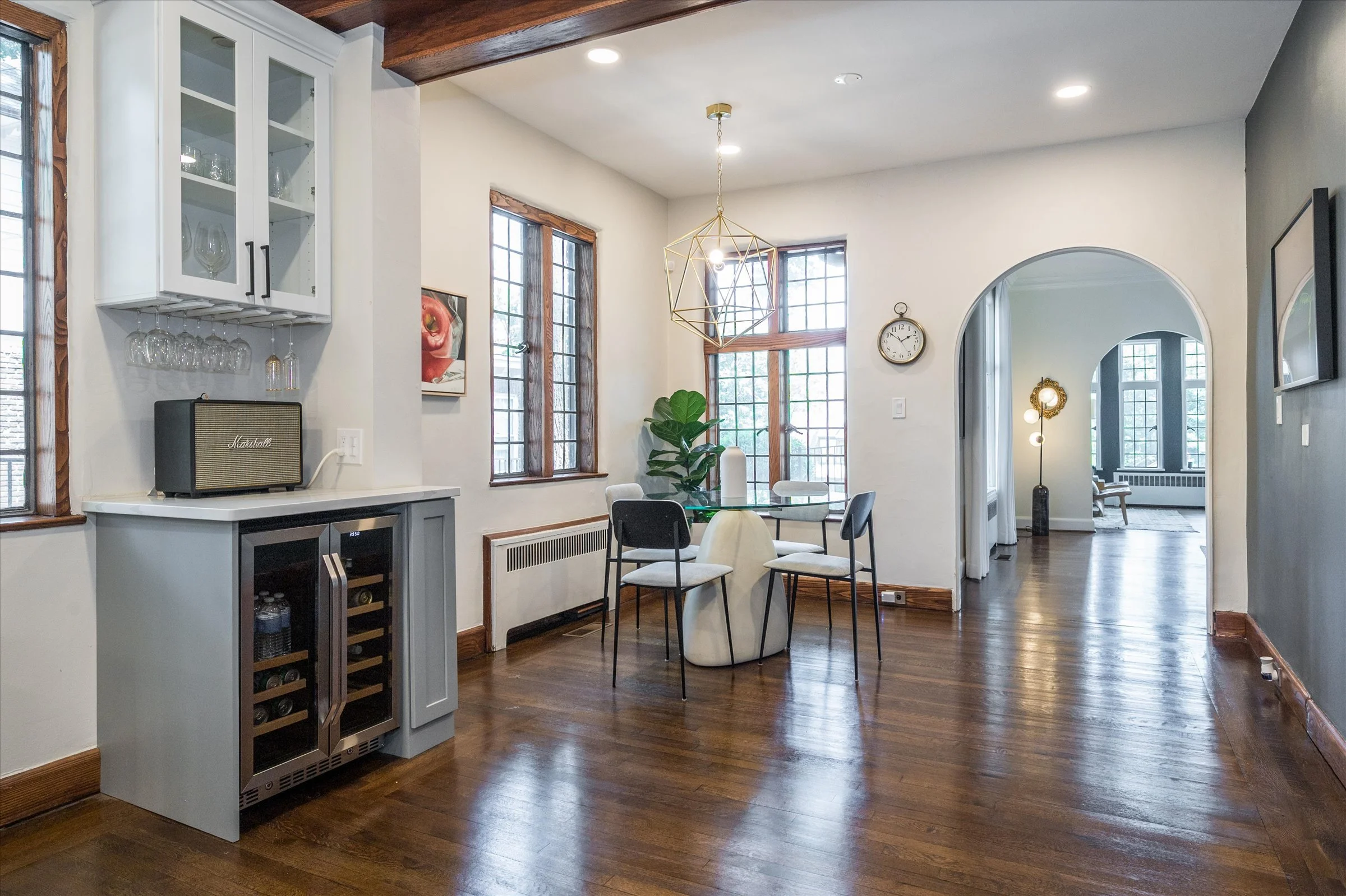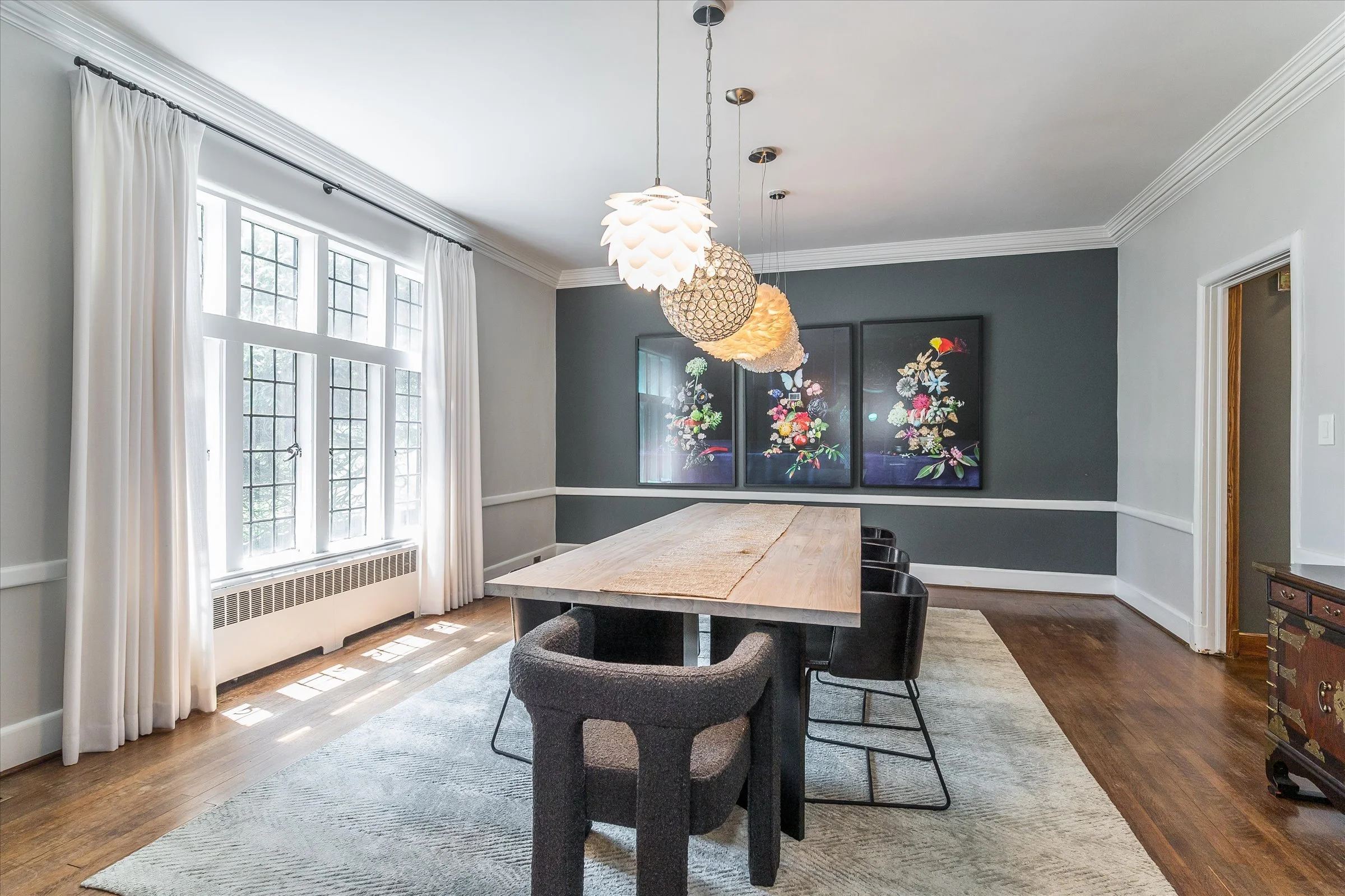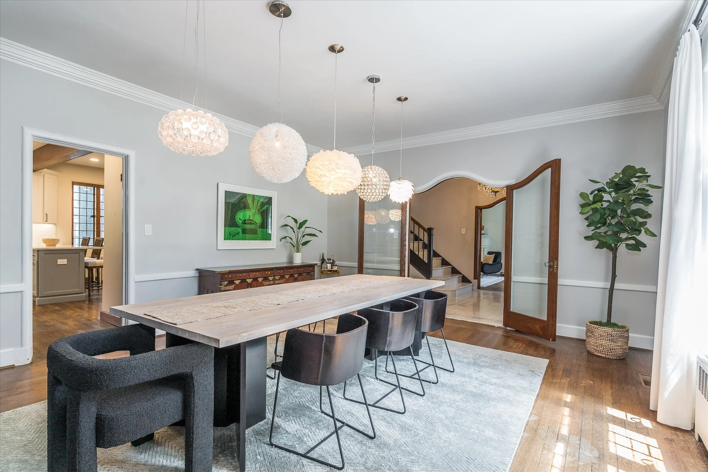 “The dining room boasts ample space, capable of accommodating a large table that comfortably seats 10-12 people. The wine nights hosted in this room have been a resounding success, creating an inviting atmosphere that made everyone feel special and welcomed. The five ceiling lights add an iconic touch to the dining room’s aesthetic appeal. Conveniently located and easily accessible from the kitchen, the dining room features beautiful doors that further enhance its charm.”