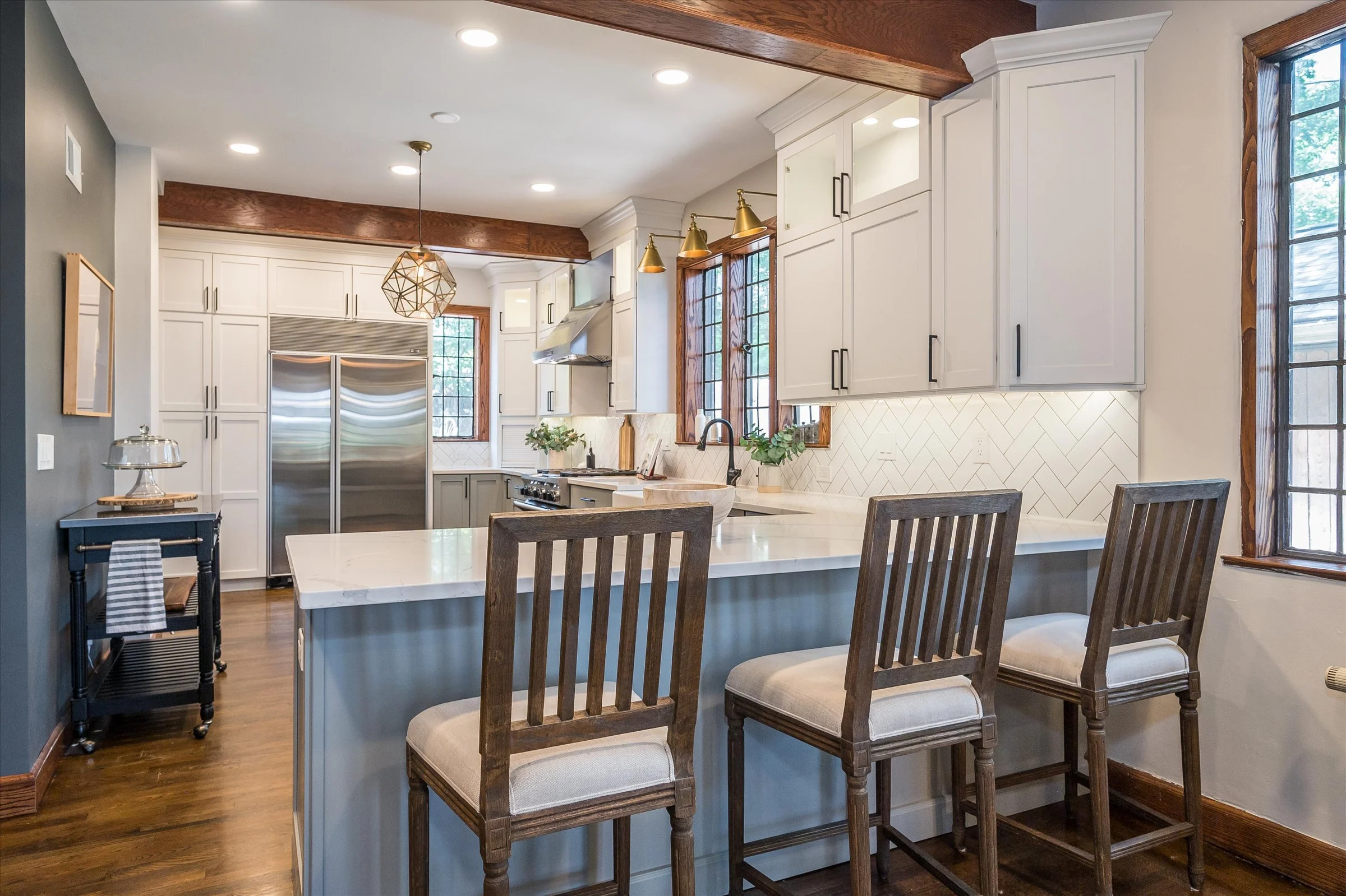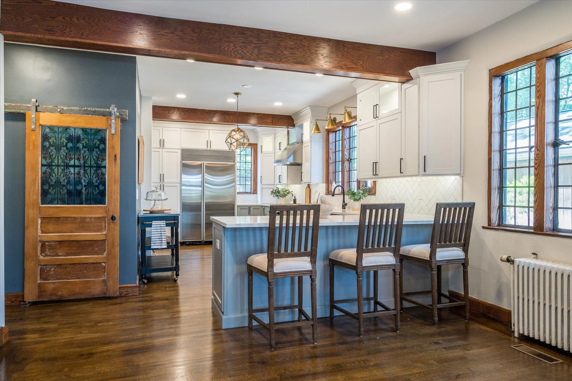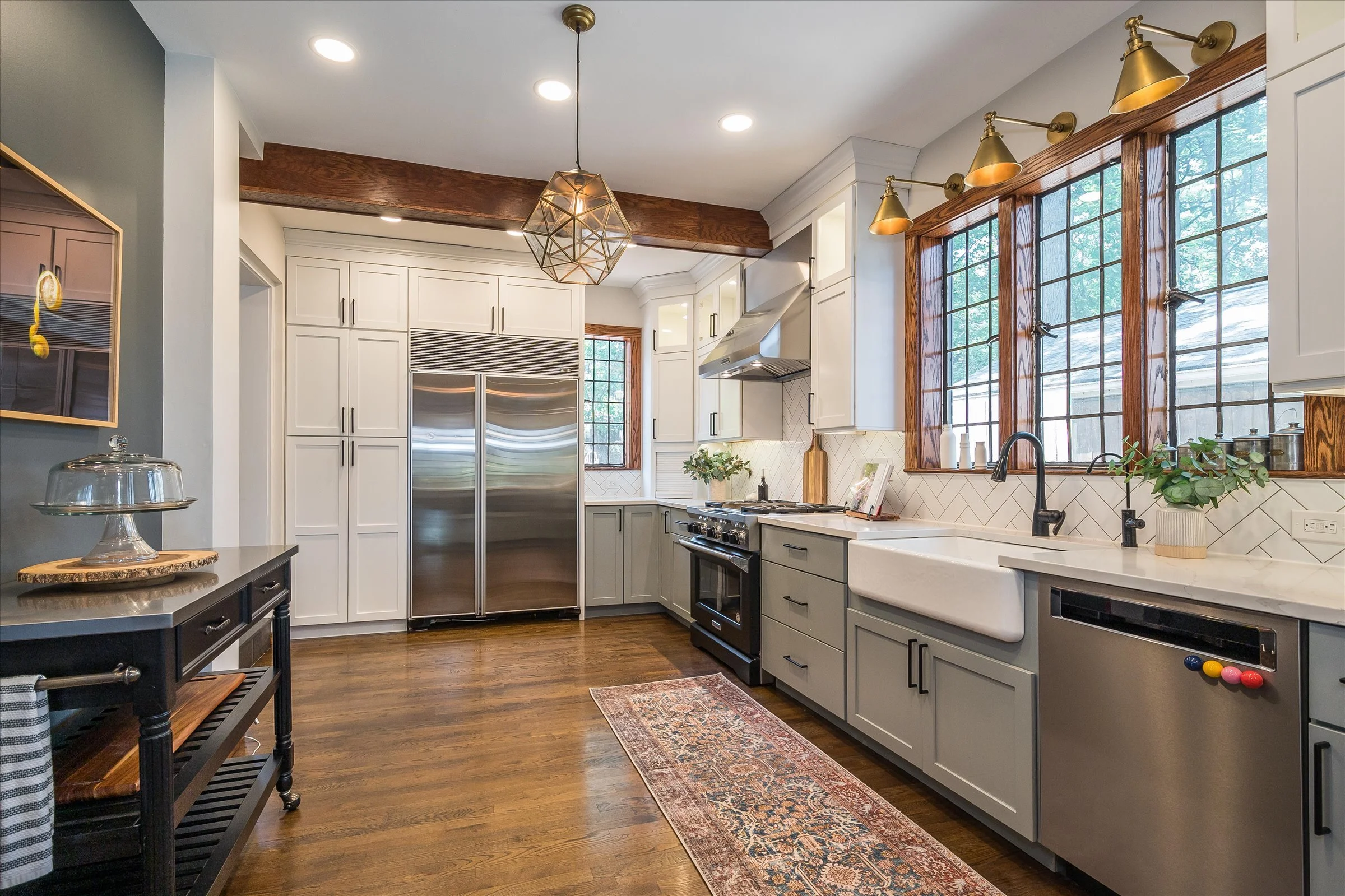 “The kitchen has been thoughtfully designed to ensure convenience and functionality. It provides ample storage space for all the necessary kitchen-related items, allowing for easy organization and accessibility. The farmhouse sink is a personal favorite, adding a touch of charm to the overall design. Furthermore, the attached garage located near the backdoor makes it incredibly convenient to unload groceries directly into the kitchen. An interesting touch to the kitchen’s aesthetic is the blueish gray color of the bottom side cabinets, adding a unique and distinctive vibe to the space.