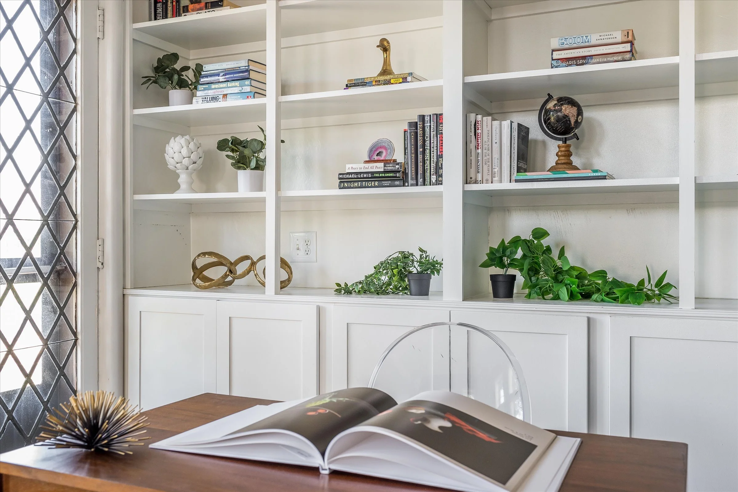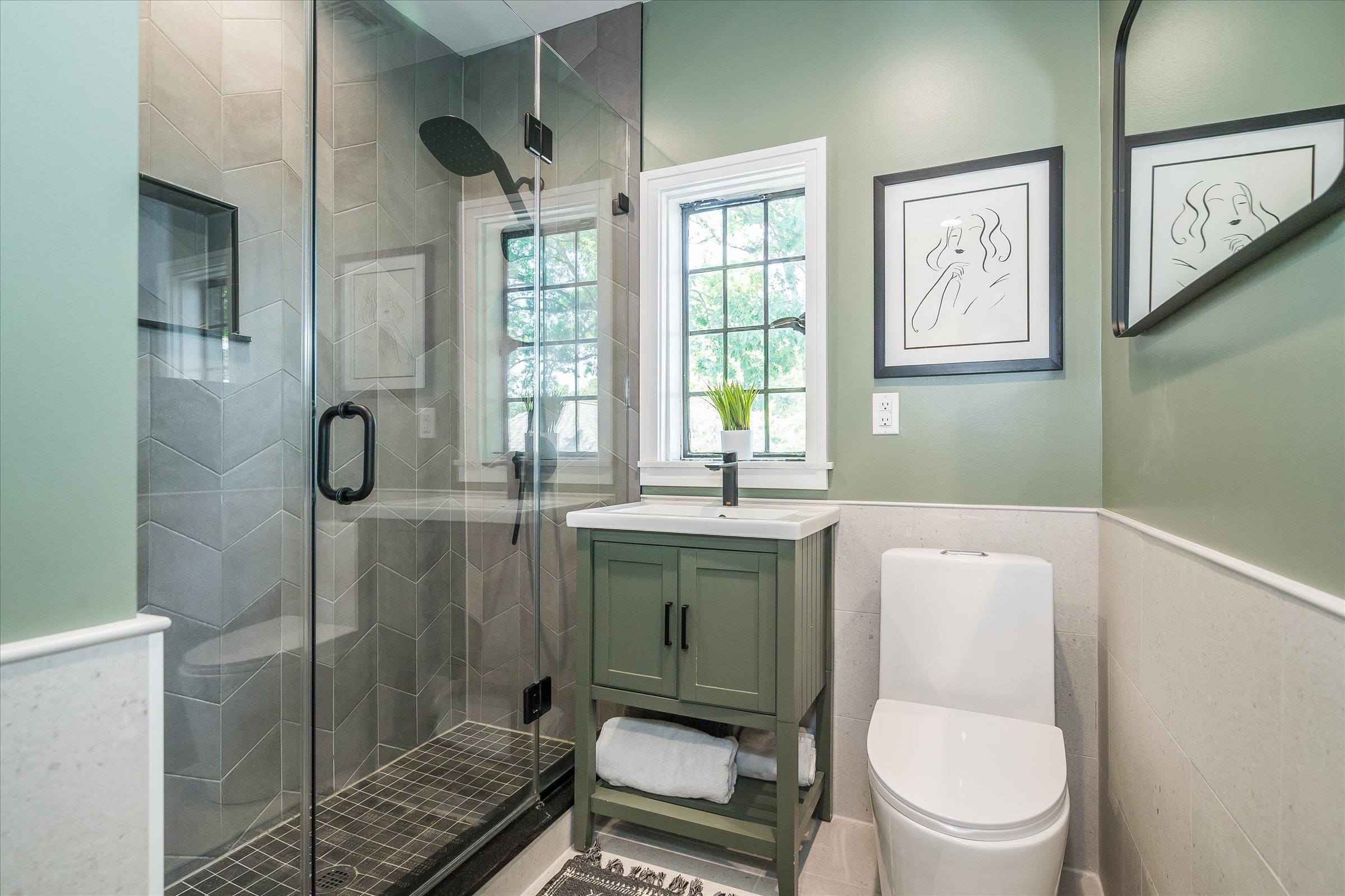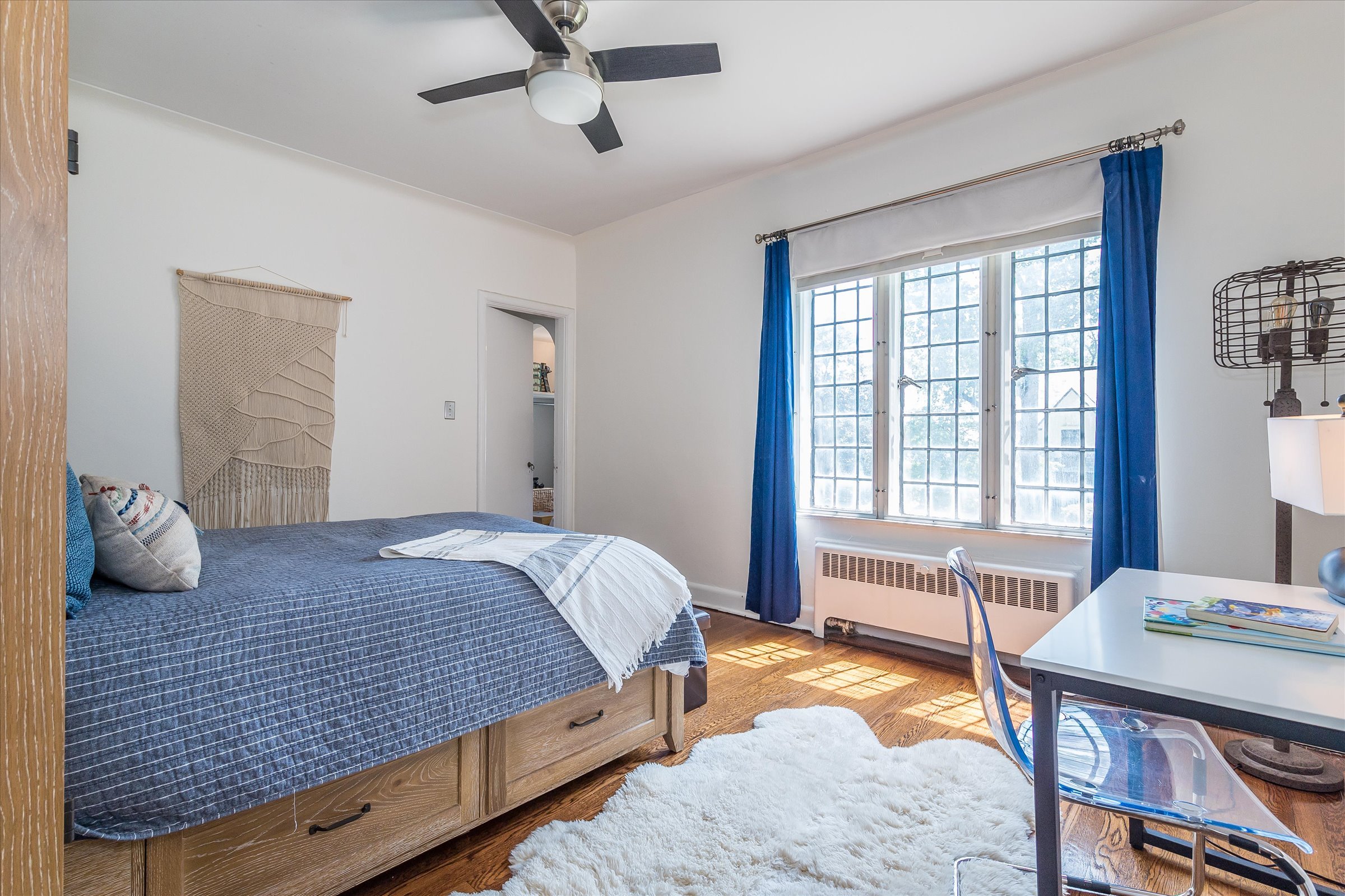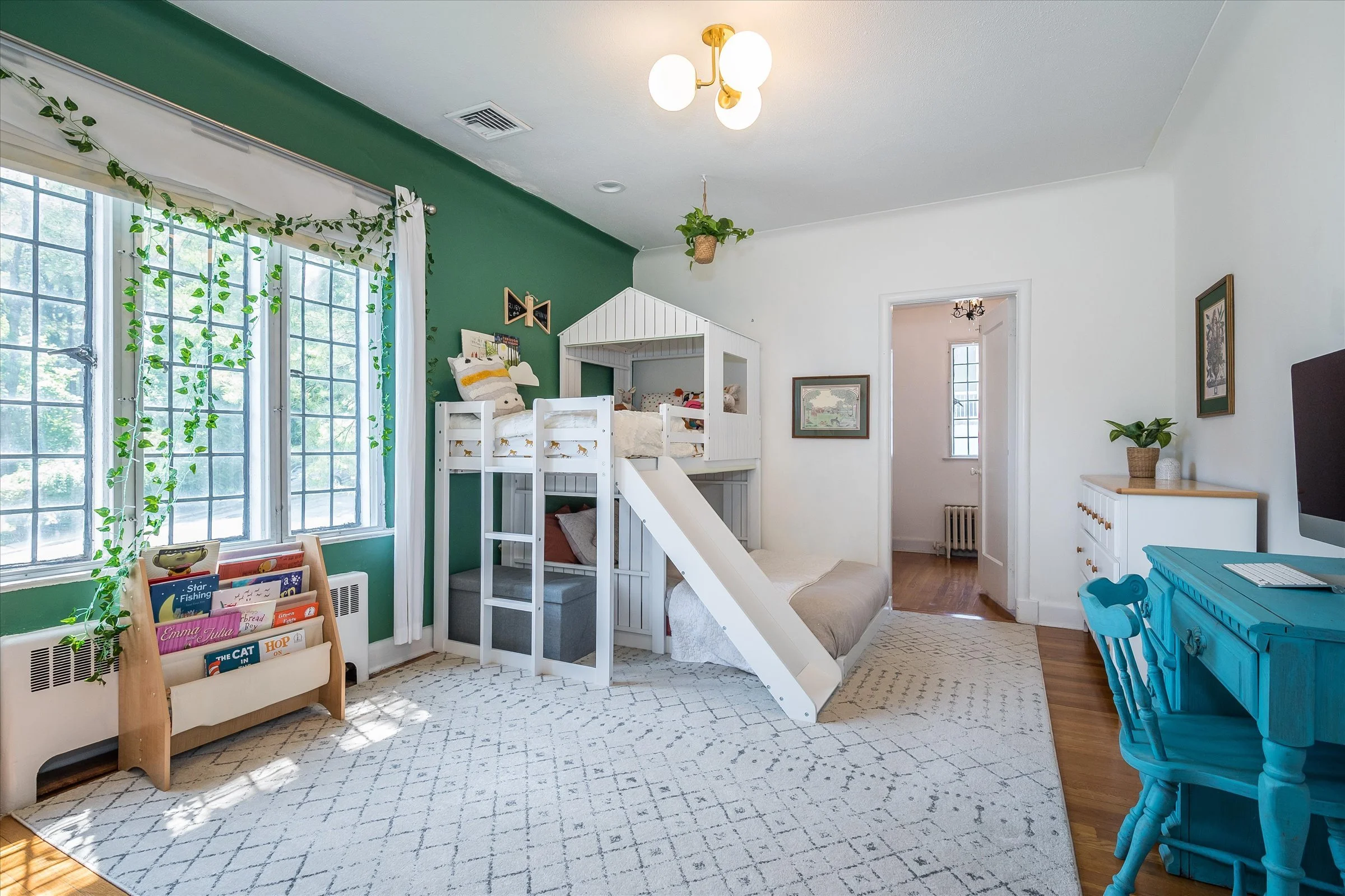 “A thoughtfully designed built-in Pottery Barn bunk bed offers a comfortable sleeping arrangement for visiting friends or cousins. Furthermore, the bathroom, which has been recently renovated, is conveniently situated adjacent to the guest bedroom, ensuring easy accessibility and added convenience.”