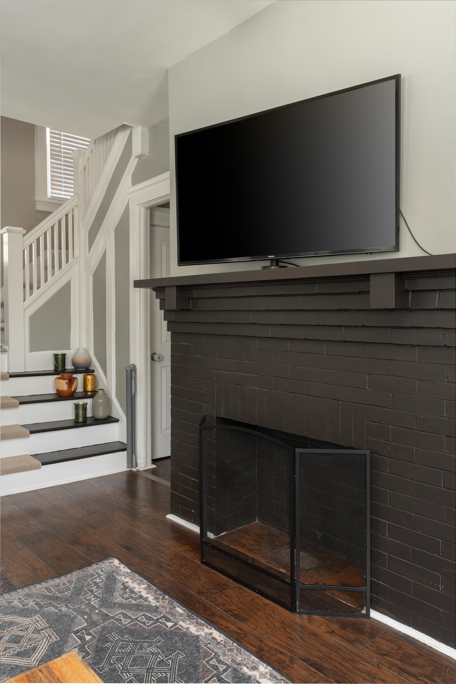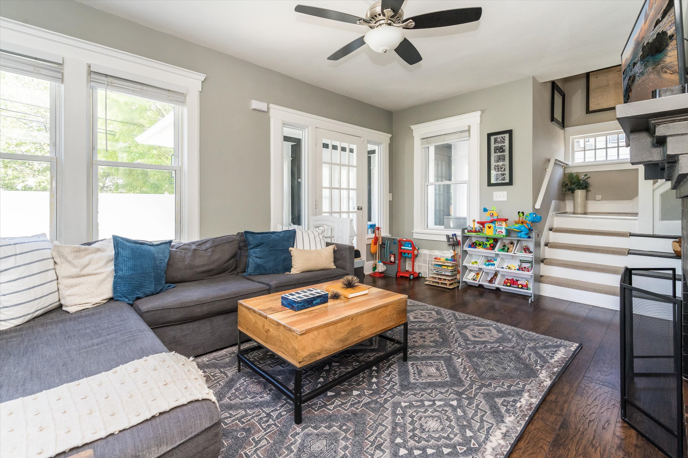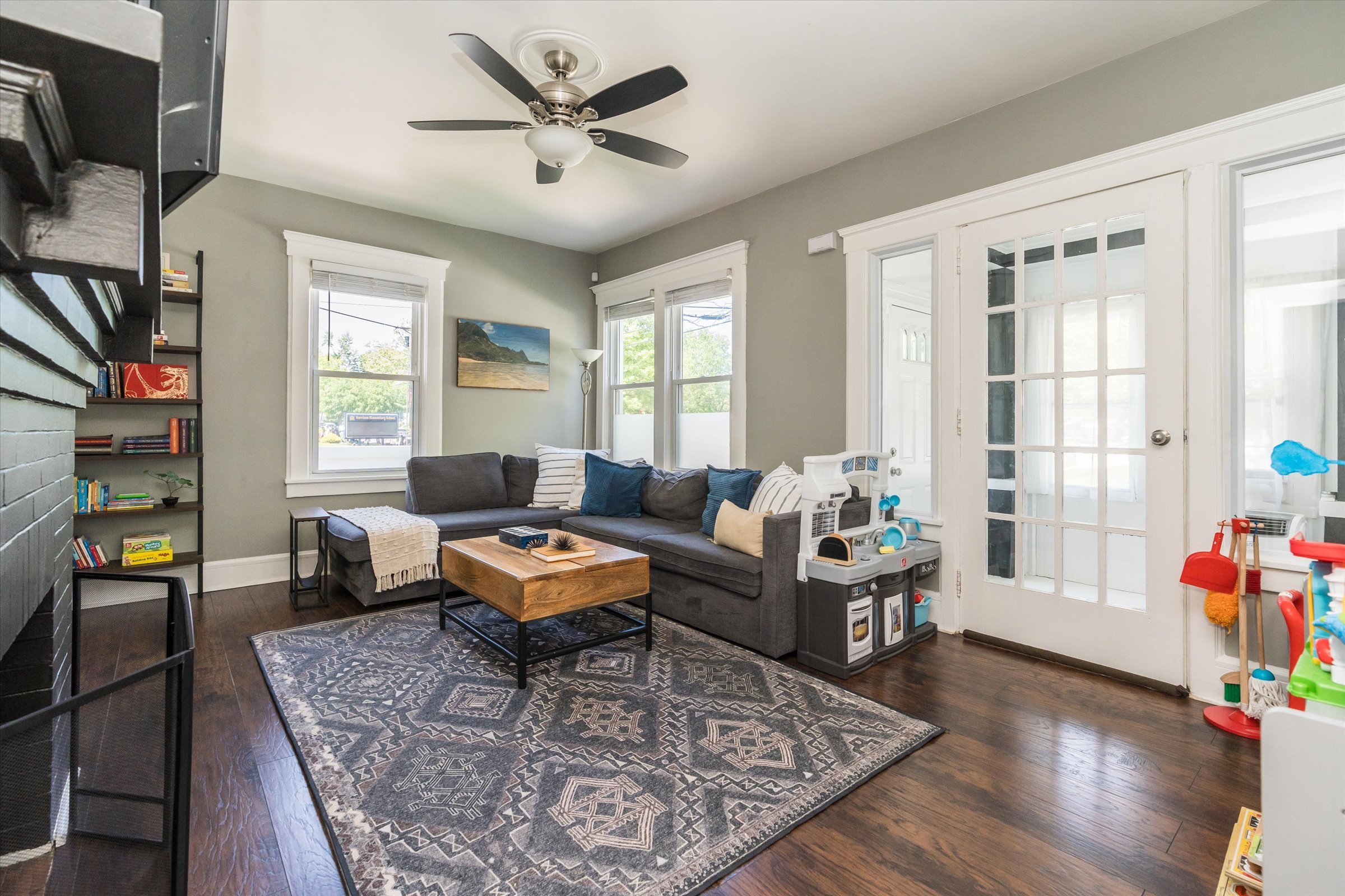 Inside, the rich history and craftsmanship shine through in the original molding and woodwork, while the living room, anchored by a decorative fireplace, serves as the heart of the home. The resilient newer wood grain flooring adds both sophistication and durability to the space.