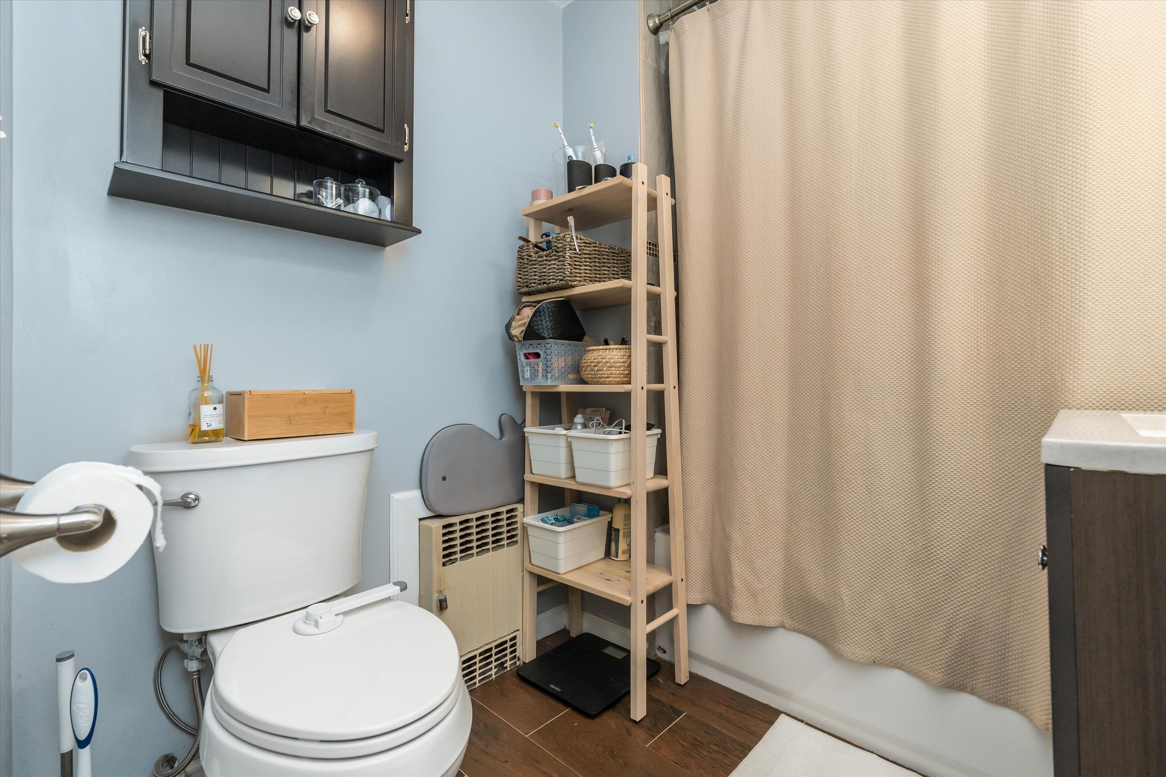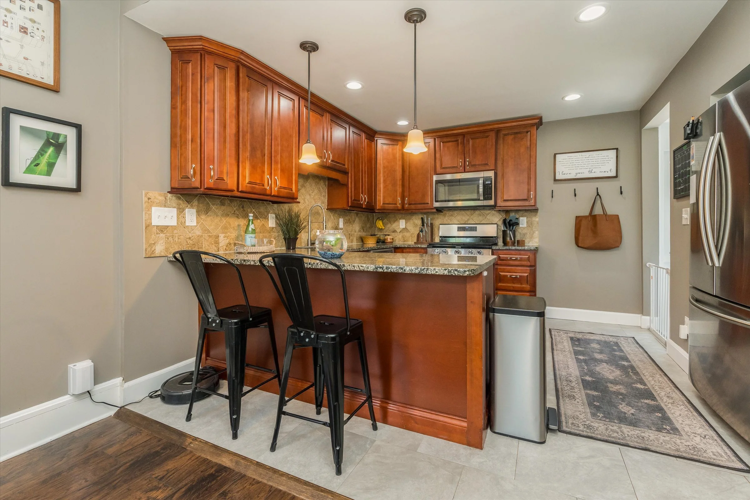 A new first-floor powder room boasts a charming brick wall and modern hexagon tile accents. Upstairs, three generously sized bedrooms offer plenty of space for relaxation, & abundant storage to keep things organized. The updated bathroom, with its classic tub and clean lines, offers a serene escape from the day's hustle and bustle.