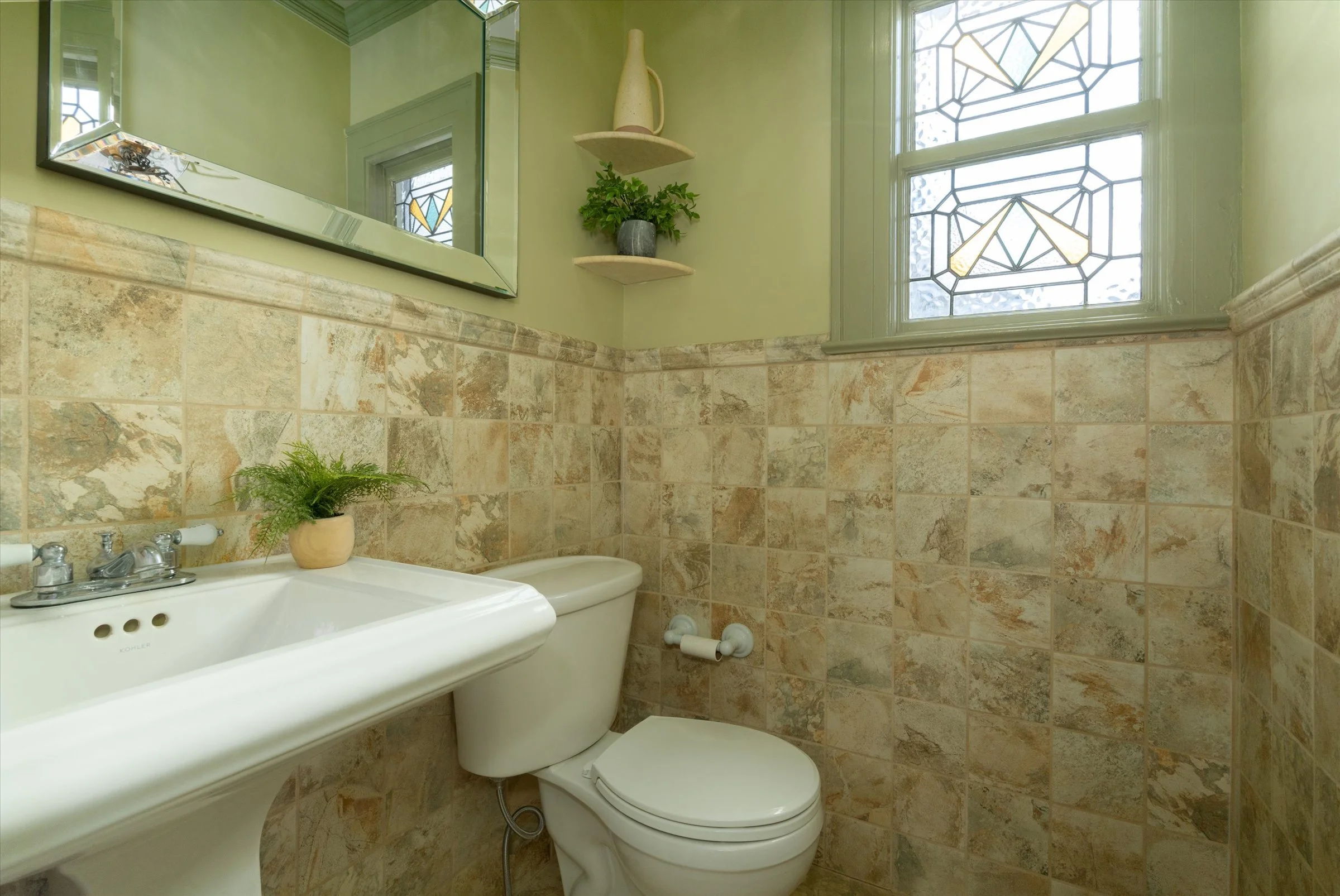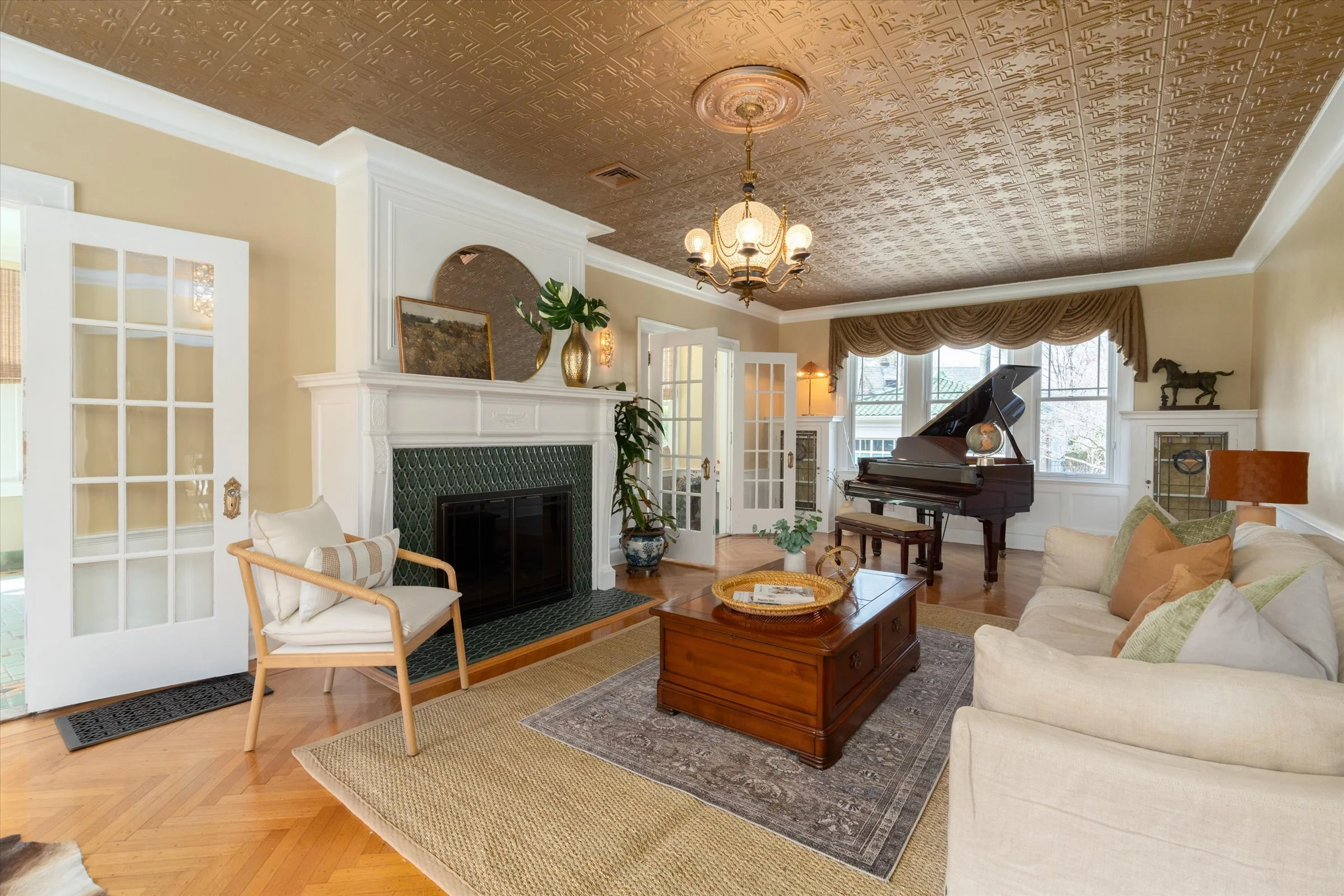 Living room featuring original period built-ins and stained glass
