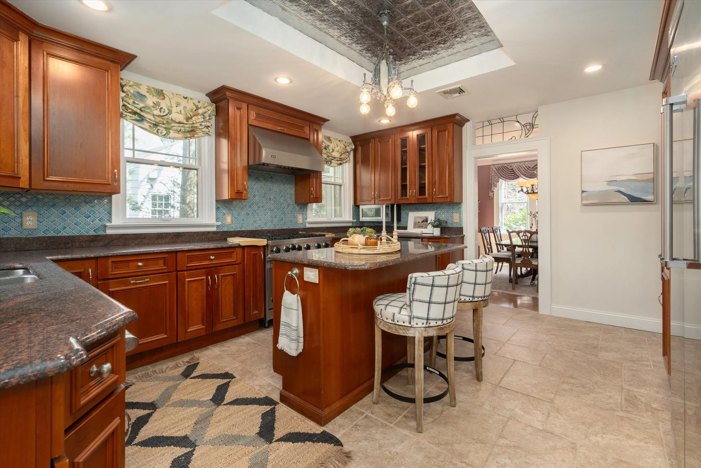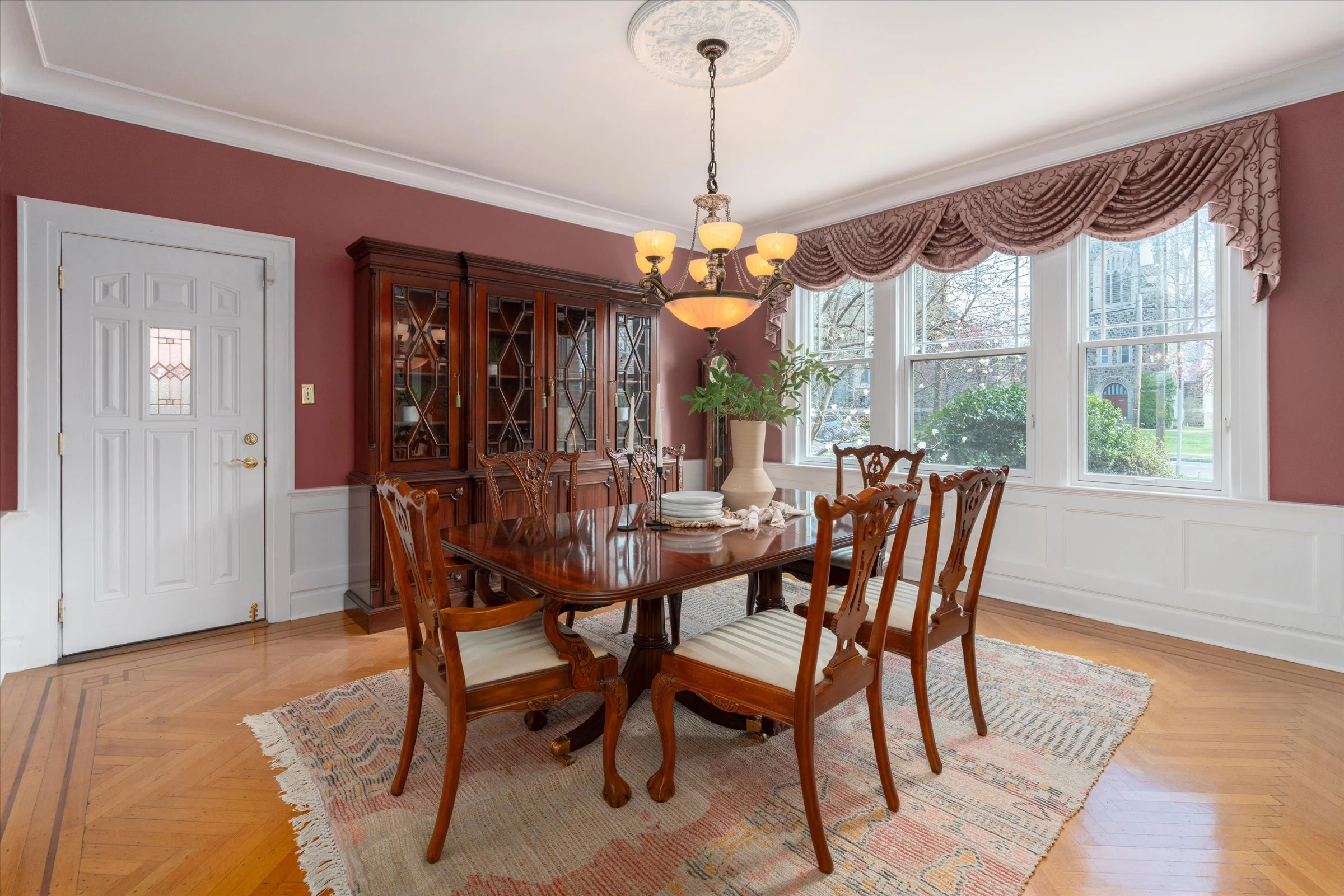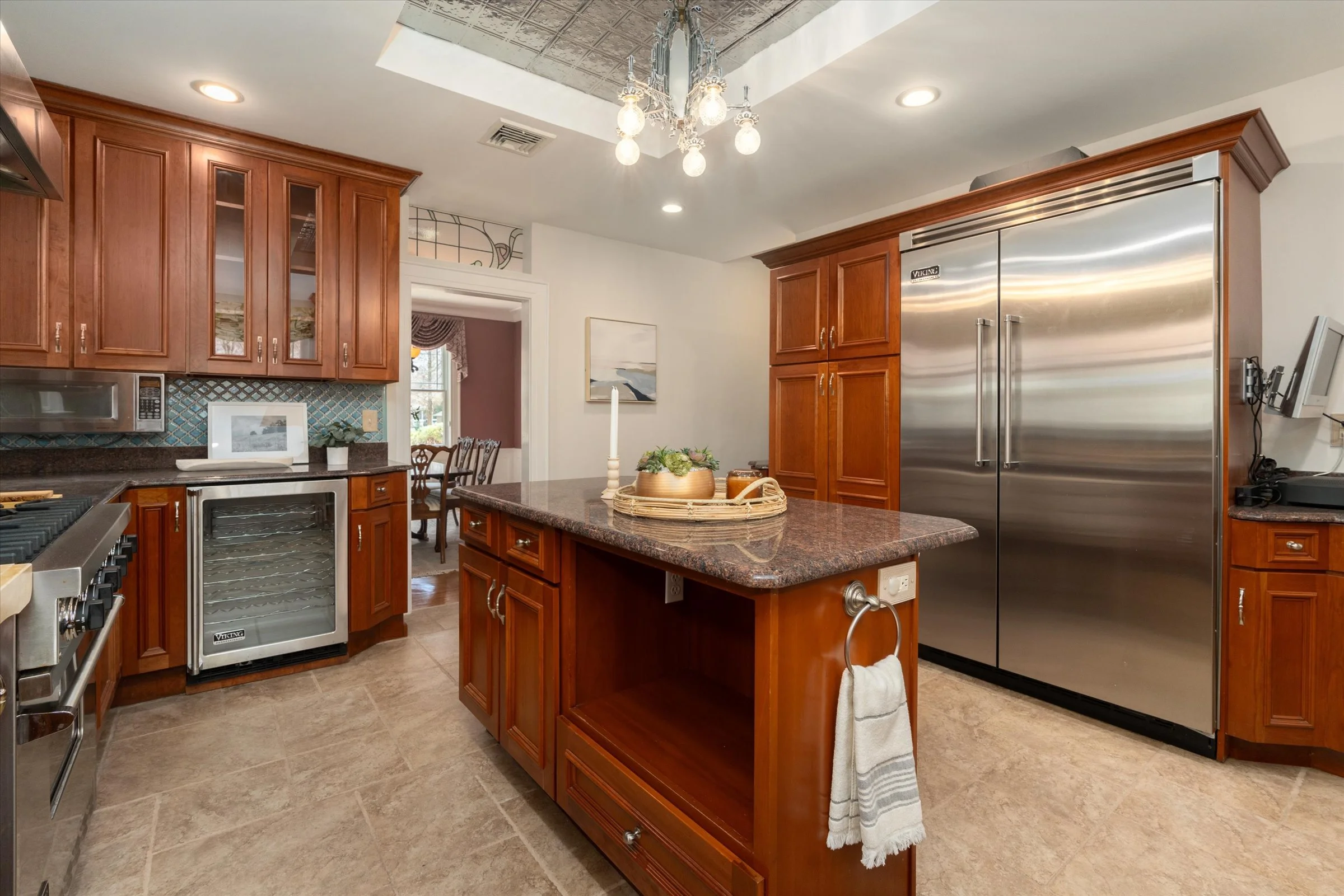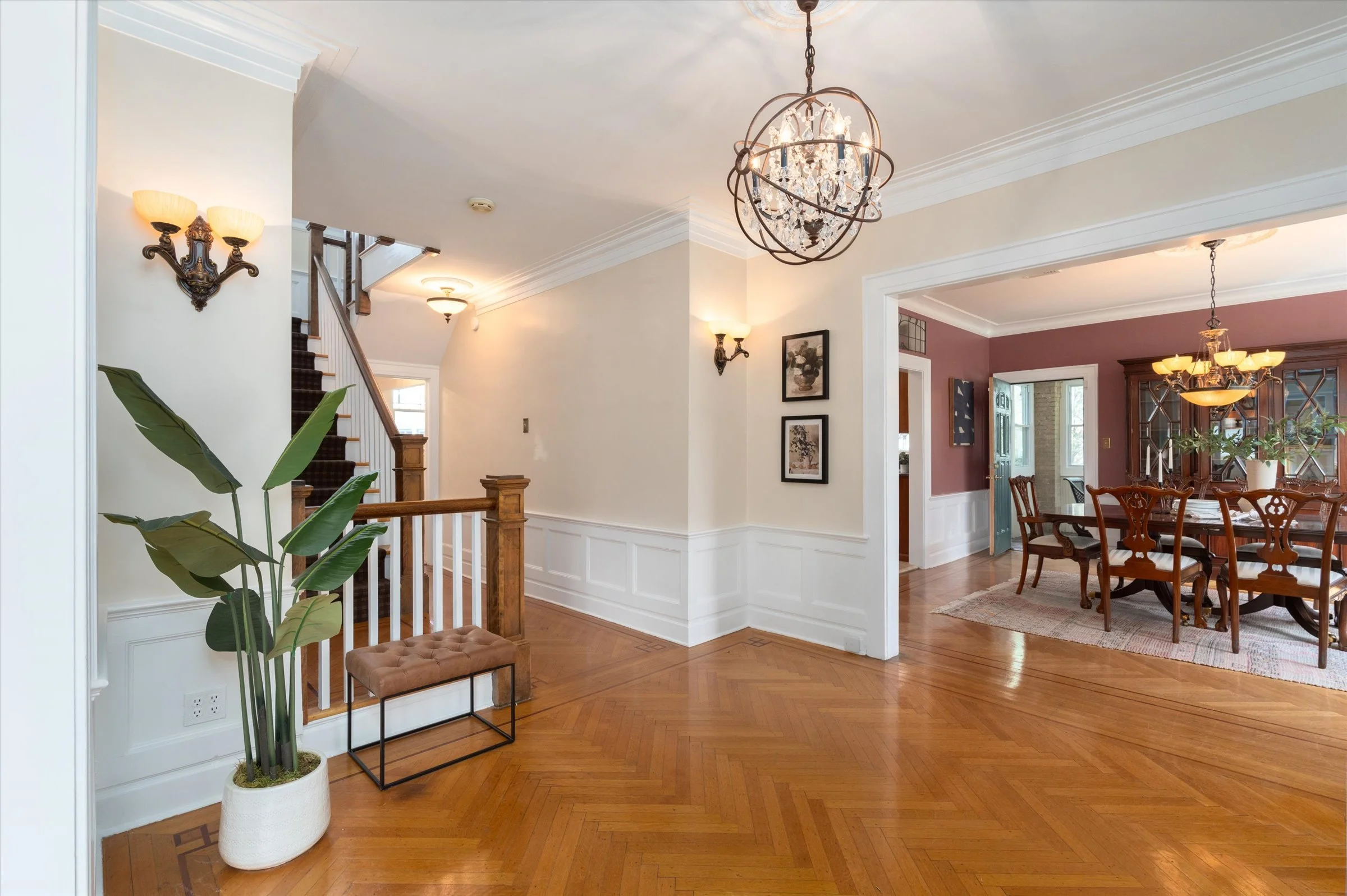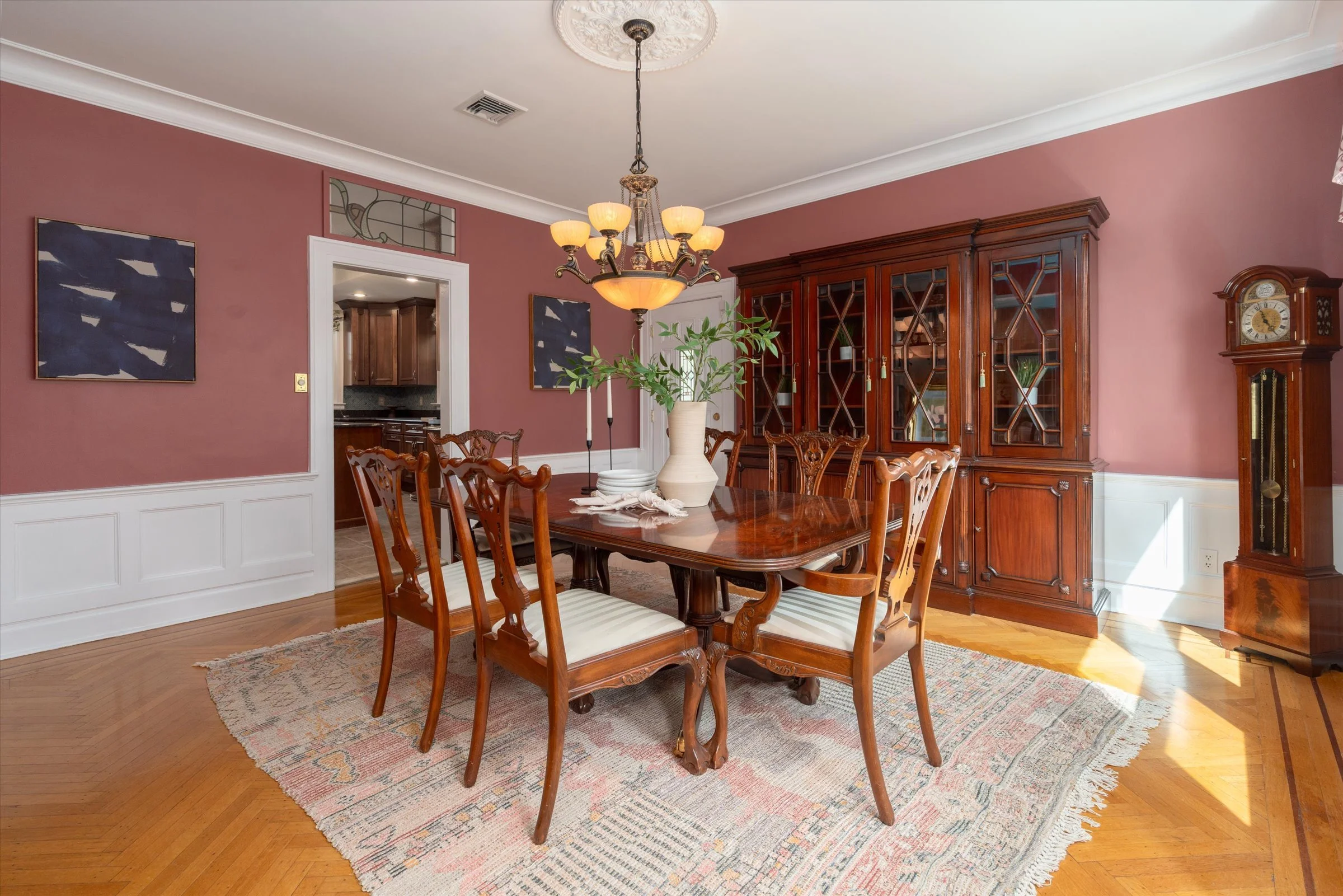 “Gorgeous formal dining room with a distinctive chandelier.”