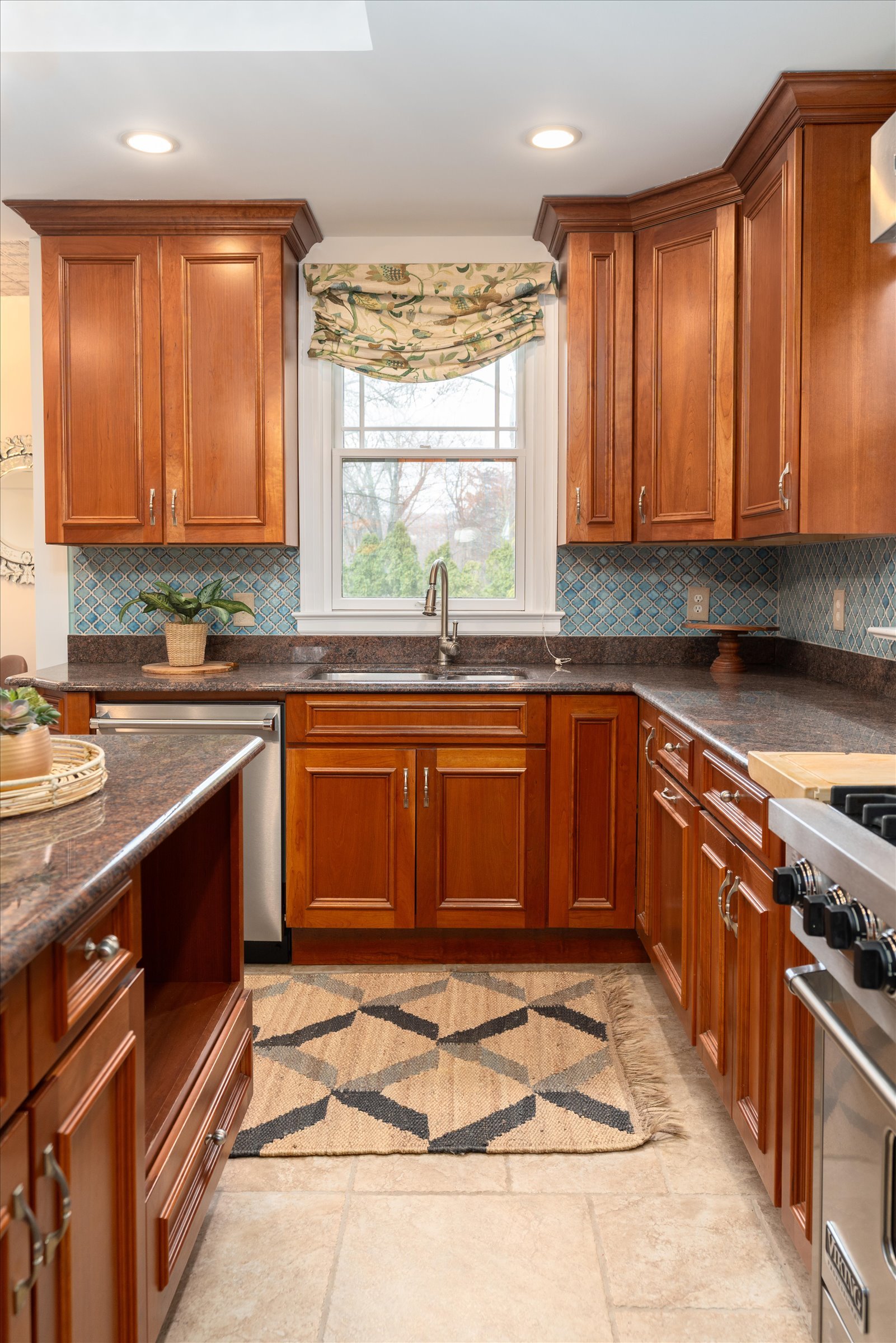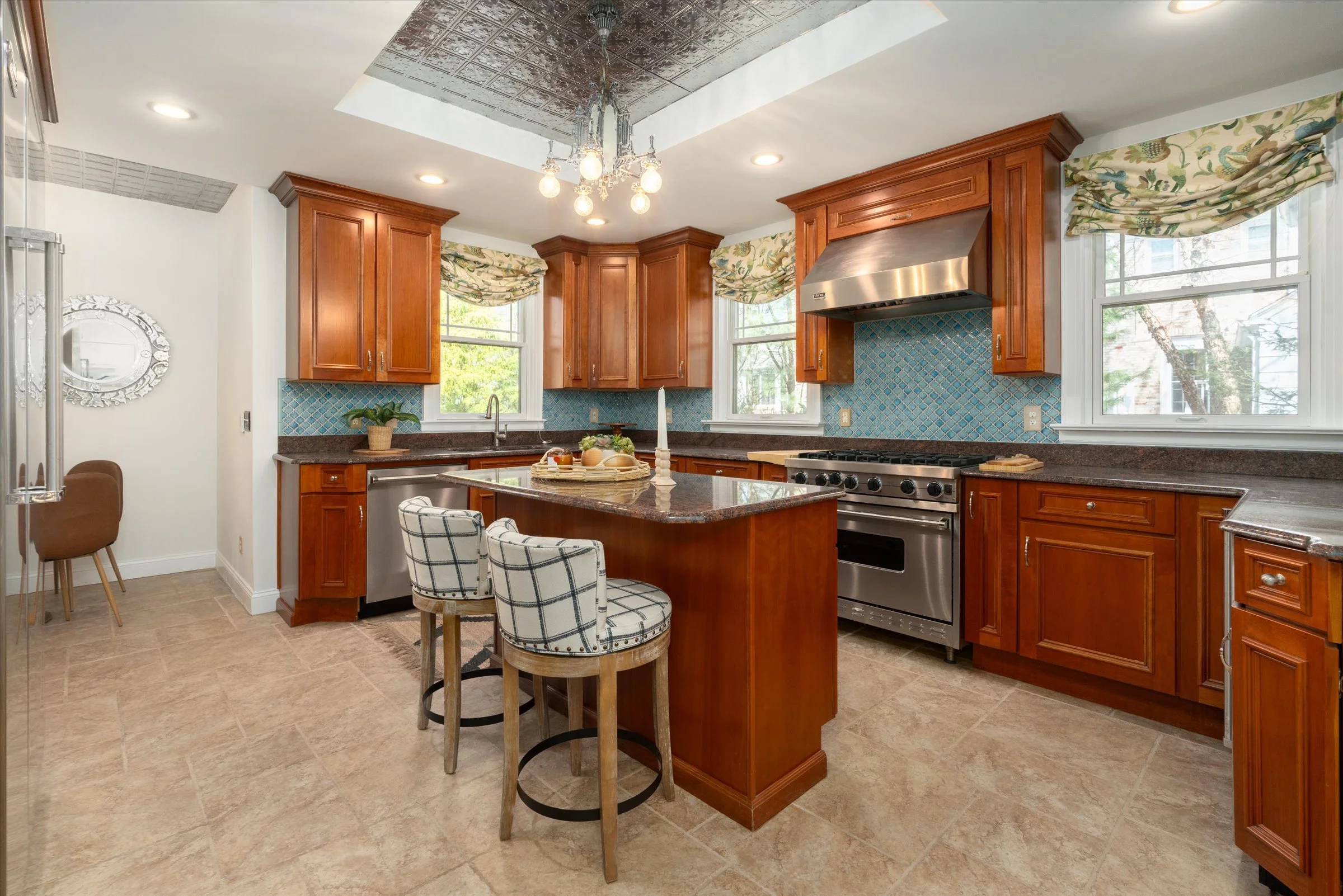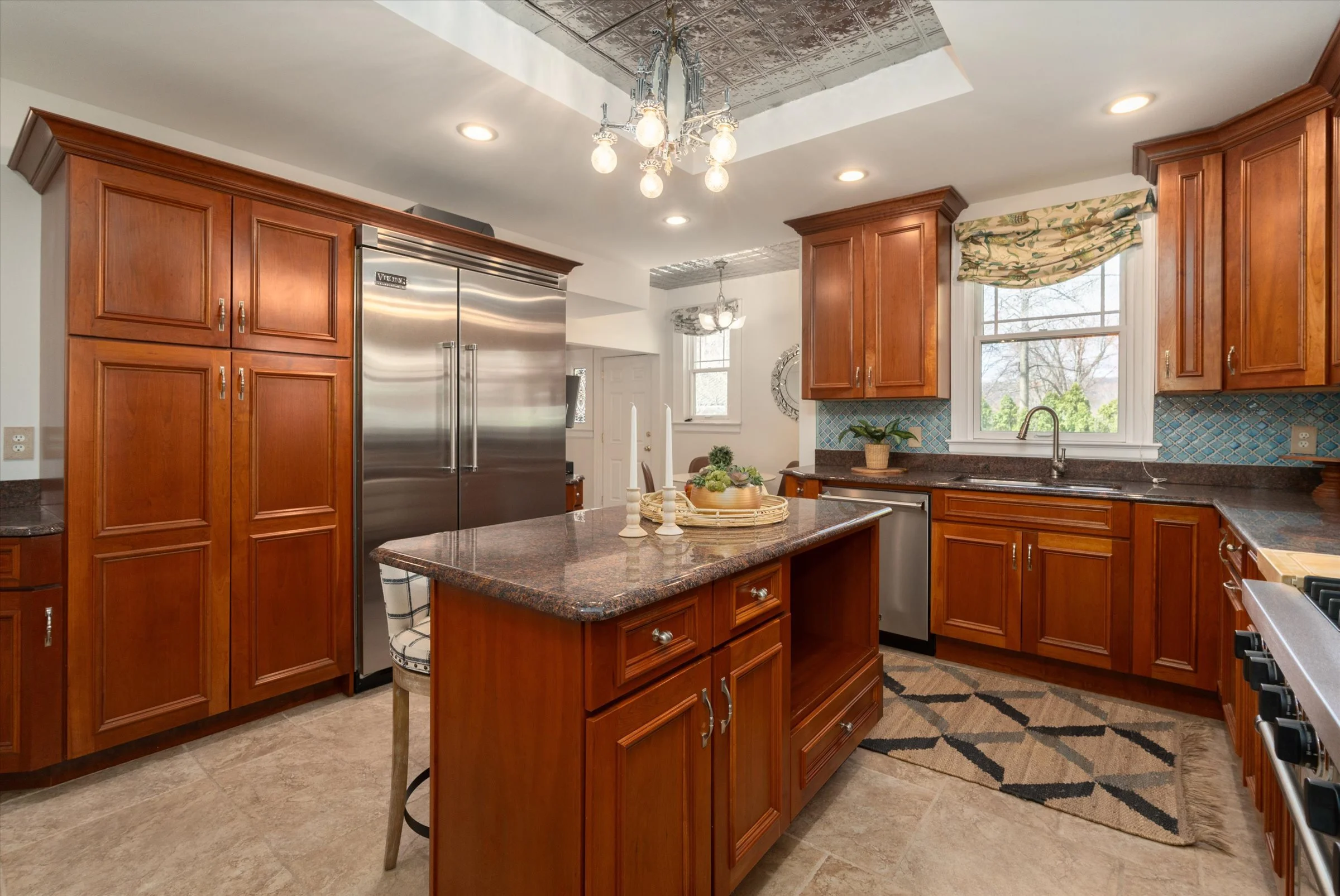 Spacious kitchen with an island and high-end appliances”