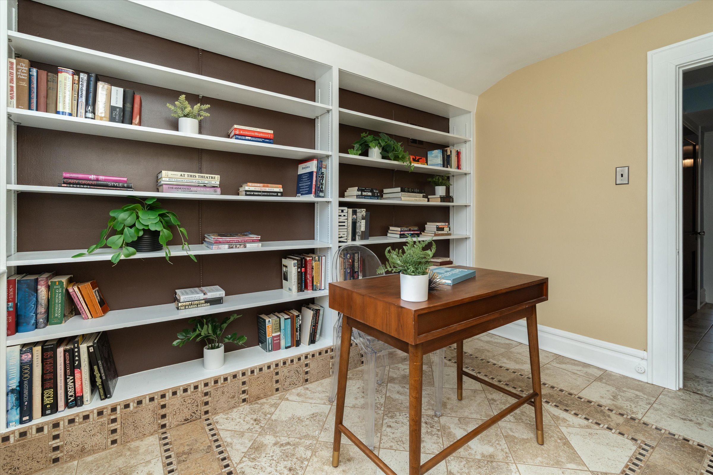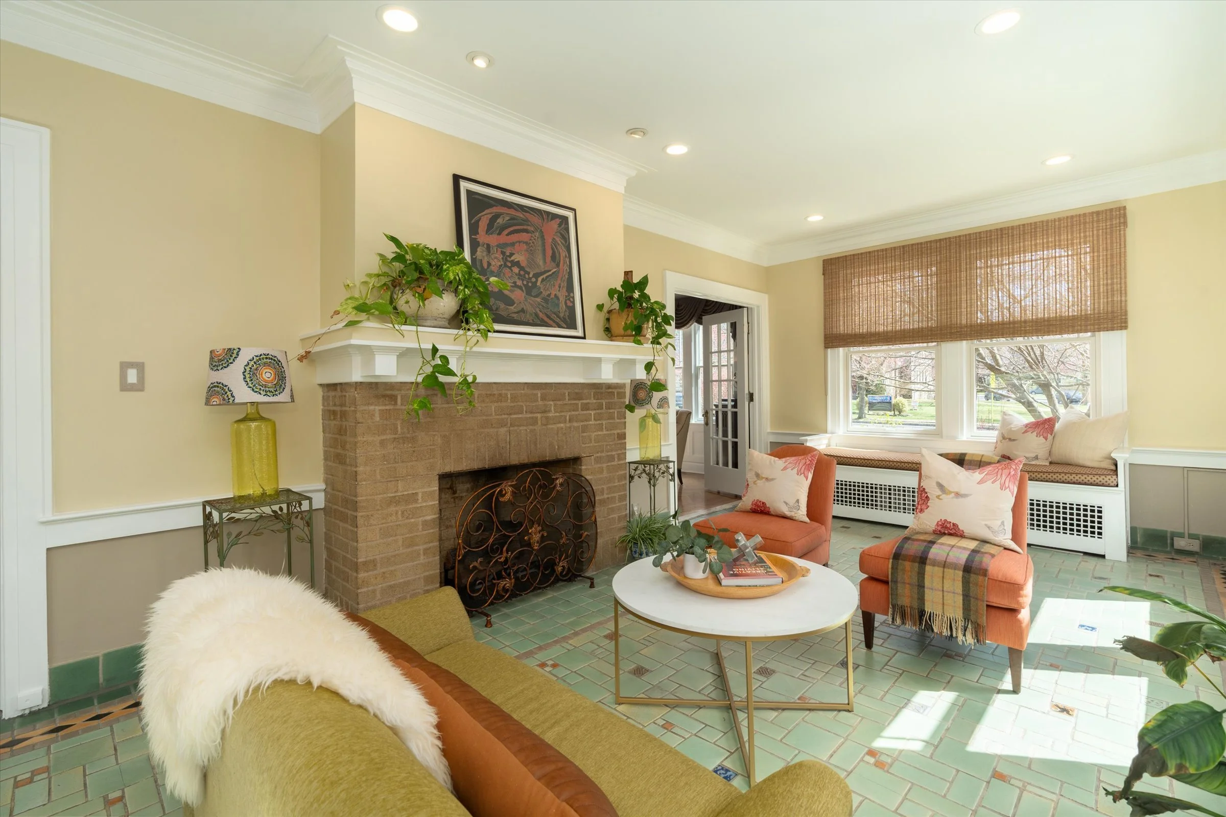 Charming family room with built-in window seats and original green tile floor