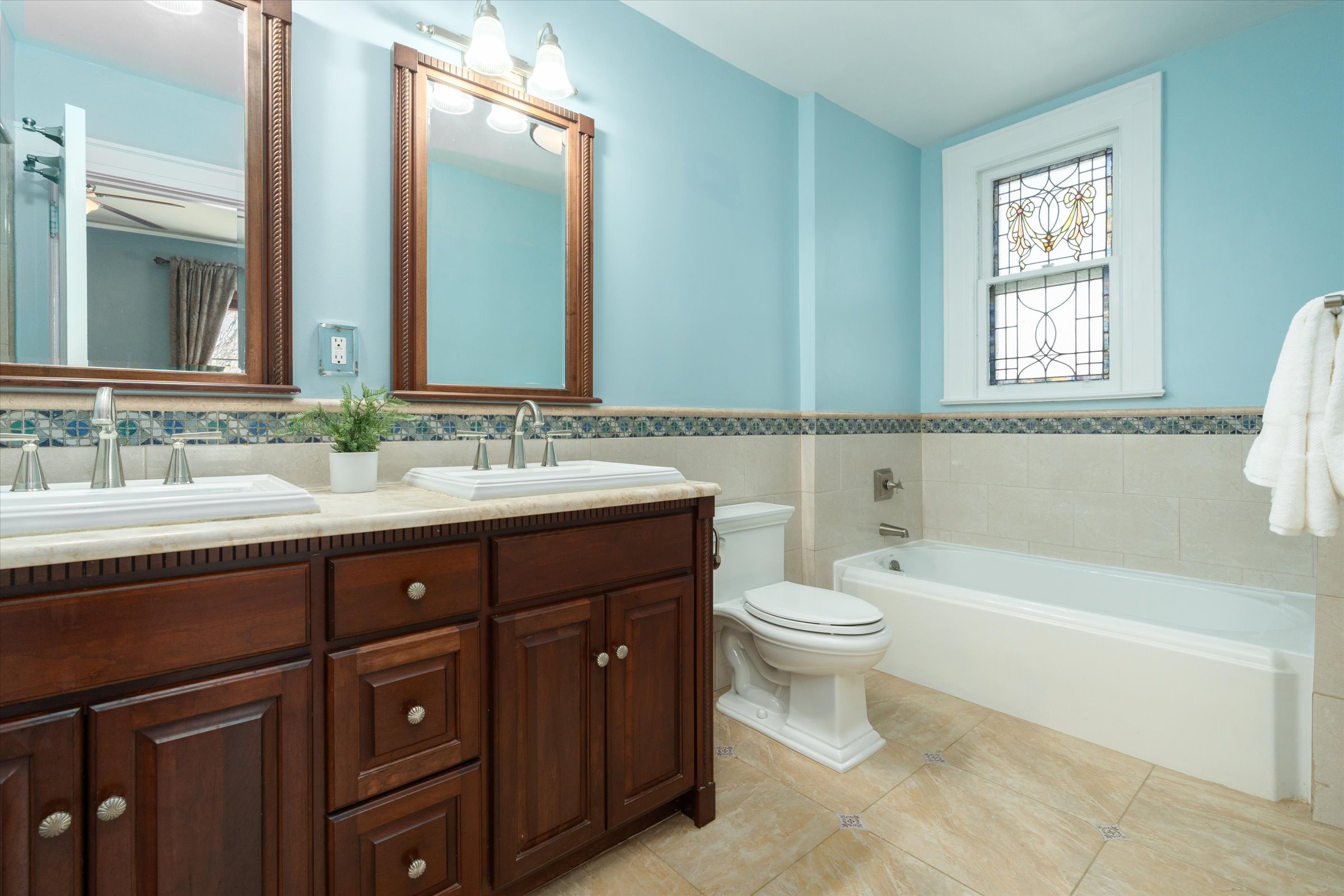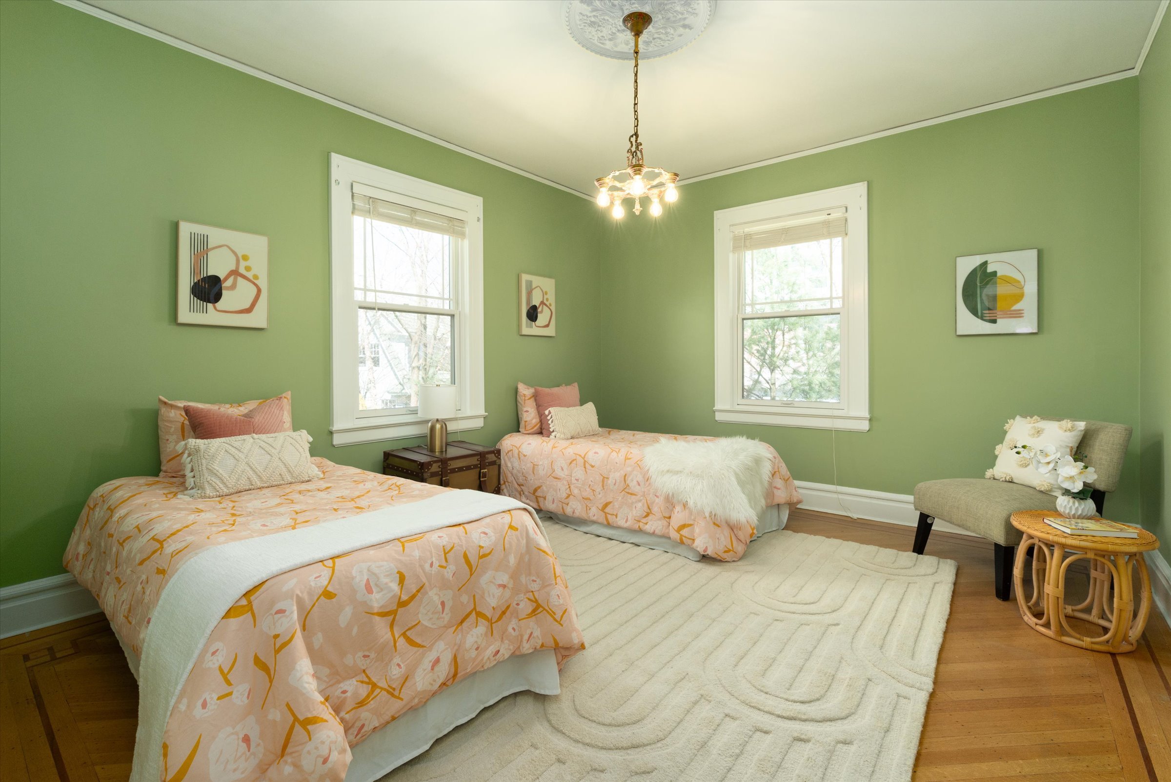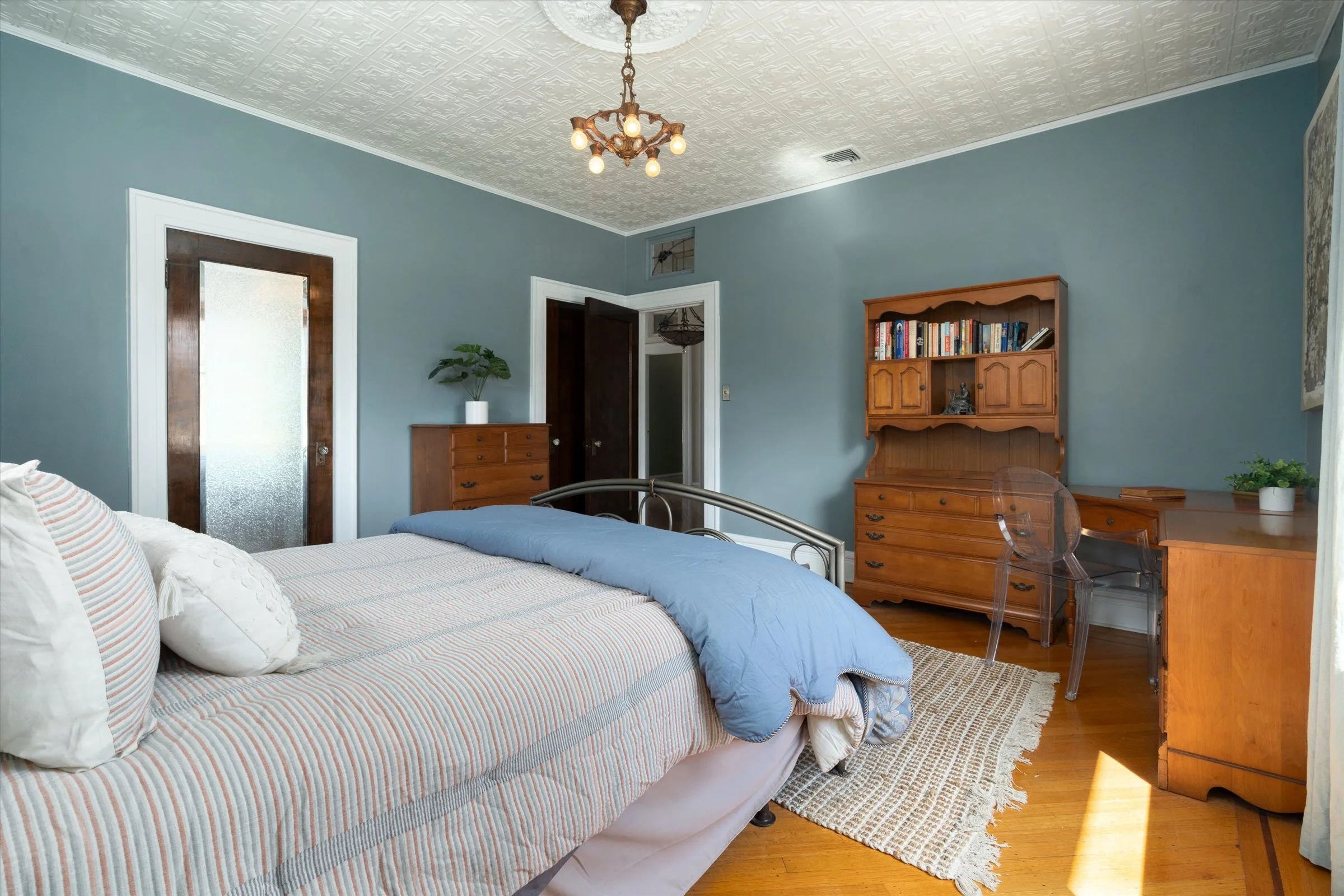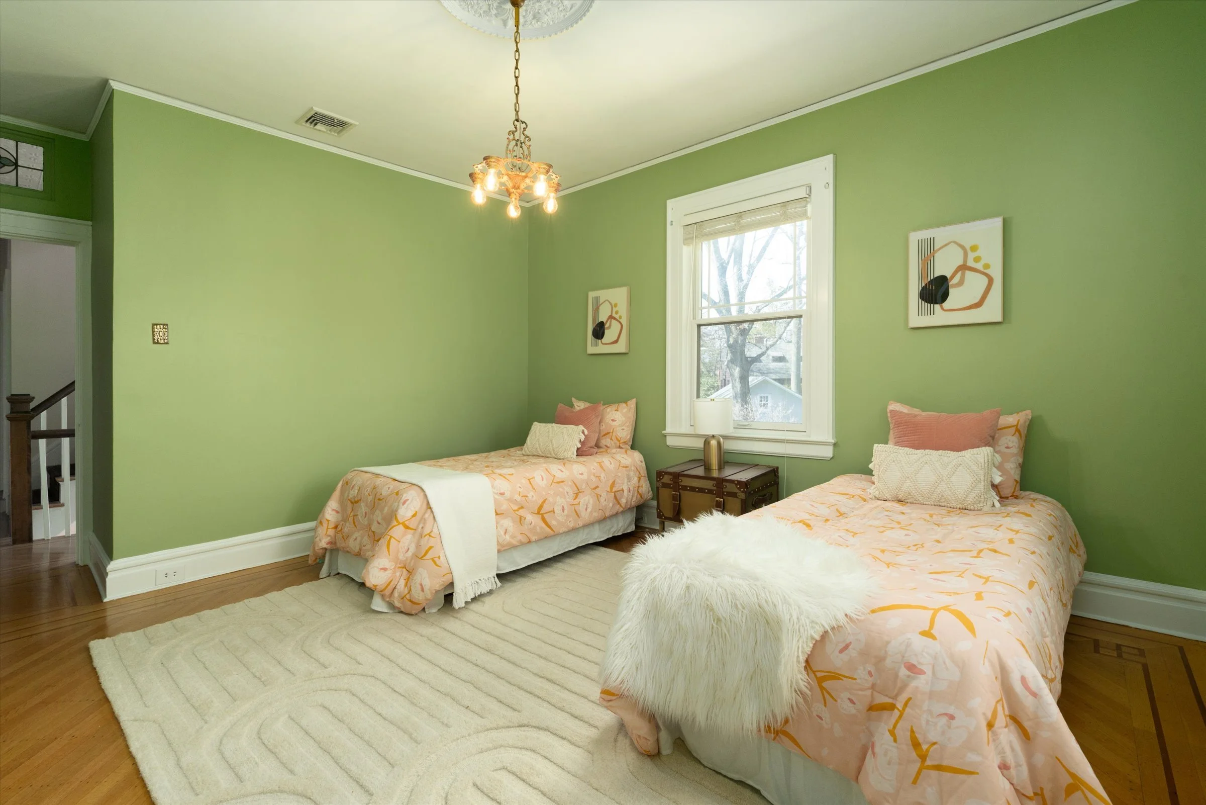 Bedrooms adorned with elegant period stained glass windows over the doors