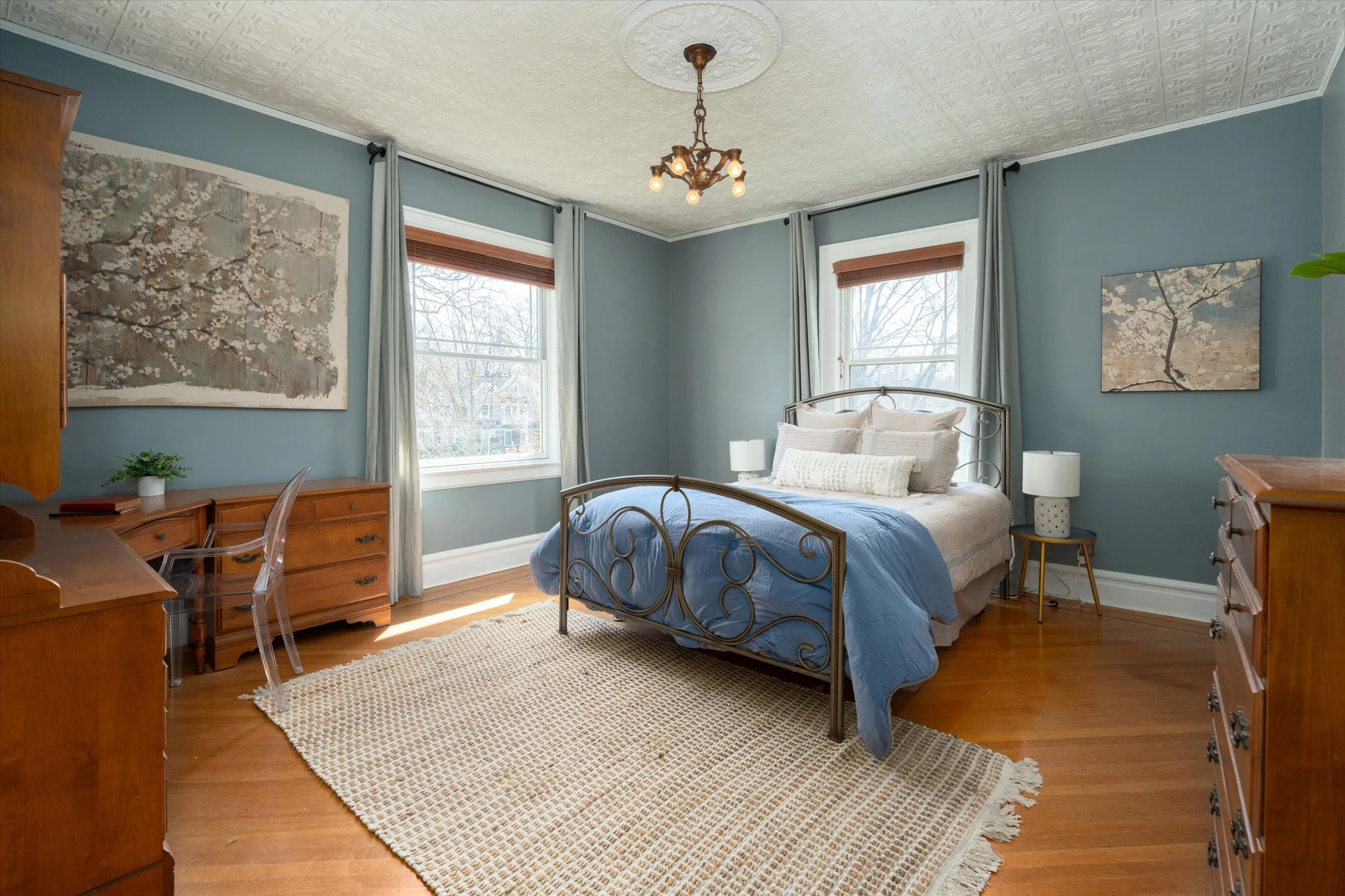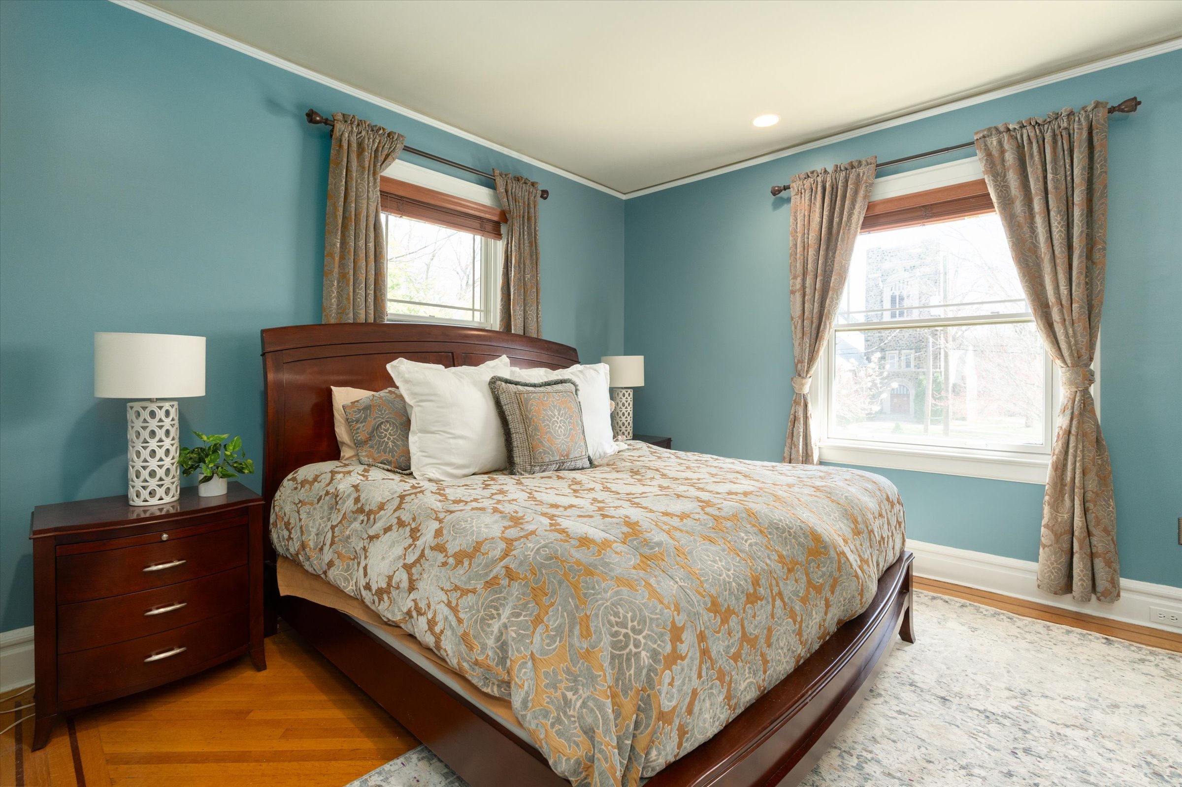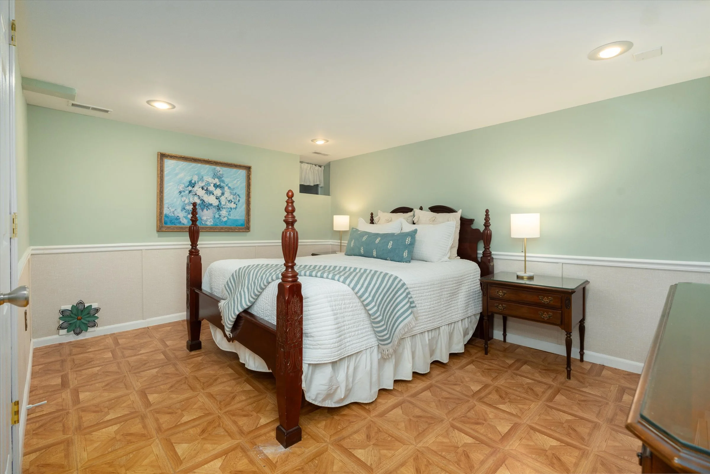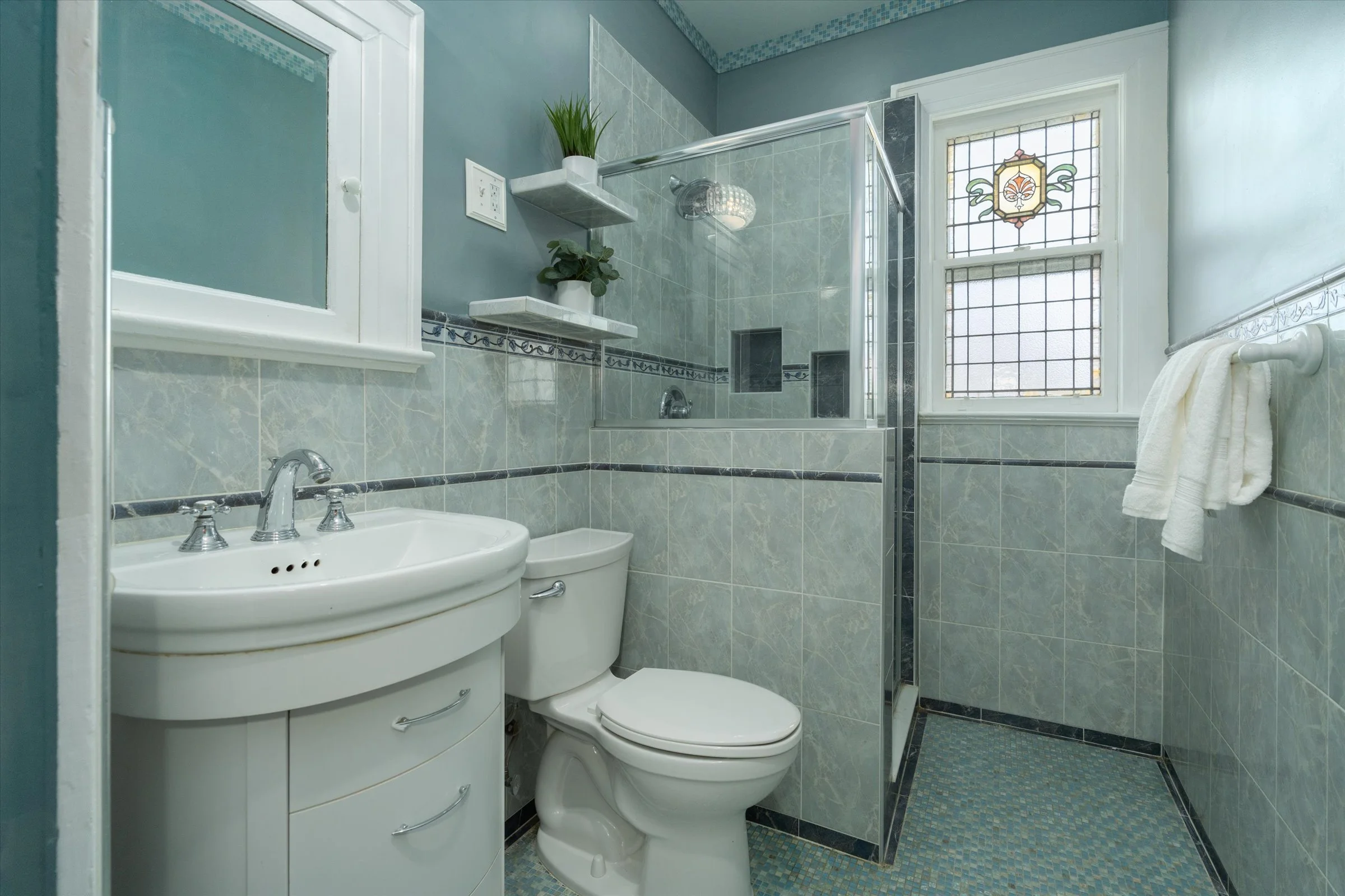 Bedrooms adorned with elegant period stained glass windows over the doors