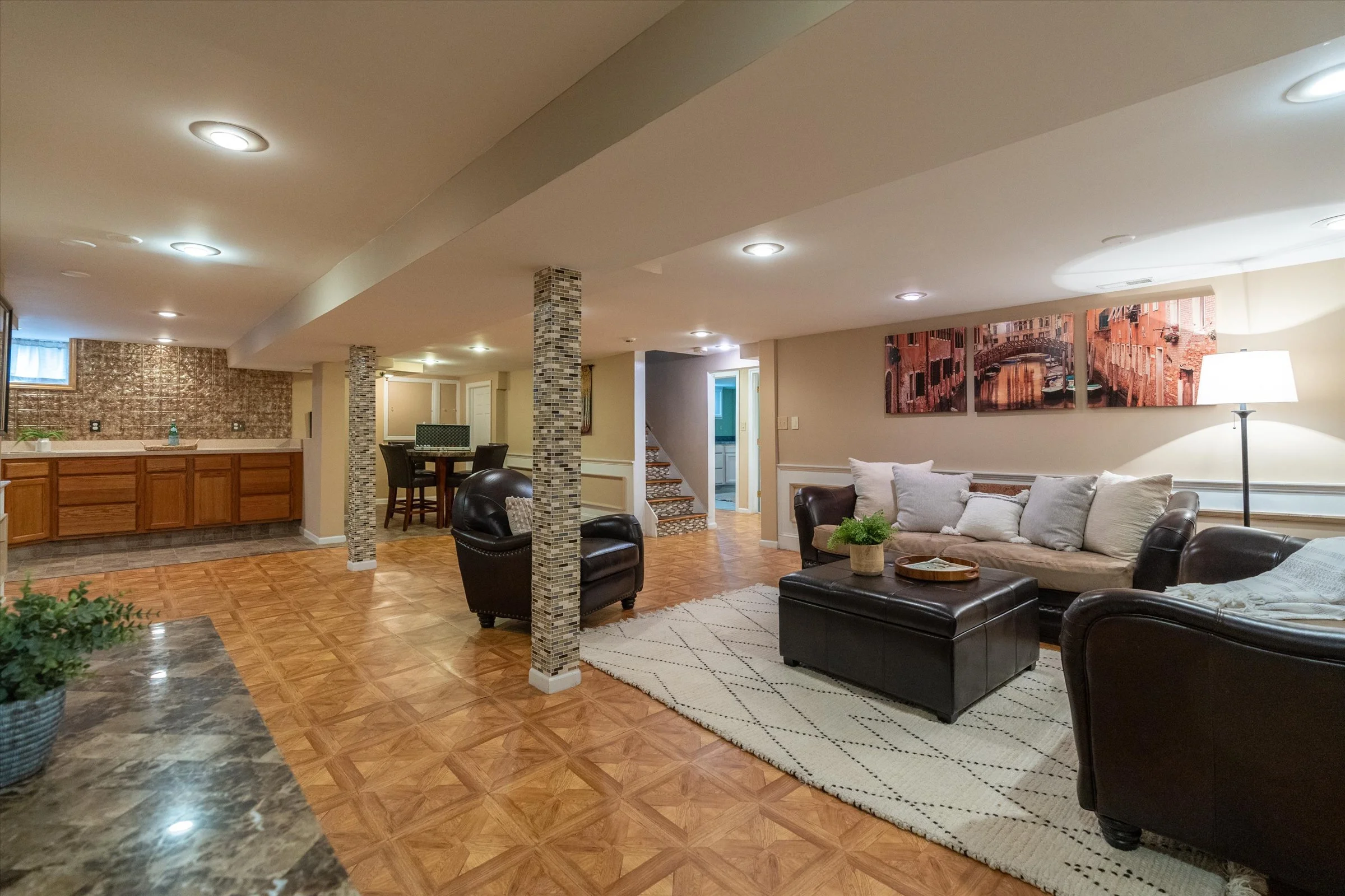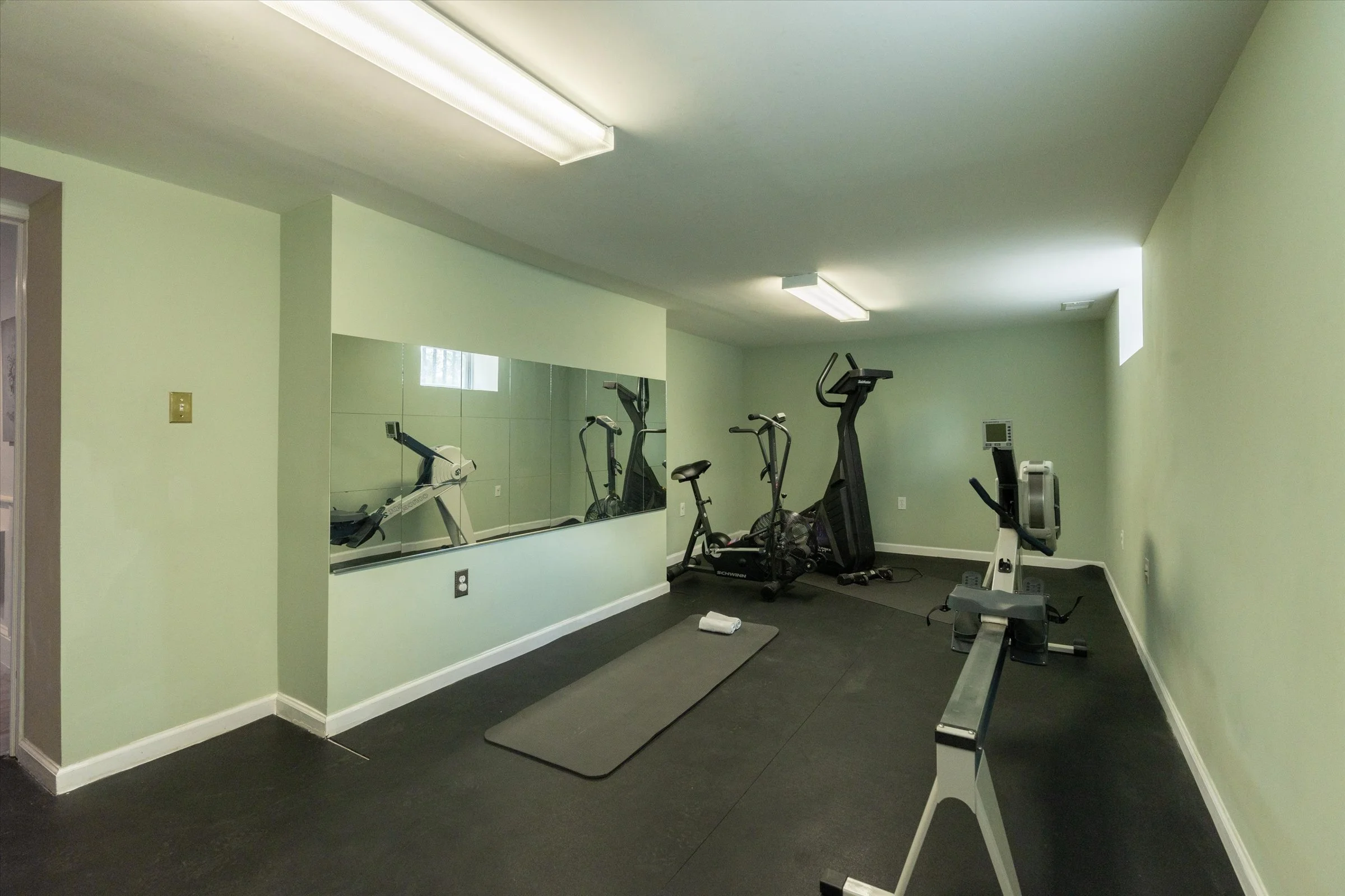 Versatile finished basement, almost like a separate apartment, with bathroom, bar area, and gym room