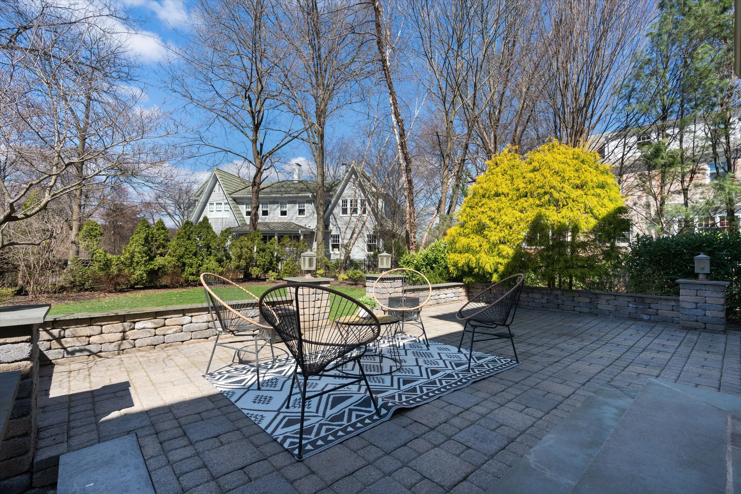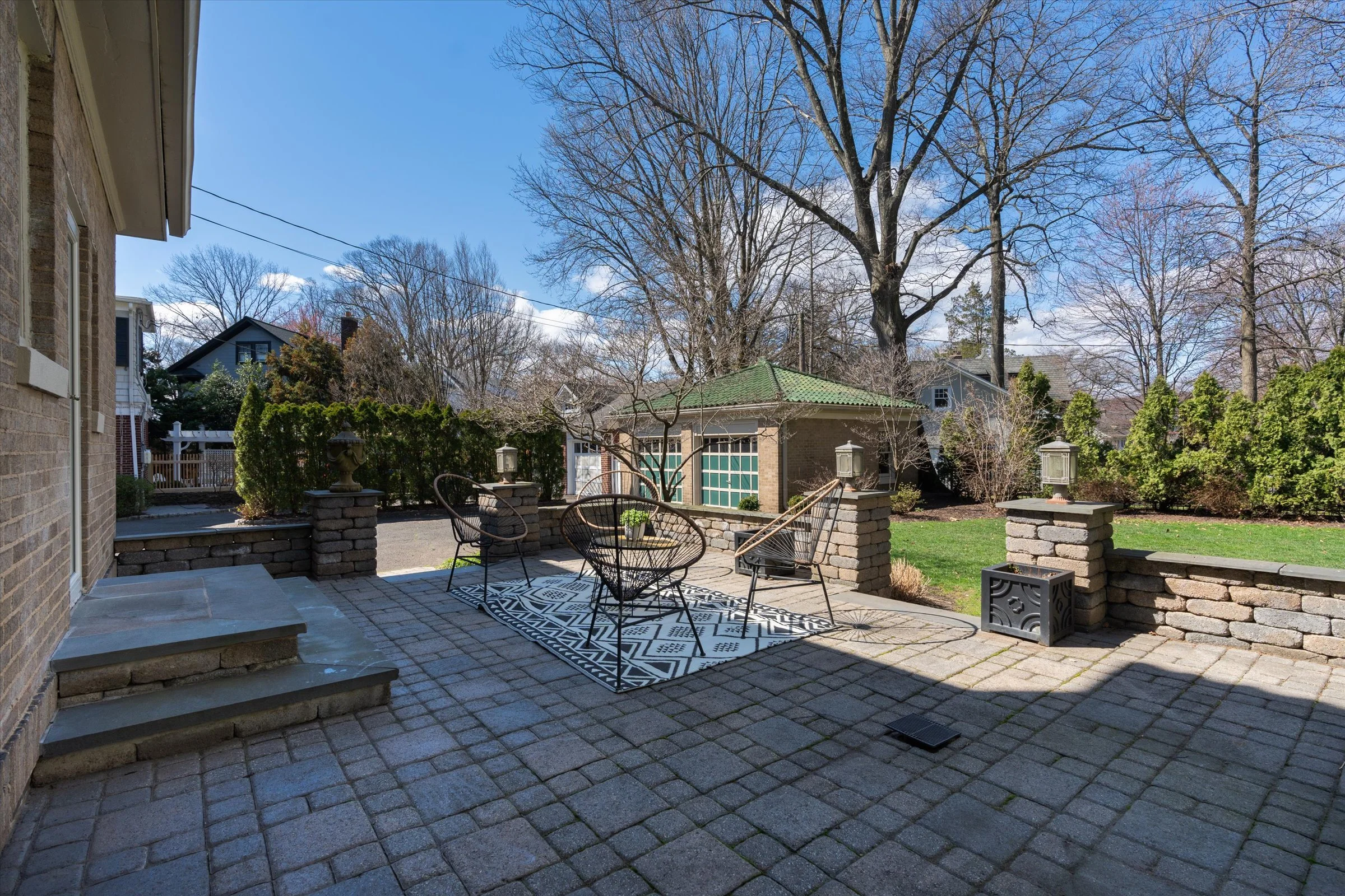 “Nicely landscaped backyard with a large back stone porch.”