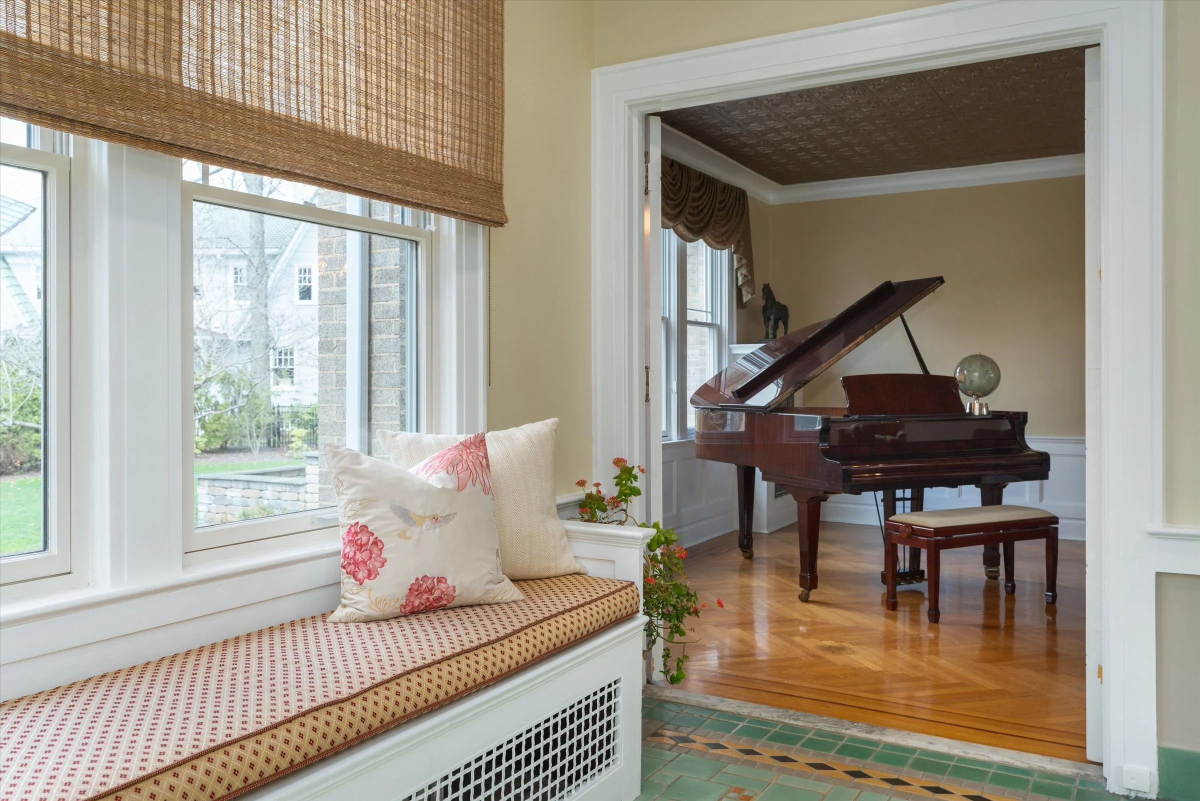 “The family room has beautiful window seats and a distinctive original tile floor.”