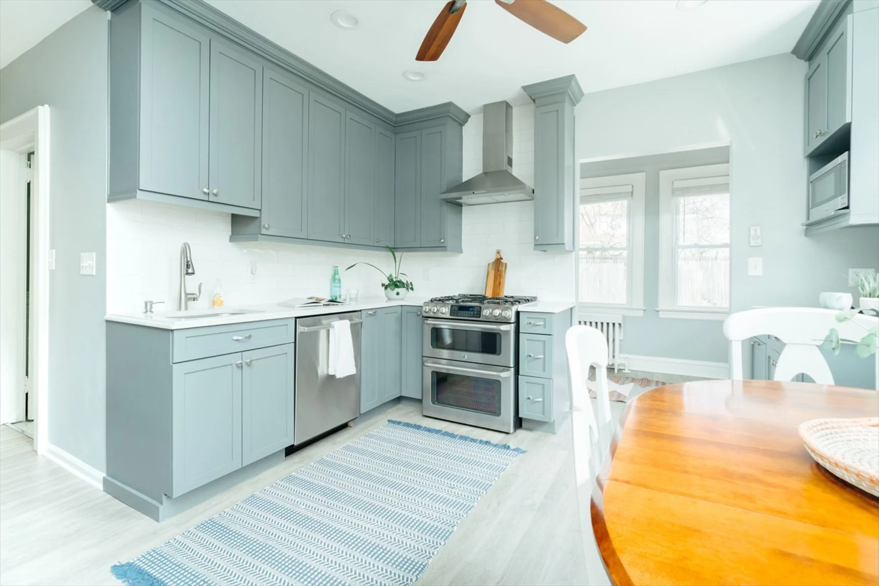 This completely renovated eat-in kitchen is both functional and beautiful! With gorgeous quartz countertops, classic white subway tile and stainless steel appliances, preparing a meal in this space is a dream. This kitchen provides ample storage and prep space along with space for a generous table to enjoy breakfast or a more relaxed dinner in the kitchen.