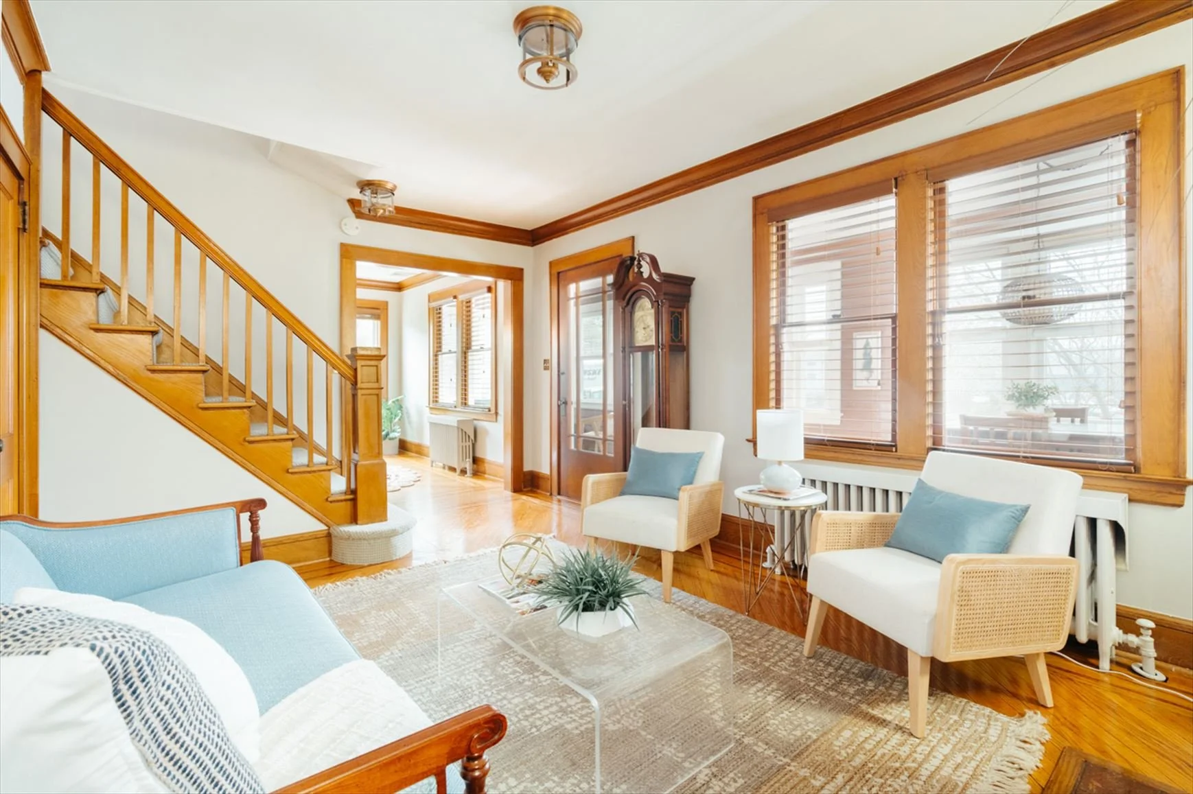 Flowing from the kitchen, this generous dining room is the perfect spot for entertaining. Whether you're hosting a special holiday gathering or simply having friends over for a Friday night dinner, this space is ideal. Graced with elegant details such as original crown molding and hardwood floors with ribbon detail, you can entertain in style and comfort.
