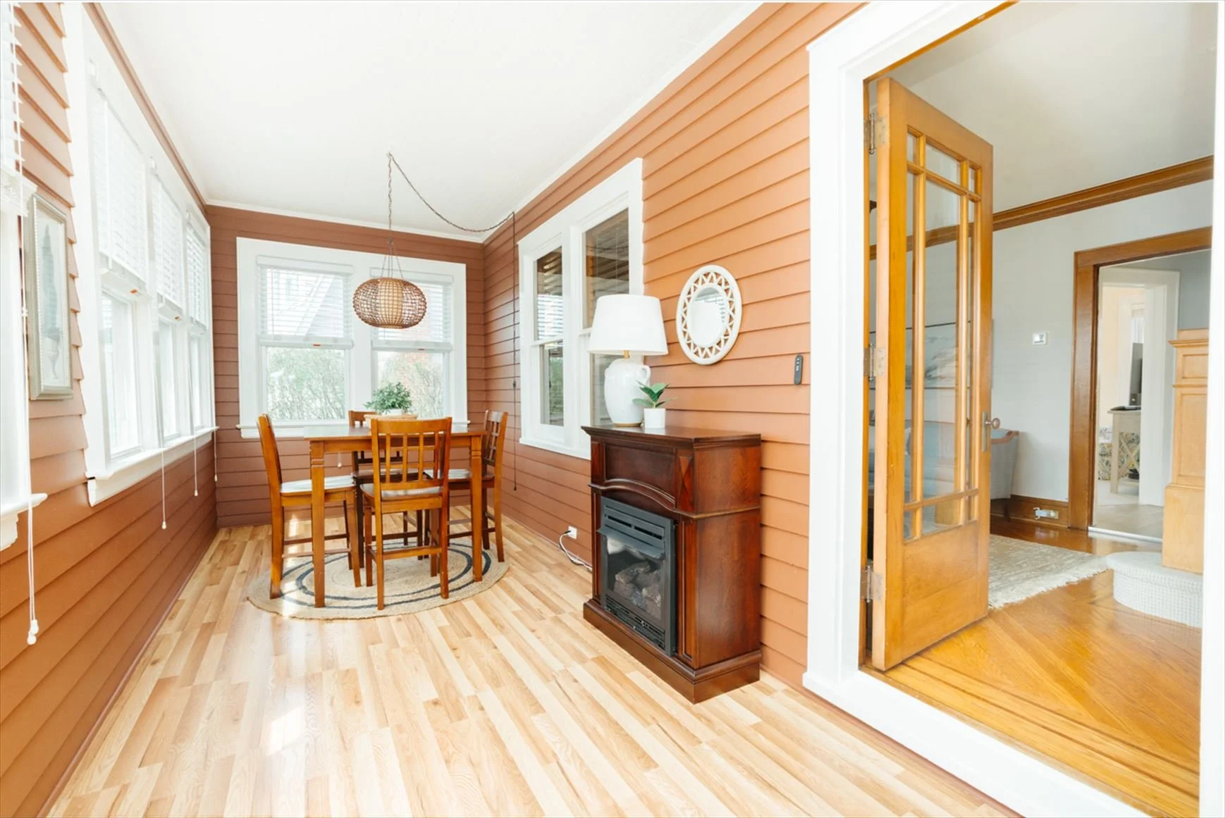 This welcoming and cozy living room envelopes you right away with its charm. The elegant and original crown moldings along with the beautiful German Schmear detail on the fireplace provides beautiful aesthetic details along with a comforting atmosphere. Also, enjoy the way the sun trickles through the original stained glass windows that flank the gas fireplace. This living room is the epitome of warmth, charm and comfort.