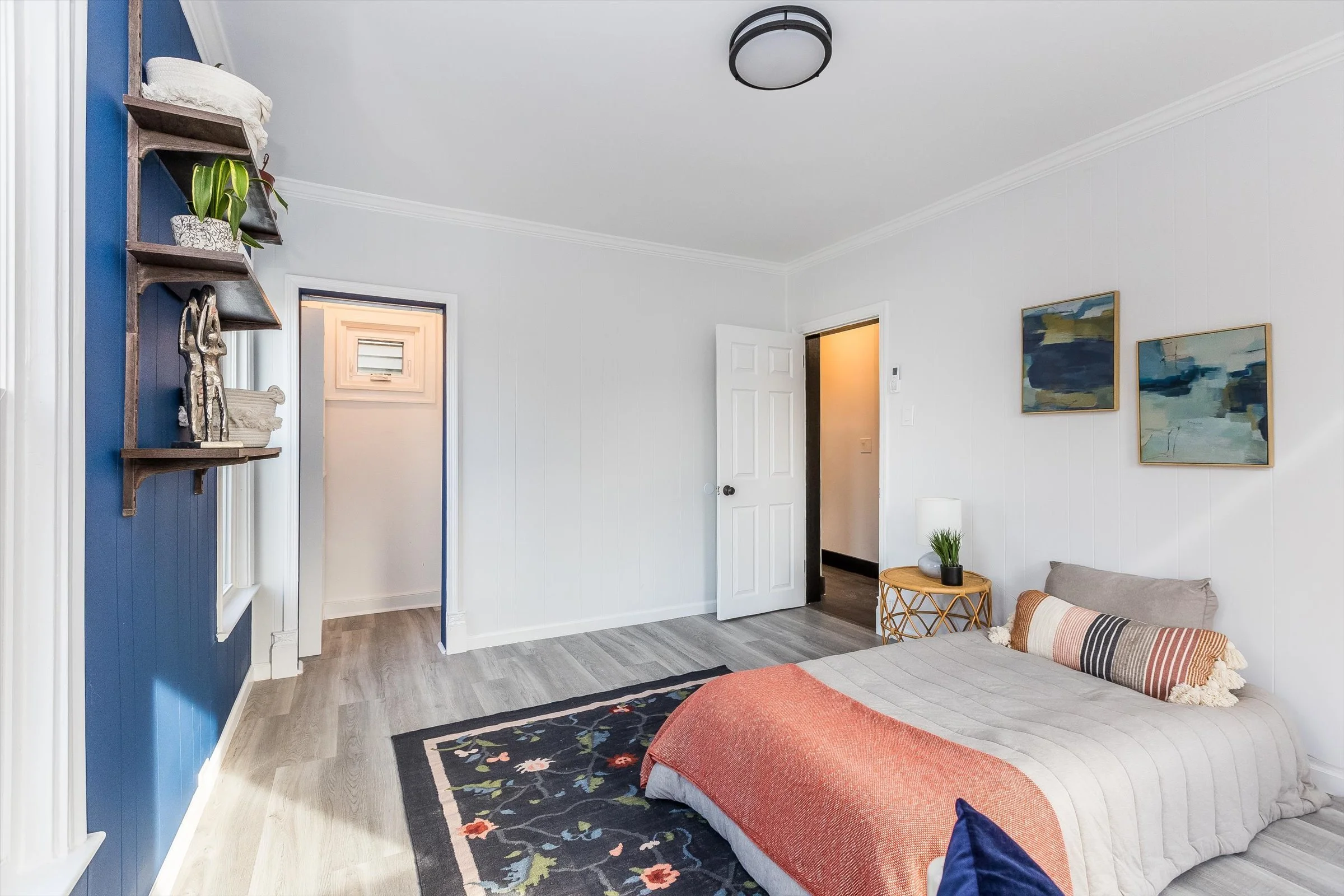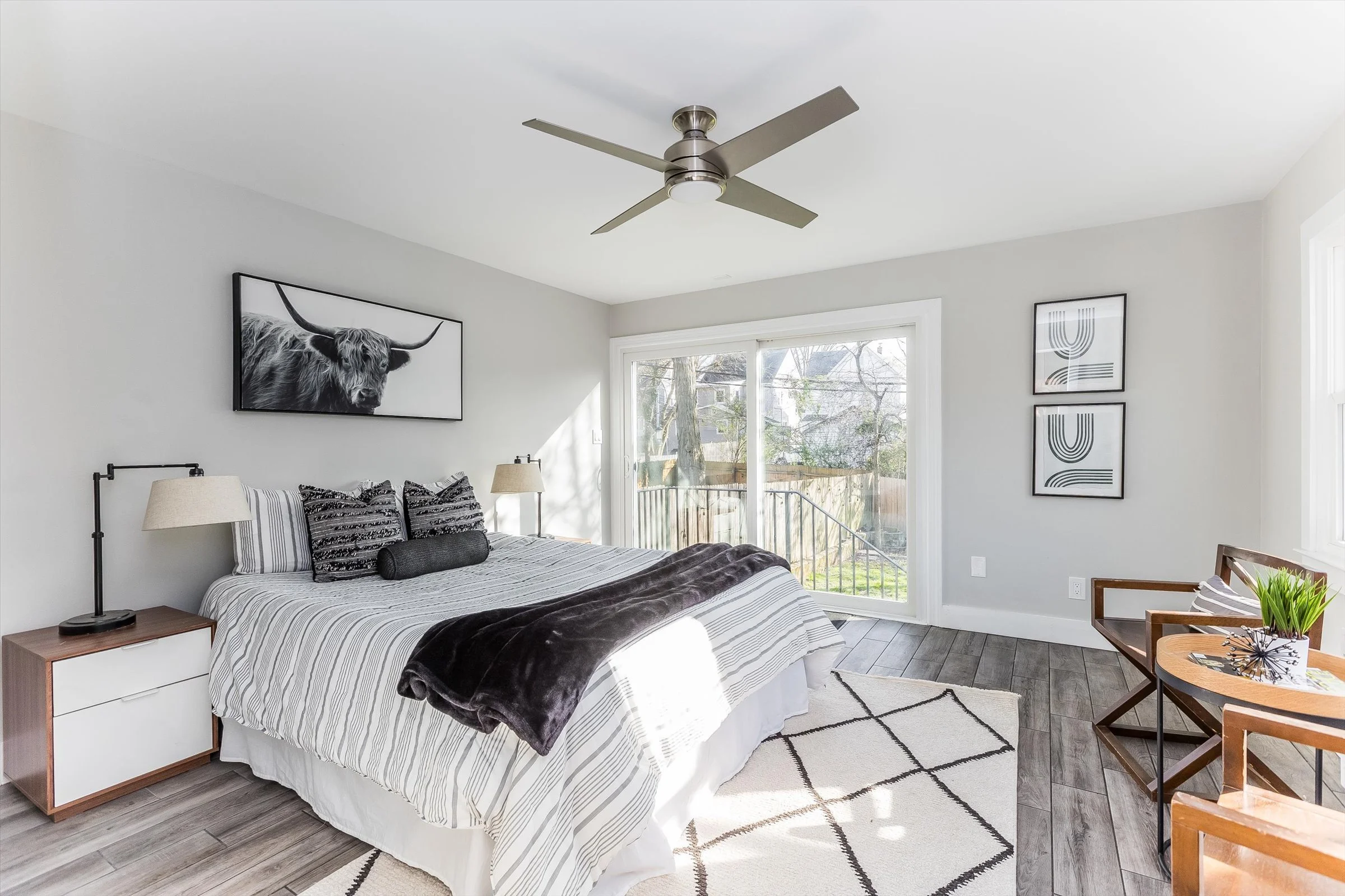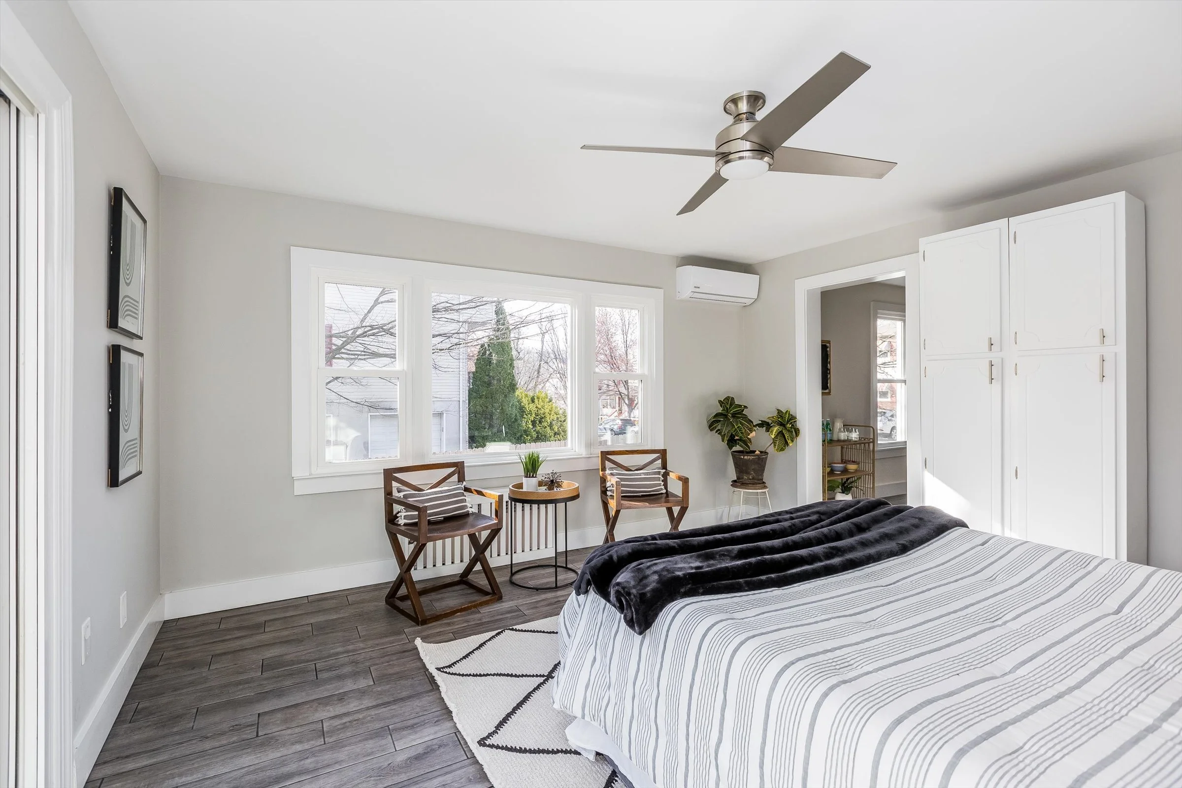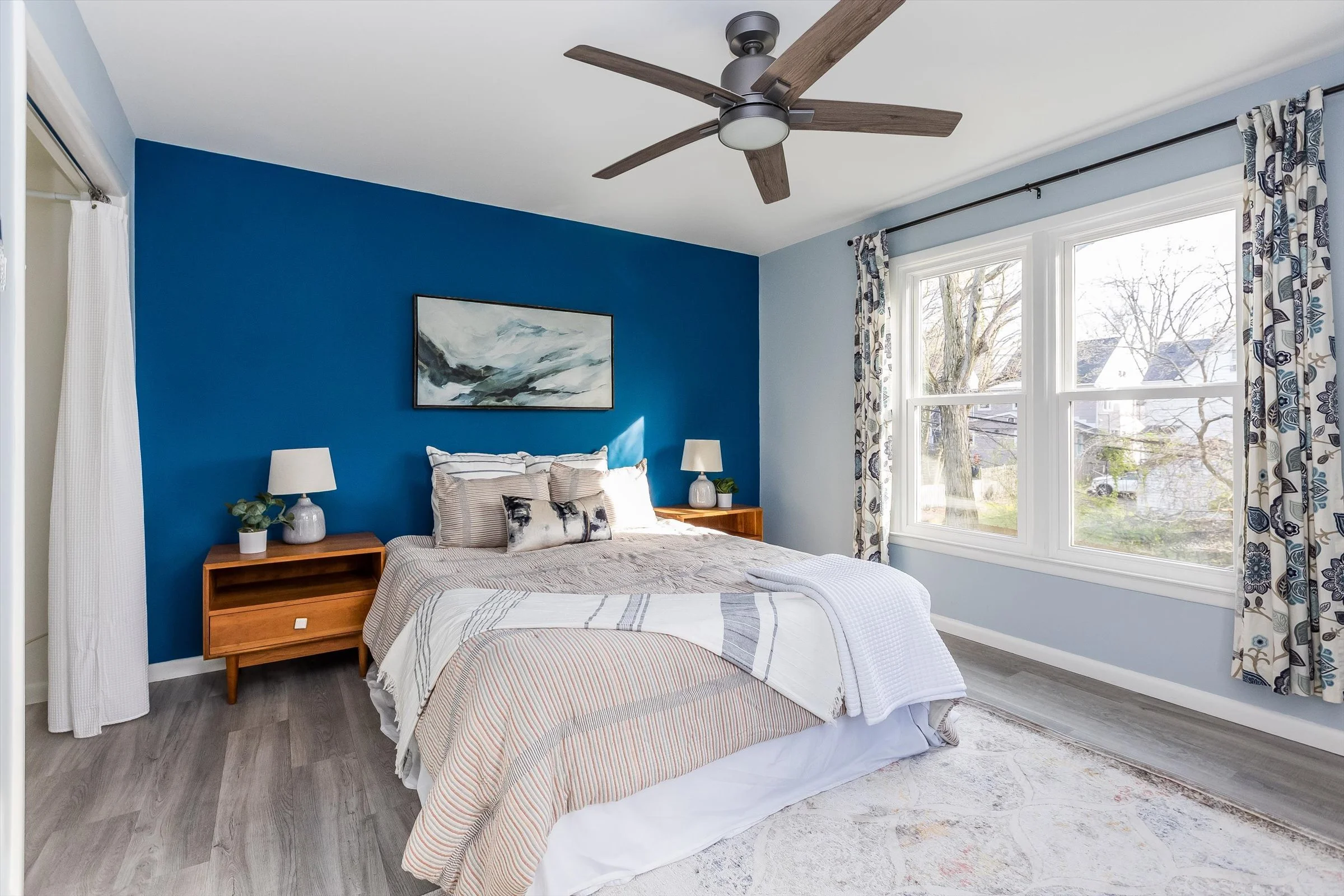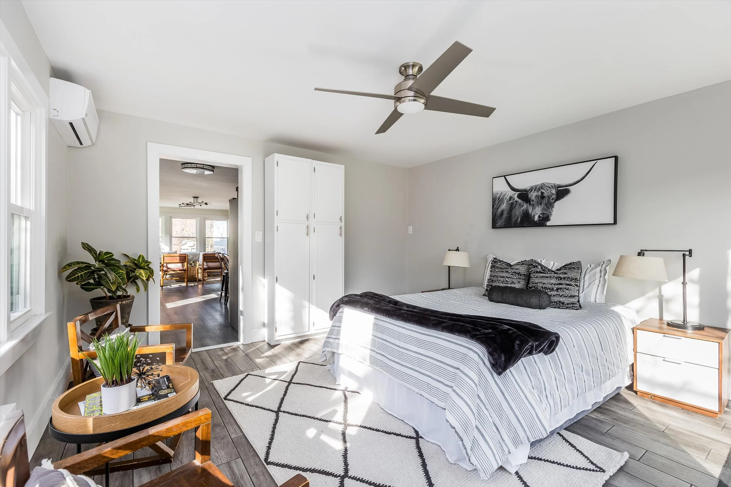 “Set at the back of the house, overlooking the backyard, the primary bedroom is a quiet sanctuary with its own climate control and PLENTY of room for a king size bed!”