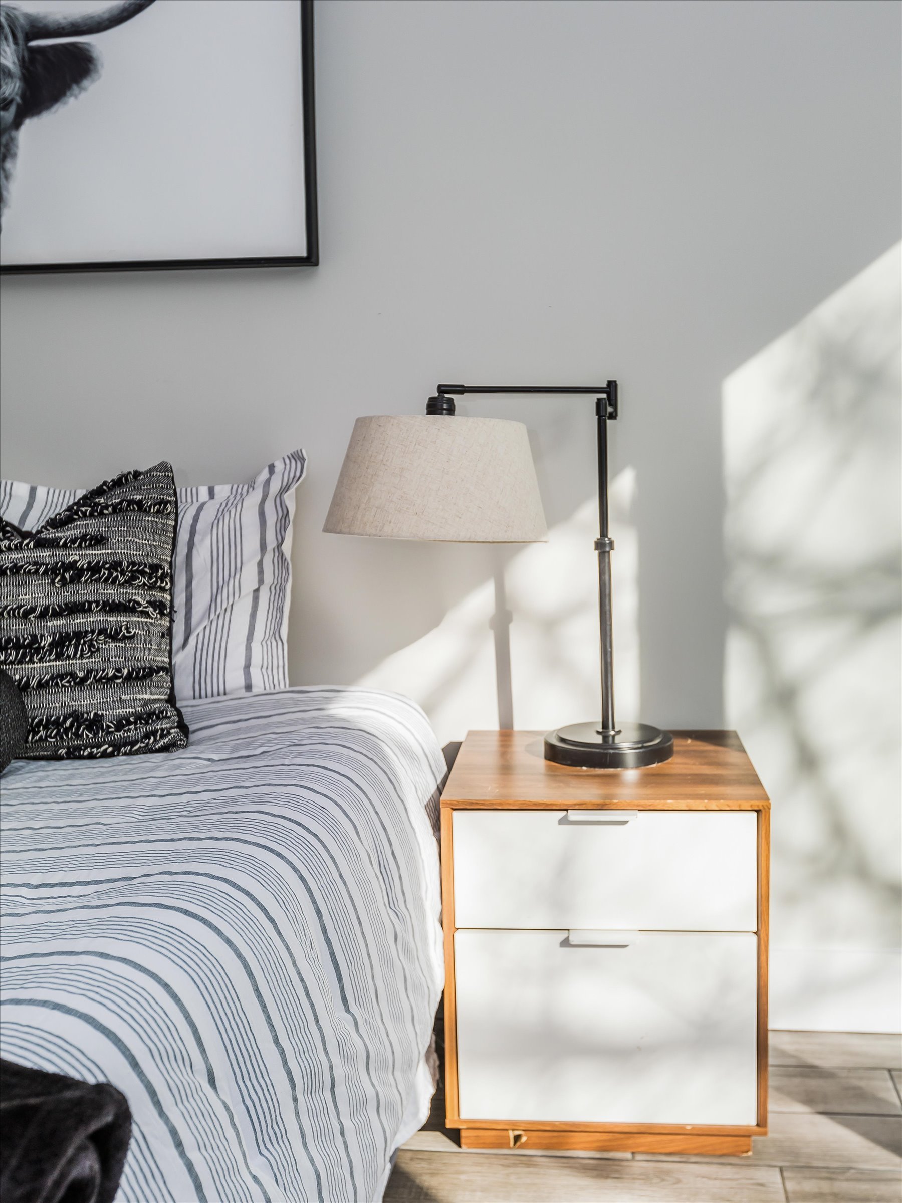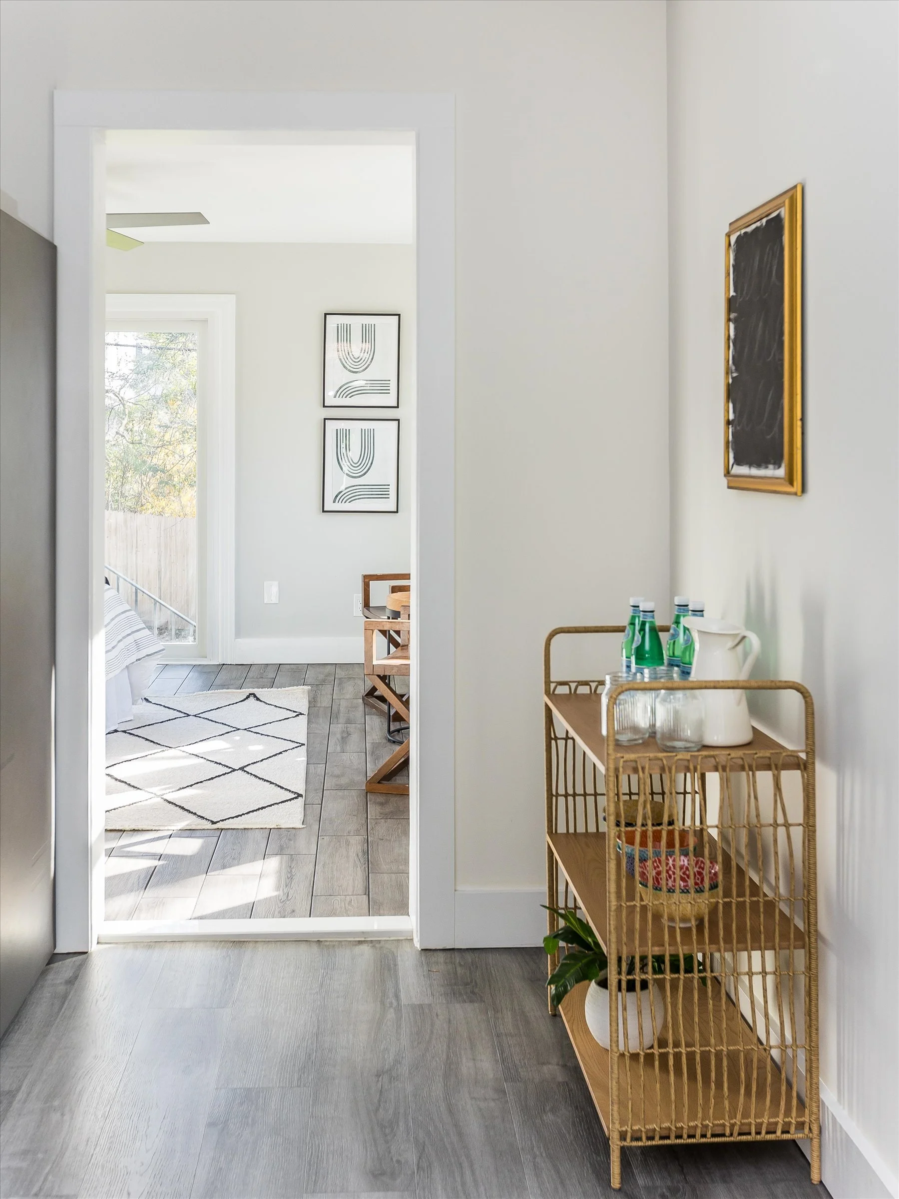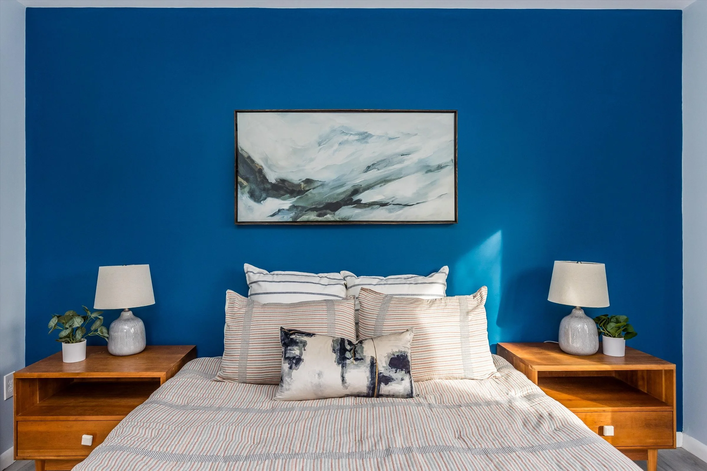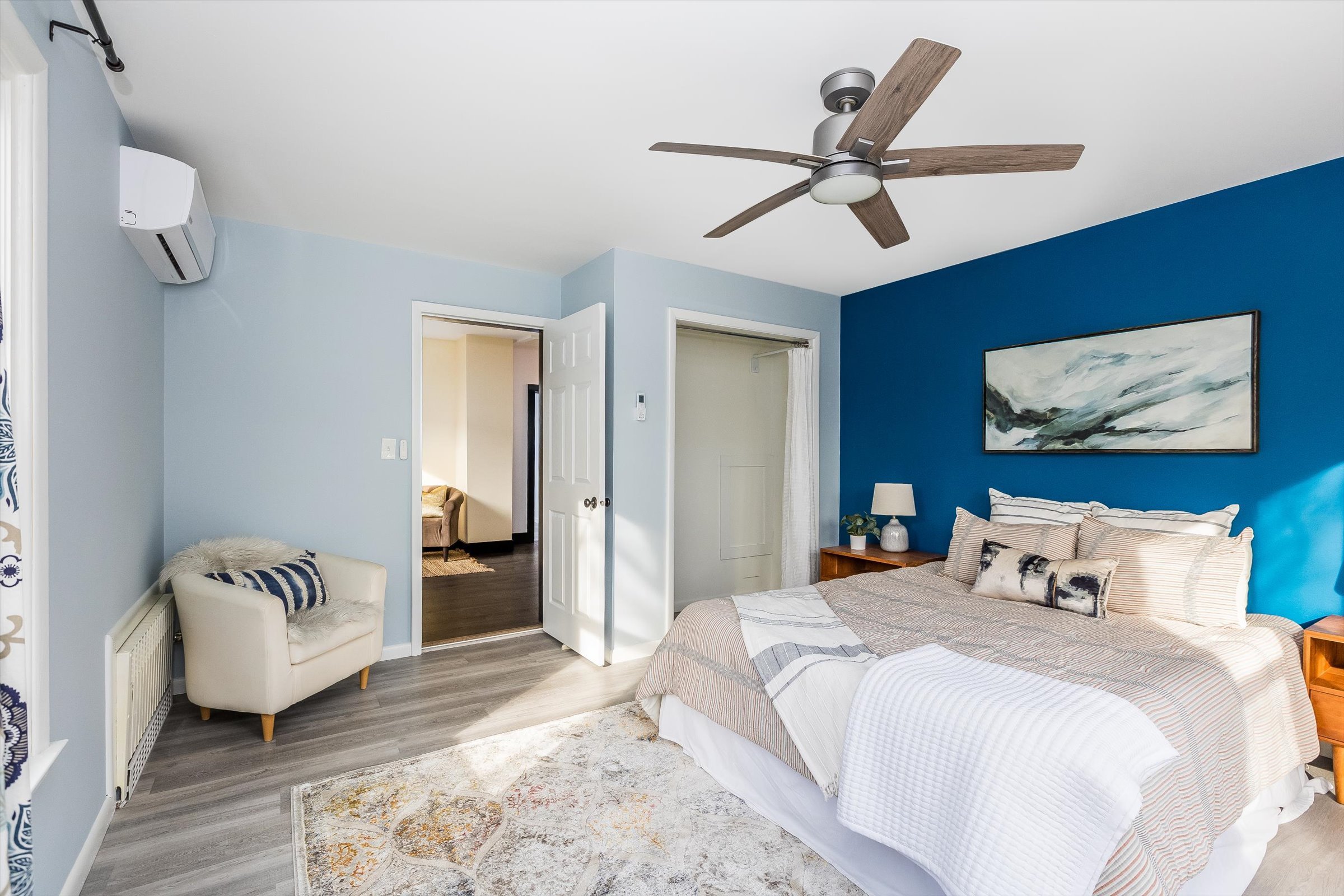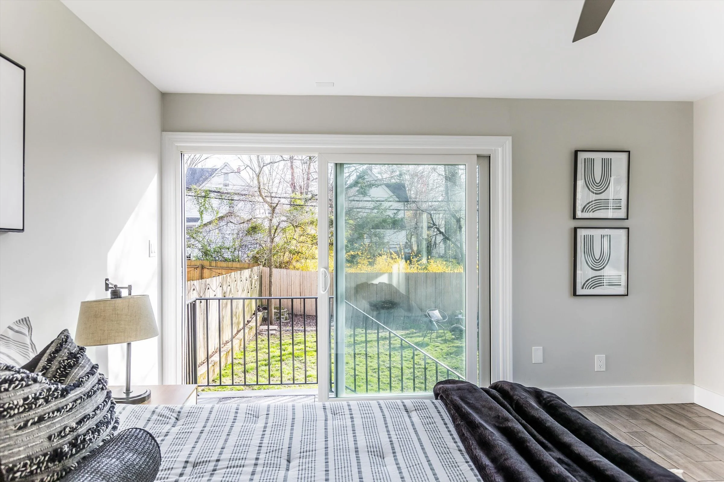 “Set at the back of the house, overlooking the backyard, the primary bedroom is a quiet sanctuary with its own climate control and PLENTY of room for a king size bed!”