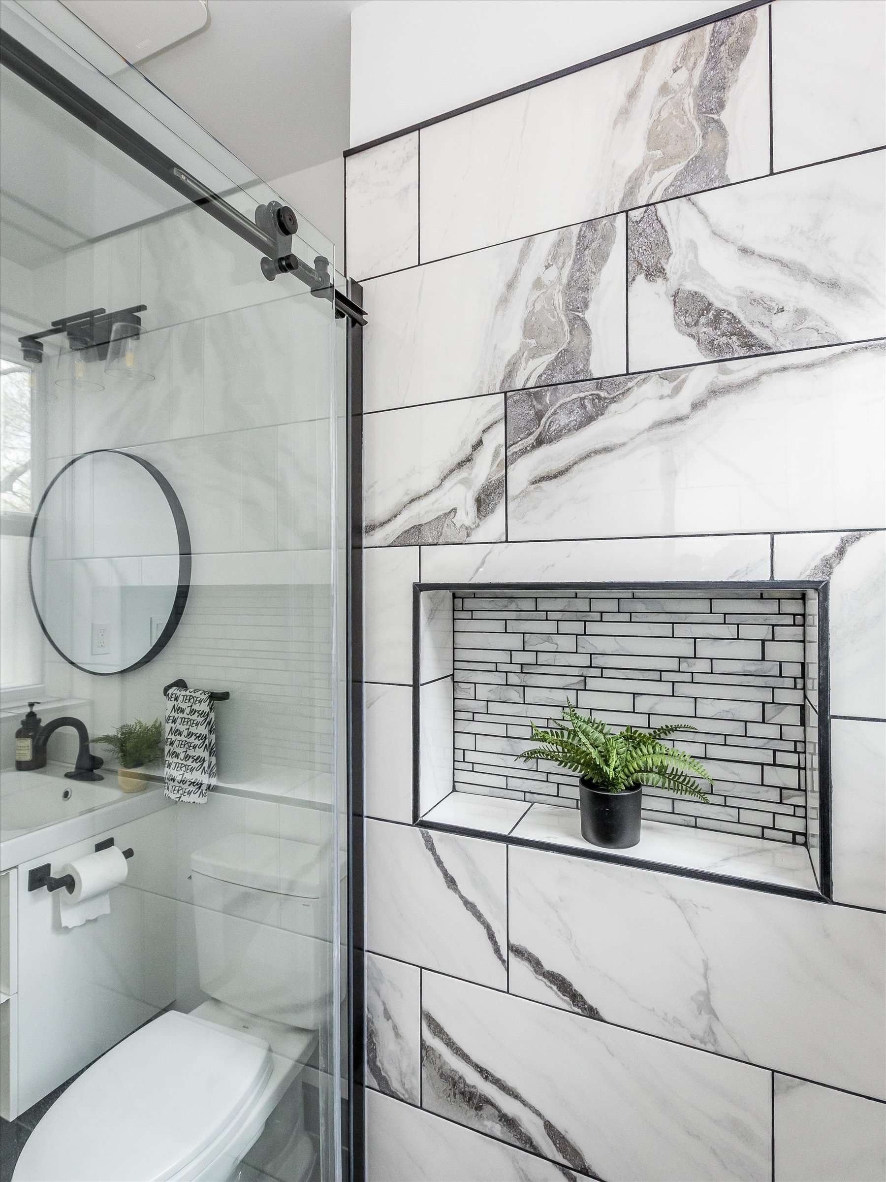 The bathroom really became a place to go to relax and pamper – the spacious infinity shower with mosaic-tiled floor and high flow shower head. The floating cabinet giving the space a breathability and modern touch. The combination of recessed and vanity lighting to create a bright, happy energy.